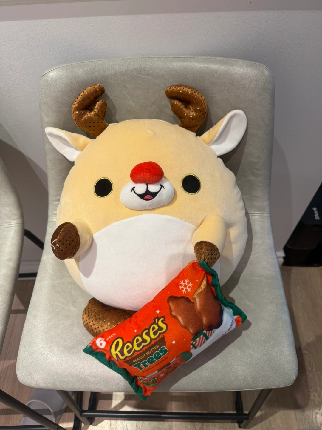 This adorable Squishmallow is designed to look like a reindeer holding a pack of Reese's Peanut Butter Trees! It's super soft and huggable, perfect for cuddling or as a cute decoration