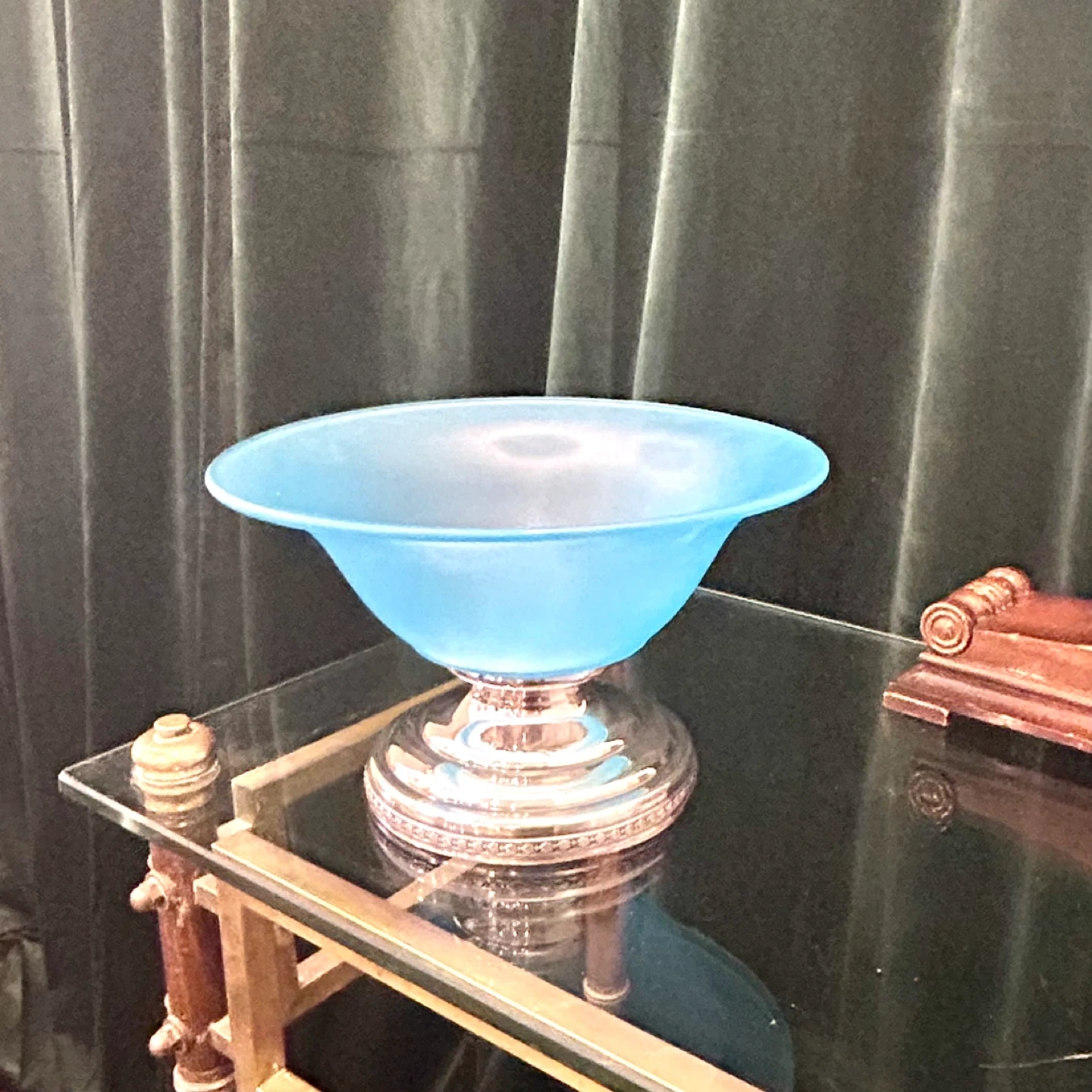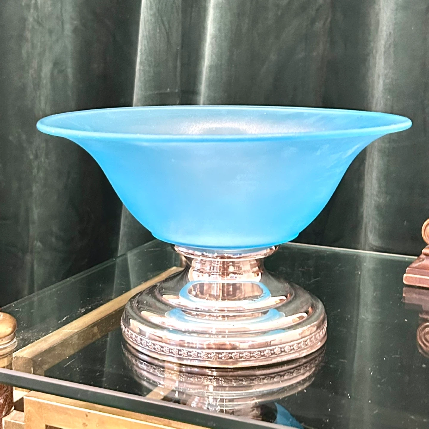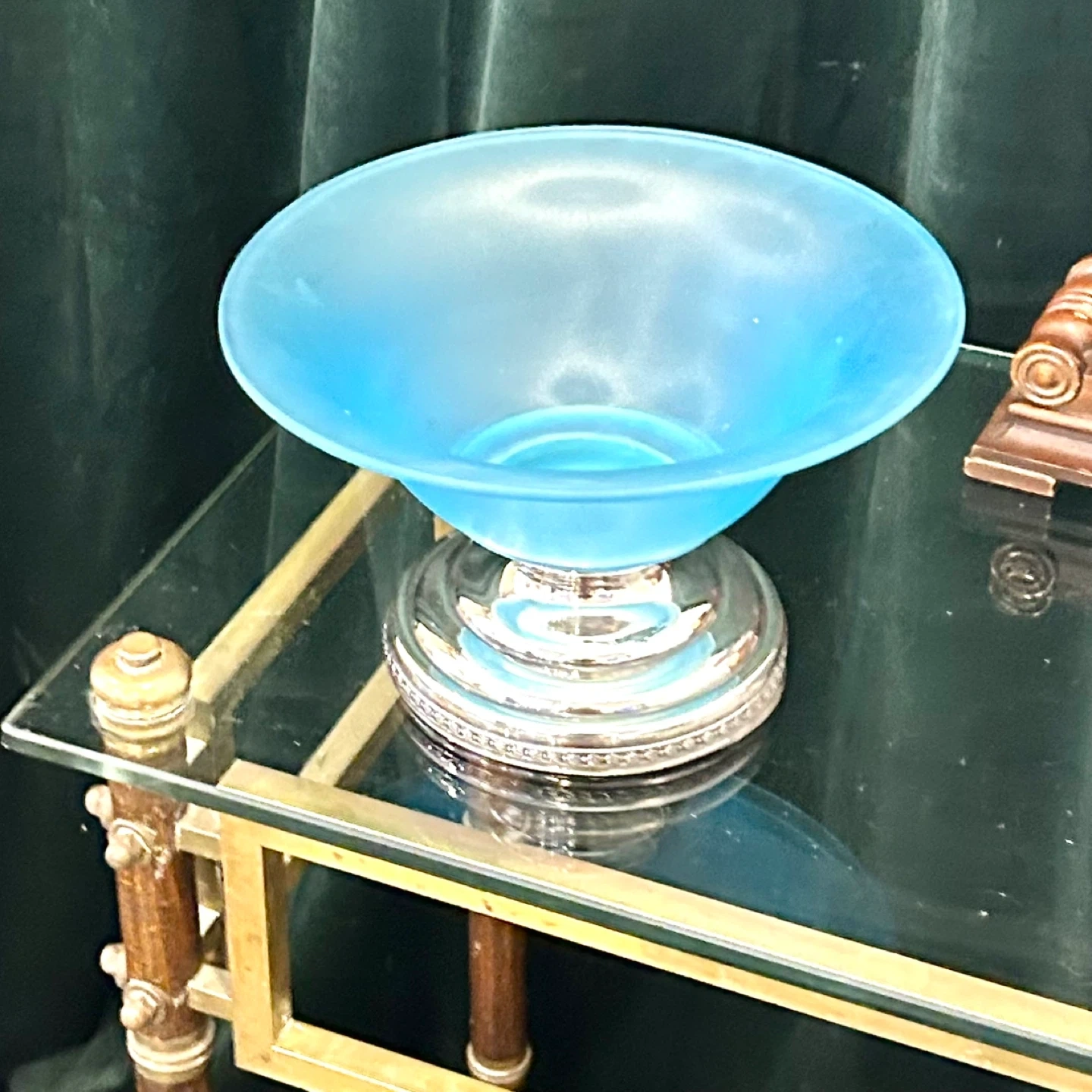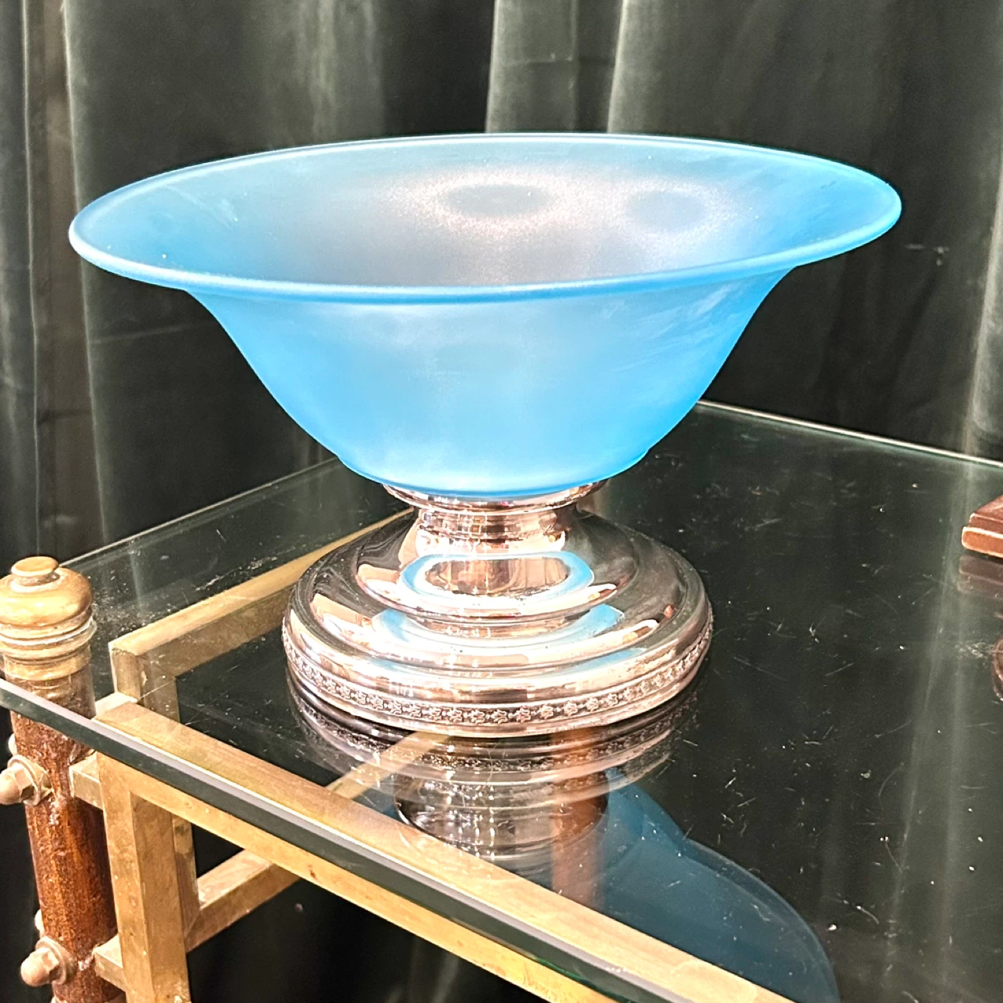 Authentic Art Deco blue satin glass compote, dating to the late 1920s–1930s, mounted on a substantial EPNS silver-plated pedestal base, and retaining its original period construction.