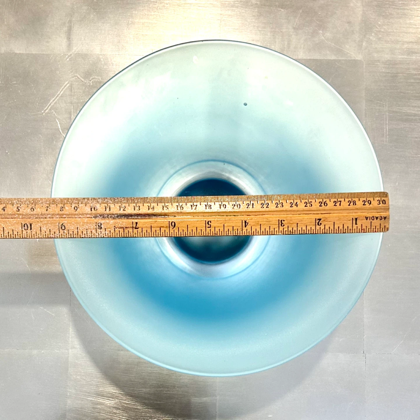The bowl is formed in translucent blue satin (acid-etched) glass, prized for its soft matte glow and elegant light diffusion. The wide flared rim and shallow profile are classic Art Deco design elements, emphasizing symmetry, balance, and refined luxury.