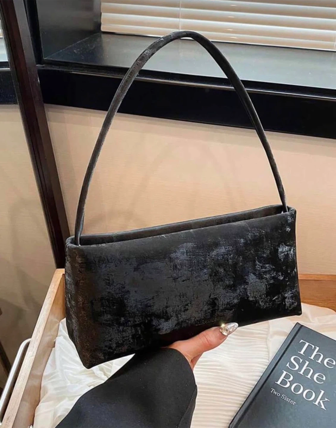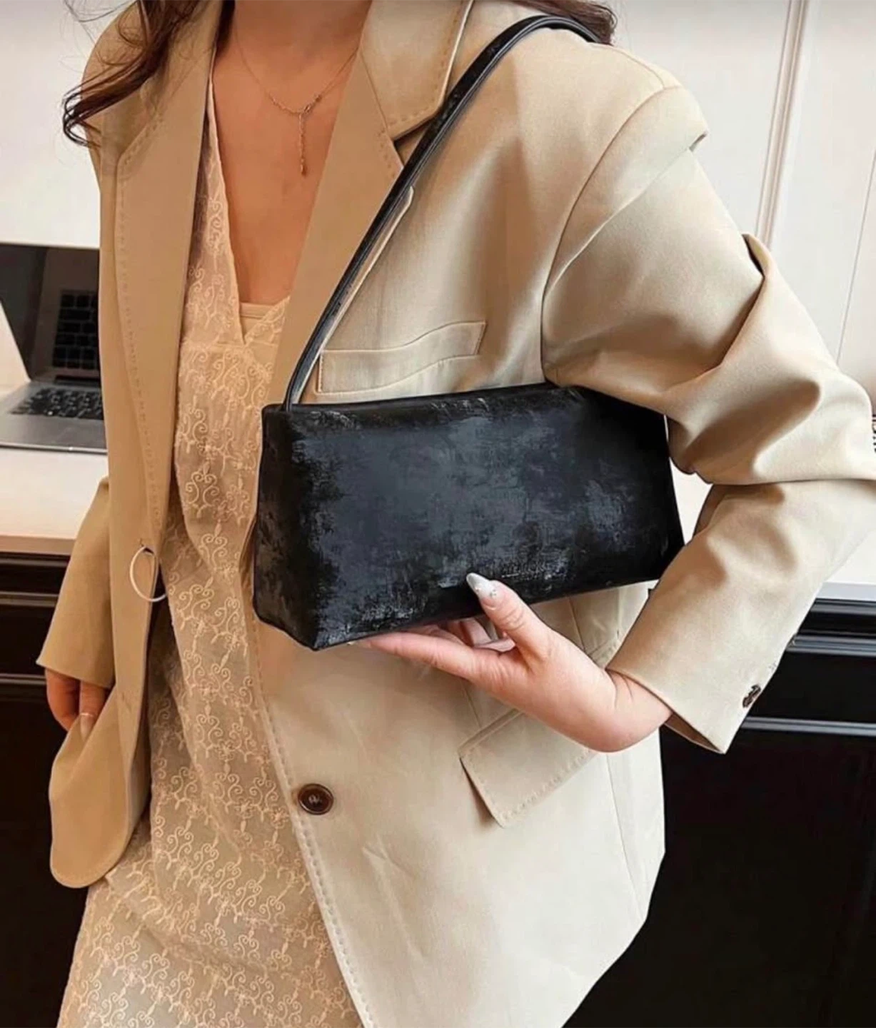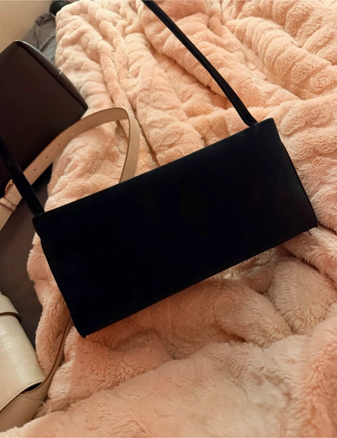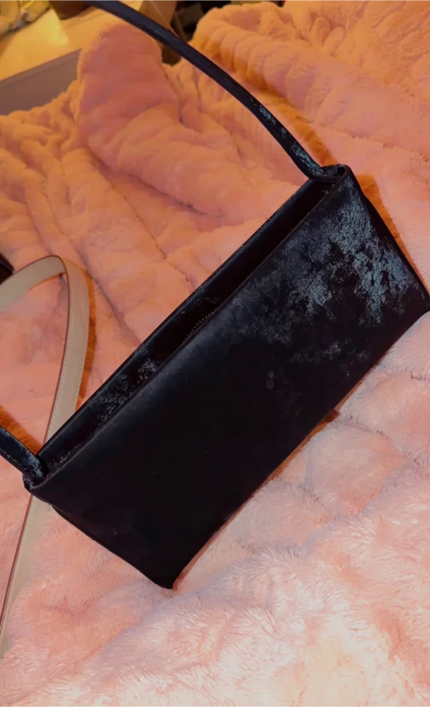 Selling a cute black velvet shoulder bag! It's in great condition and perfect for adding a touch of elegance to any outfit. The bag has a zipper closure and a tan interior.