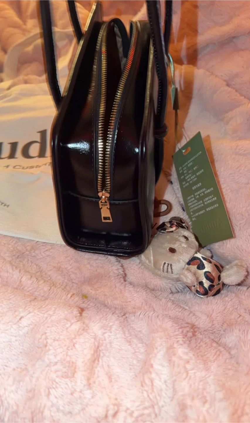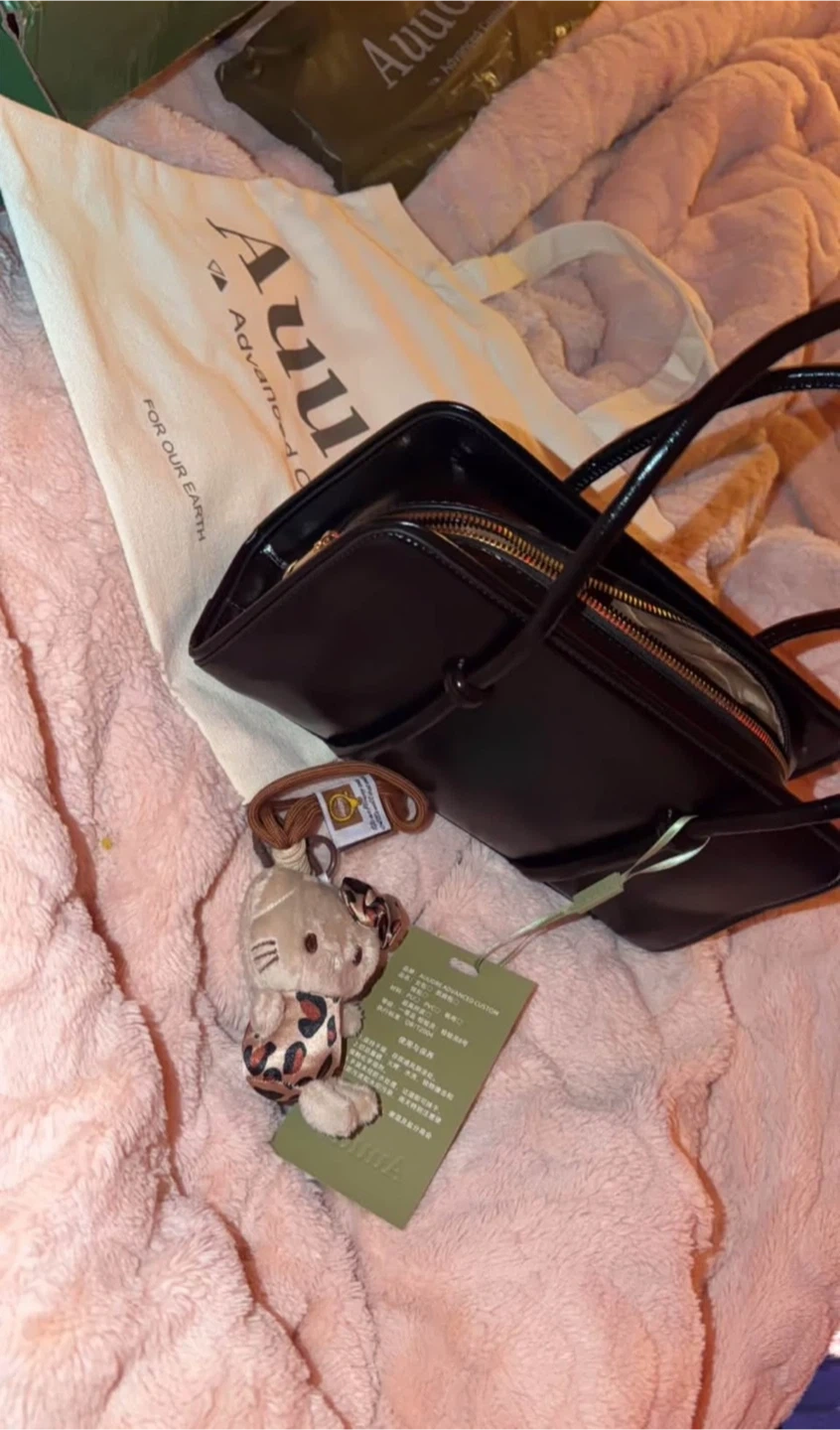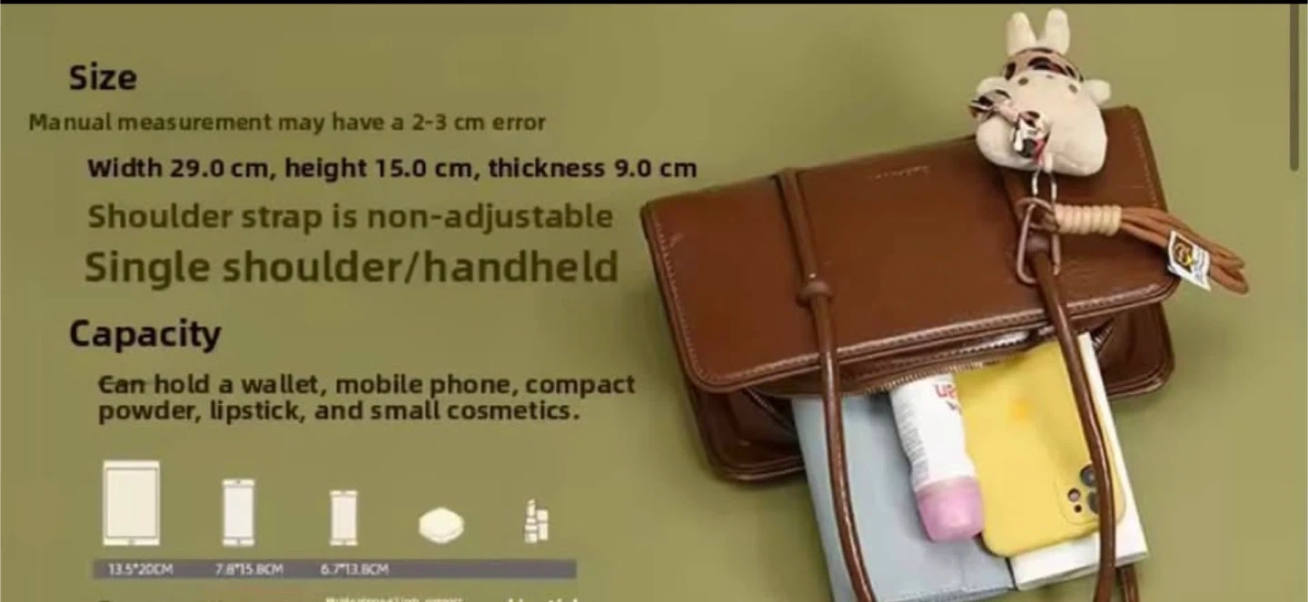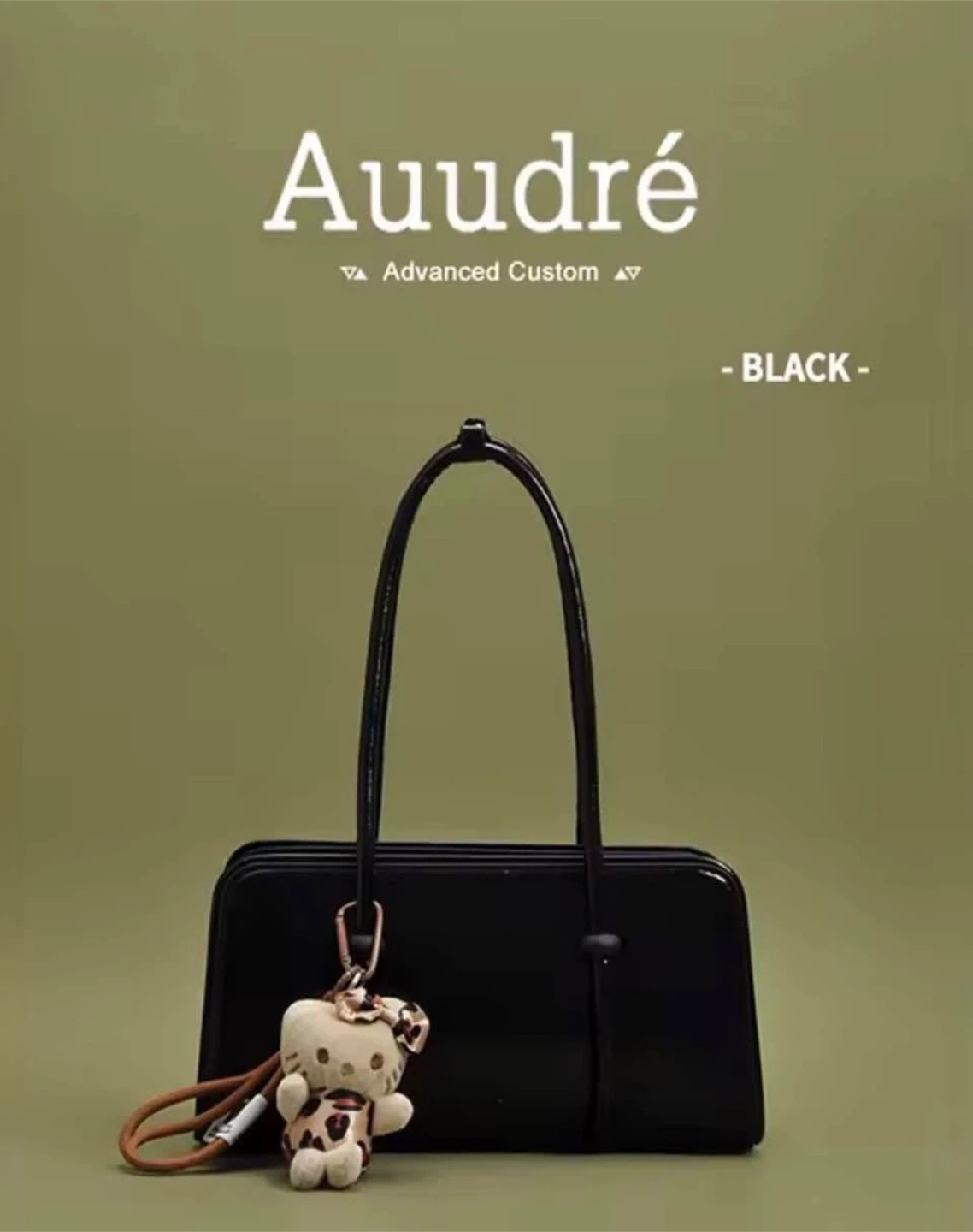 This Auuudré handheld bag is in black and is perfect for carrying your wallet, mobile phone, compact powder, lipstick, and small cosmetics! The dimensions are approximately 29.0 cm in width, 15.0 cm in height, and 9.0 cm in thickness