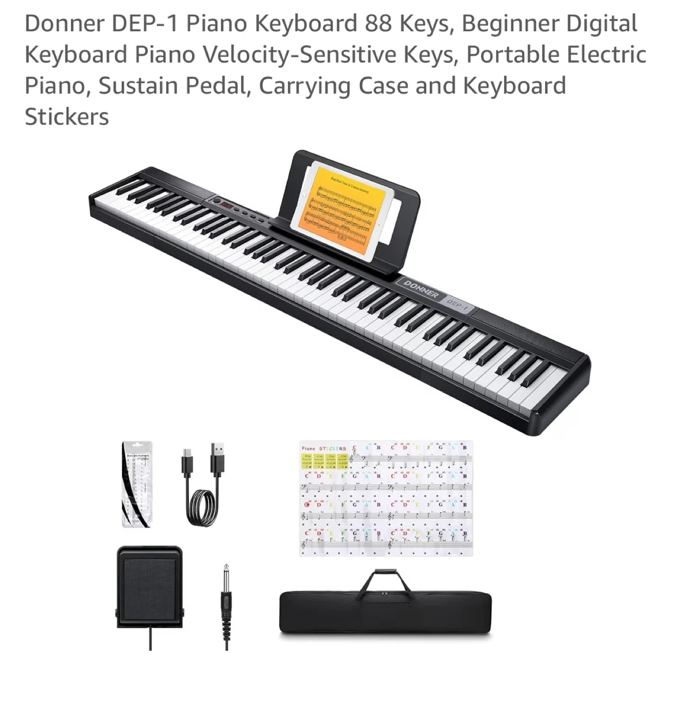 Selling a Donner DEP-1 digital piano keyboard with 88 keys. It's perfect for beginners with velocity-sensitive keys. It's also portable, so you can take it anywhere! Comes with a sustain pedal, carrying case, and keyboard stickers