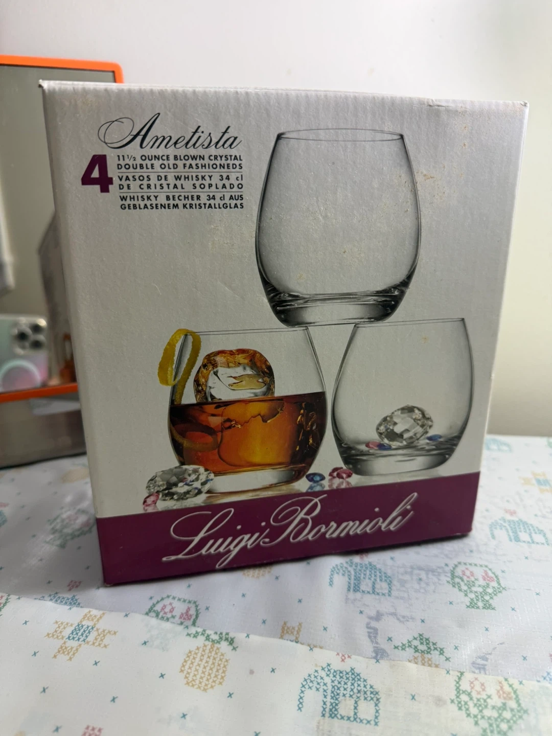 Selling a set of 4 Luigi Bormioli Ametista 11 1/2 ounce blown crystal double old fashioned whiskey glasses! These are perfect for enjoying your favourite drinks in style