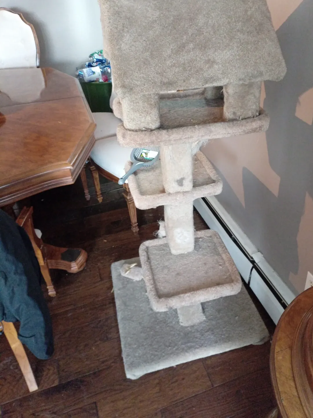 Selling a used cat tree with multiple levels. It's perfect for your feline friend to climb, play, and relax. It has a few scratches, but it's still in good condition and ready for a new home