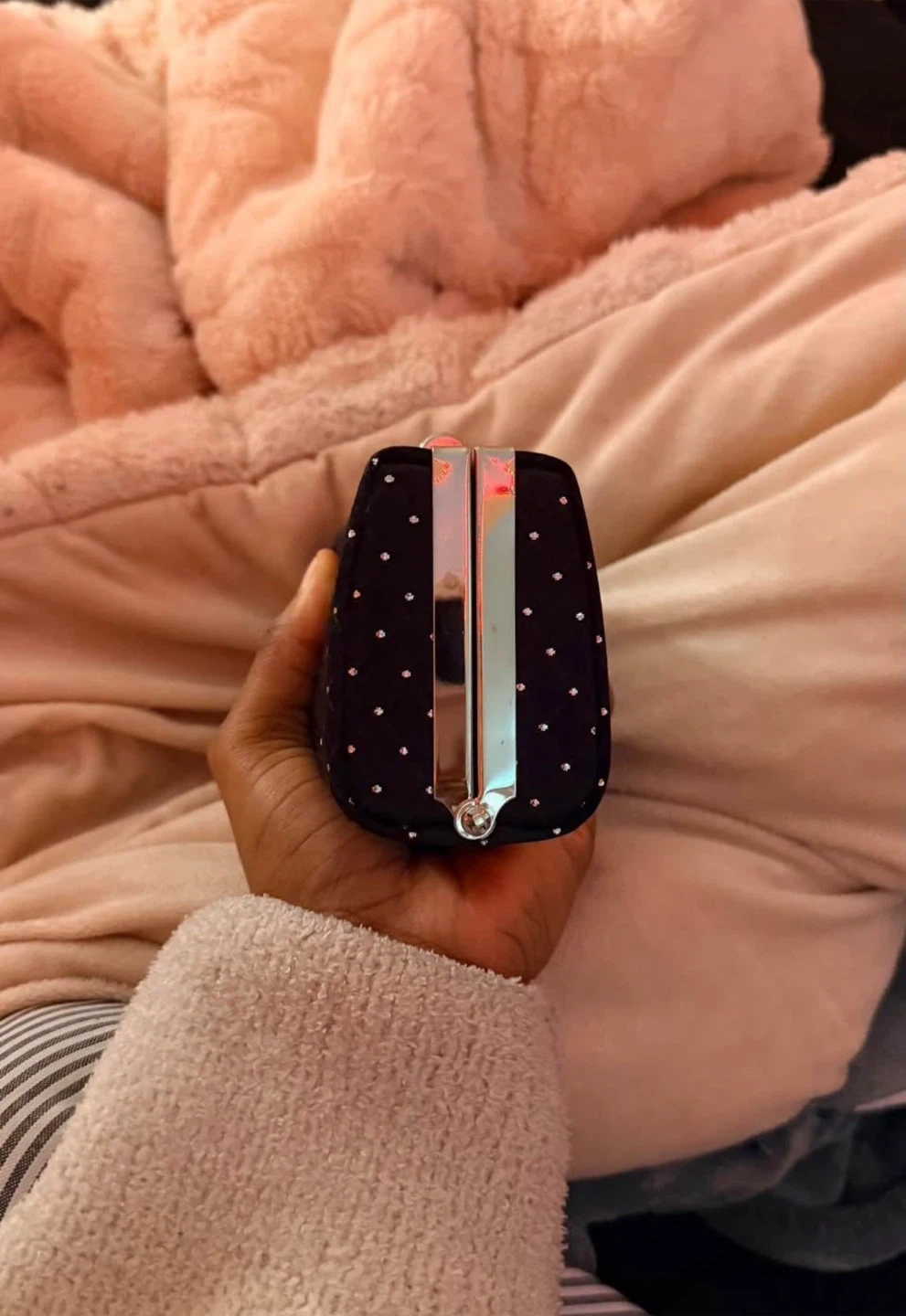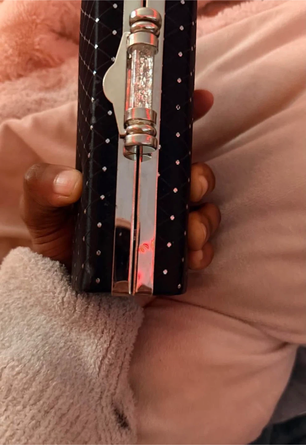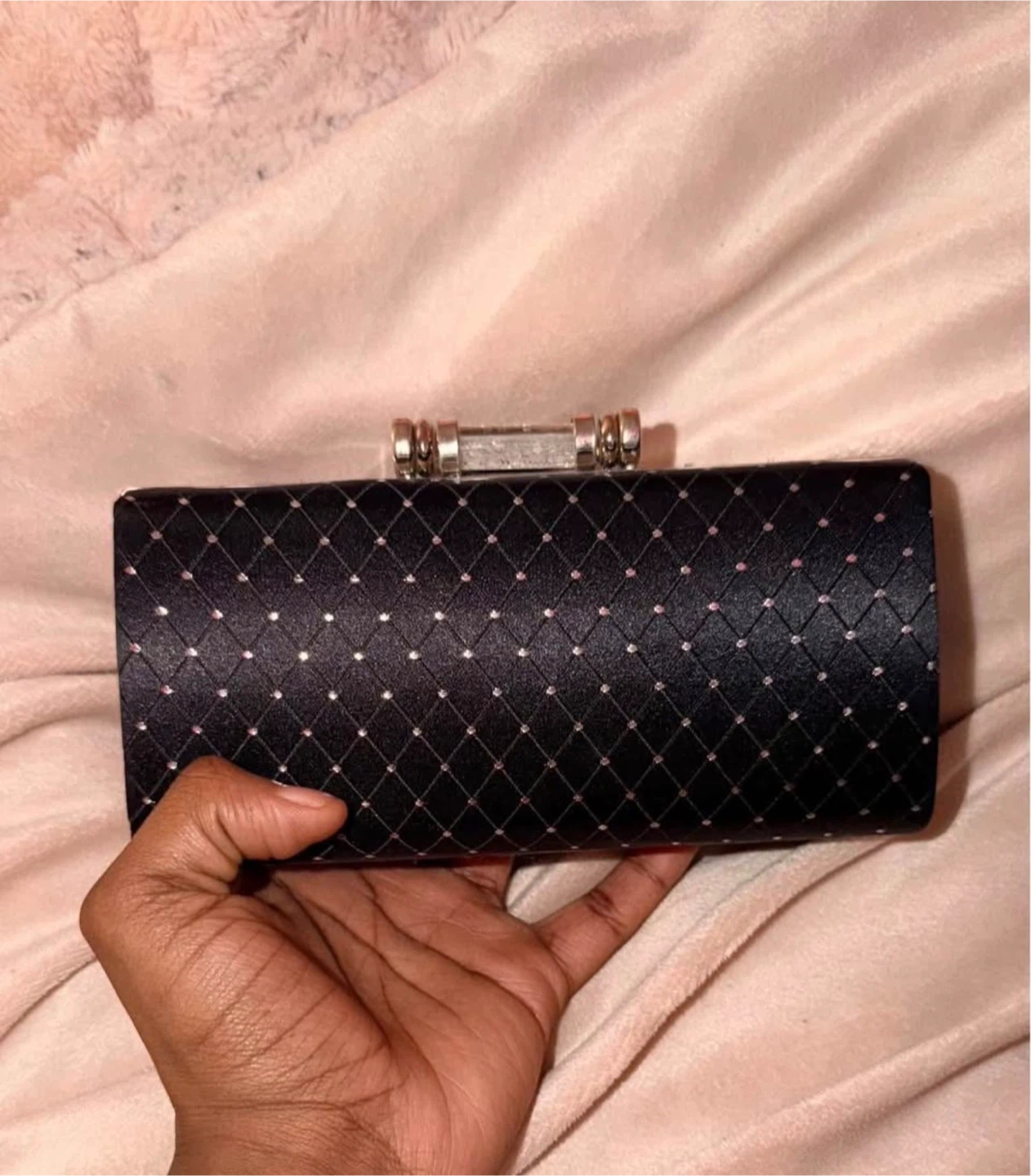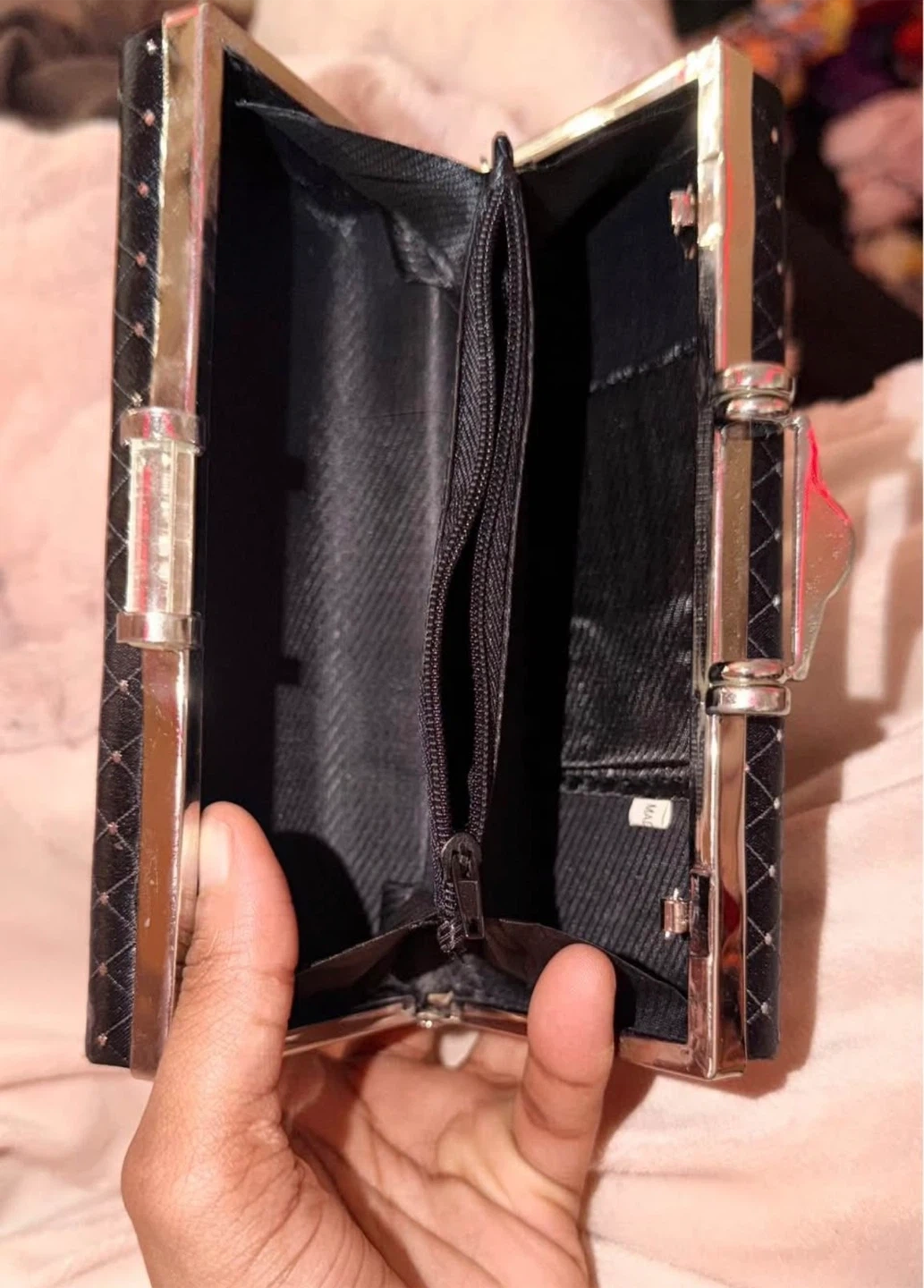 This is a stylish black clutch purse with silver embellishments. It's perfect for evenings out or special occasions. It has a unique clasp and a compact design to hold your essentials