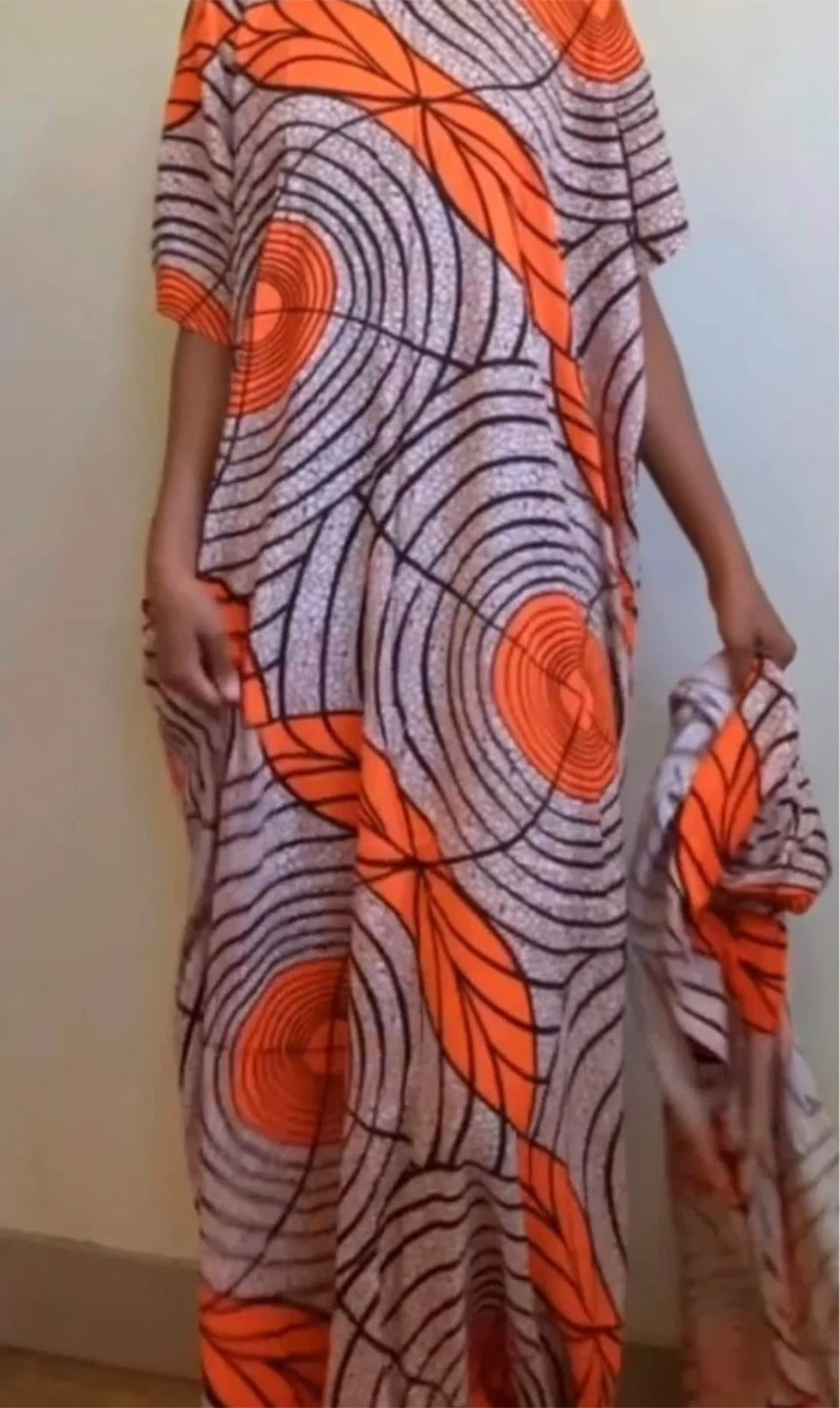 Here's a beautiful maxi Dera Swahili dress featuring an eye-catching orange and grey pattern! It's perfect for adding a pop of colour to your wardrobe and is great for a variety of occasions. The dress appears to be in good condition and includes a matching scarf or shawl to complete the look of you want to wrap your head as well