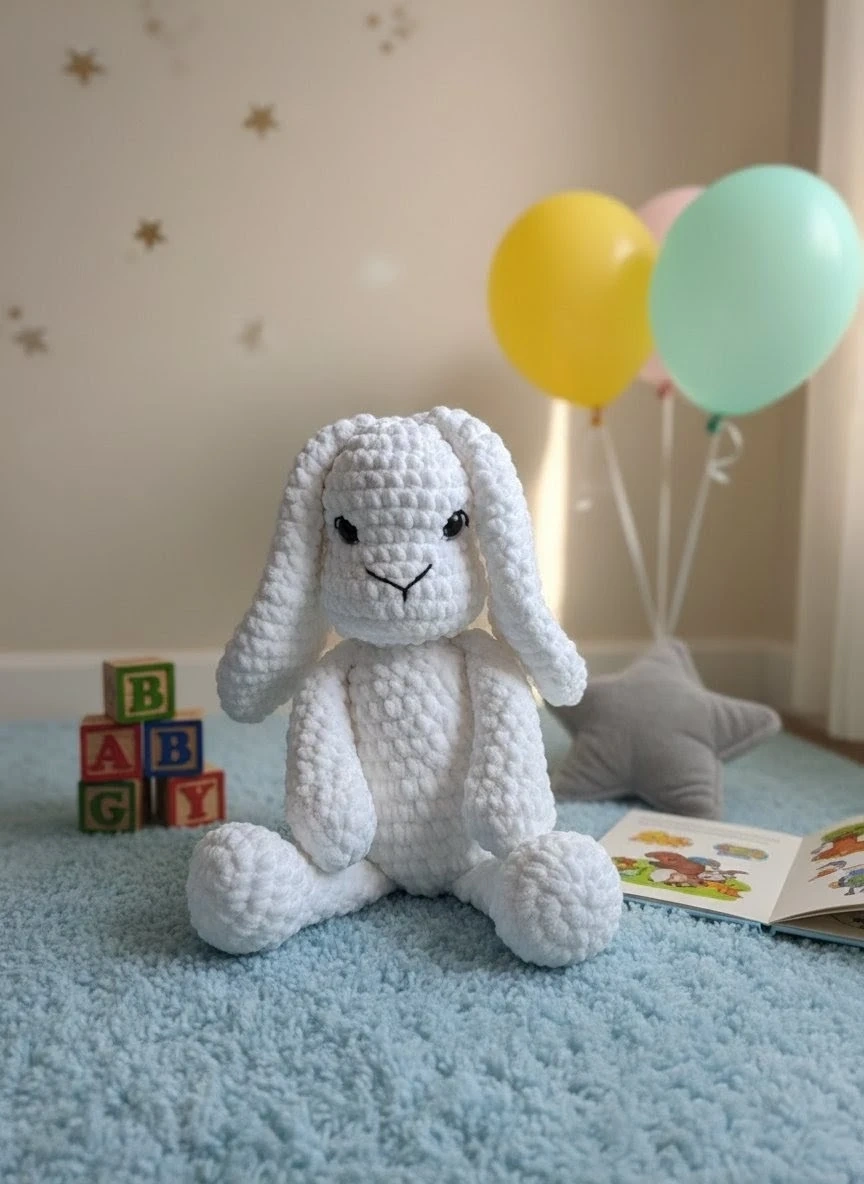 A cute, handmade crochet bunny plushie! Perfect for a nursery or as a cuddly friend for a little one. It's in great condition and ready for a new home