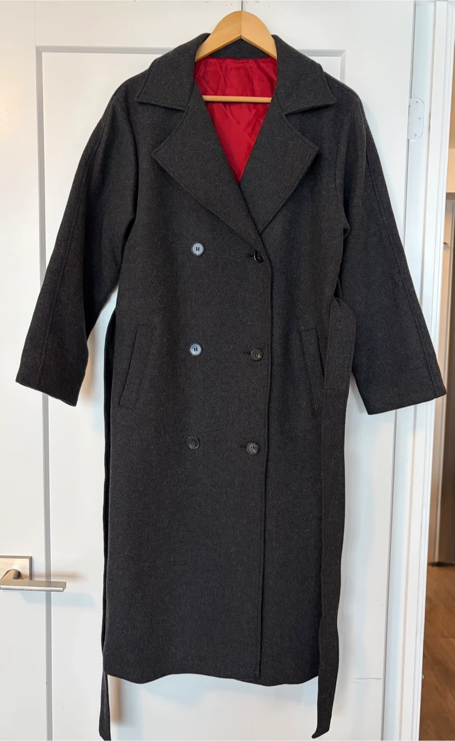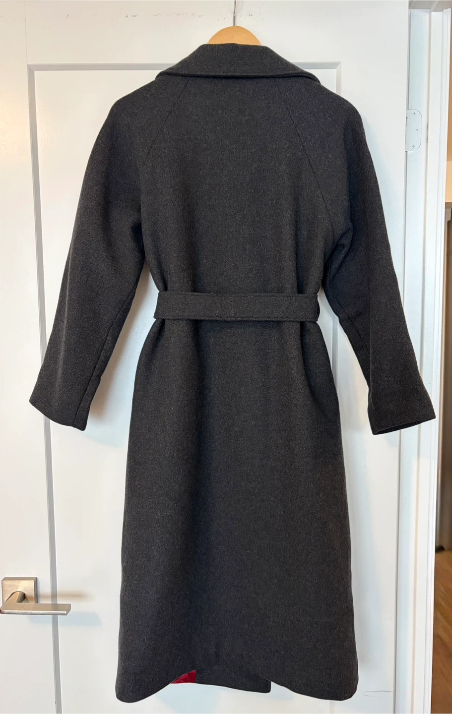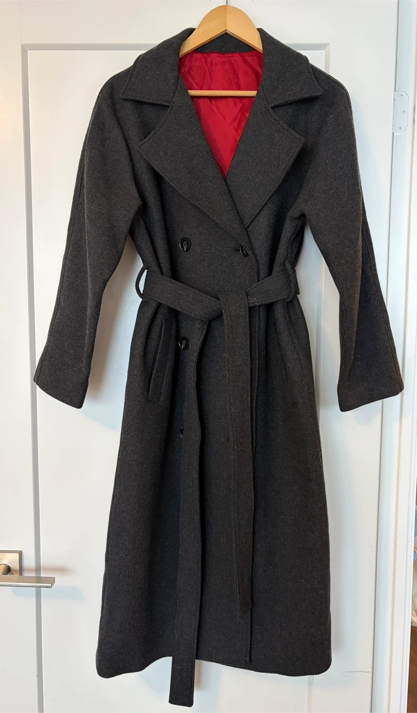 Elegant and timeless, this gray wool-blend straight-fit coat (70% wool, 30% polyamide) features a flattering belted waist and classic long silhouette—perfect for fall and winter. Labels removed.