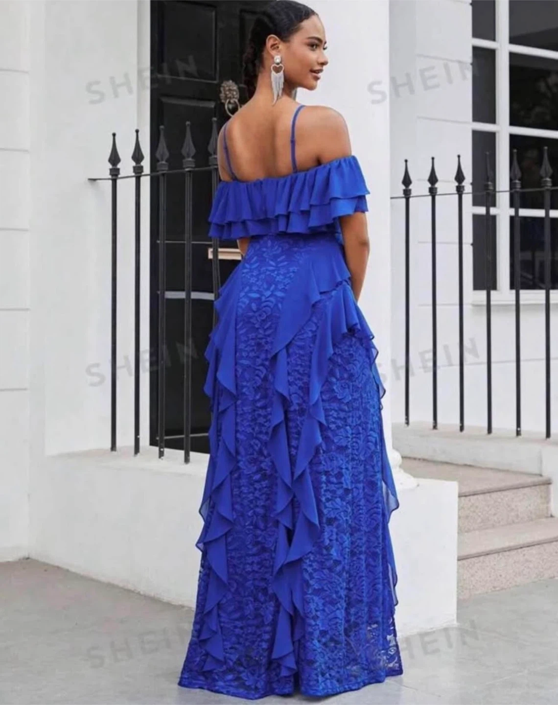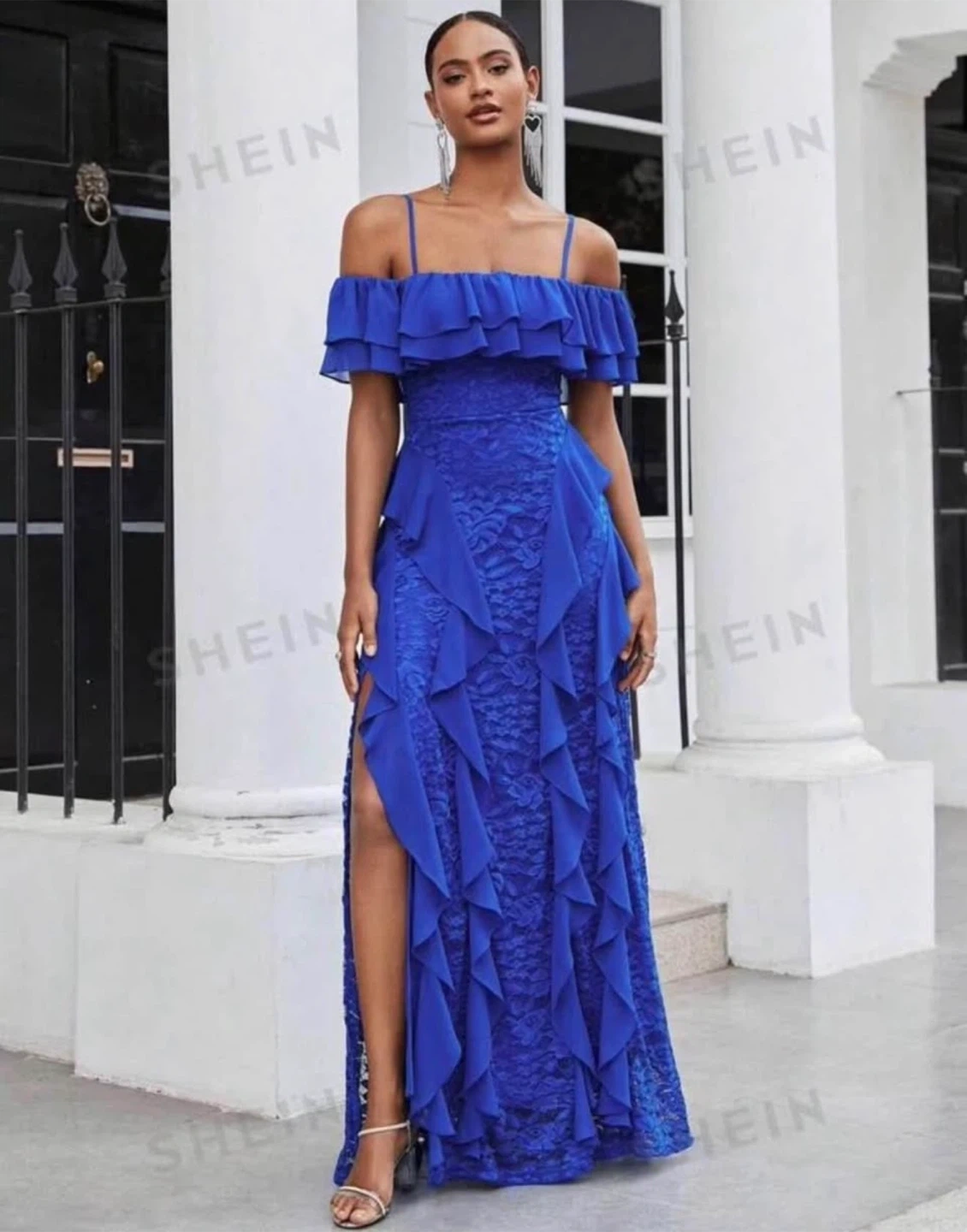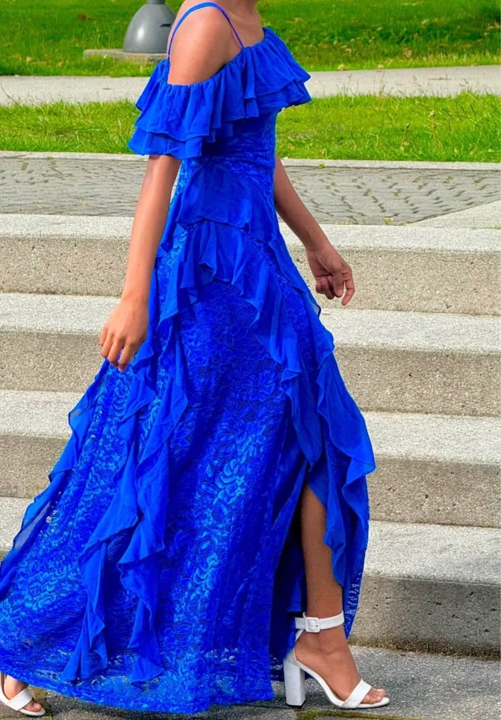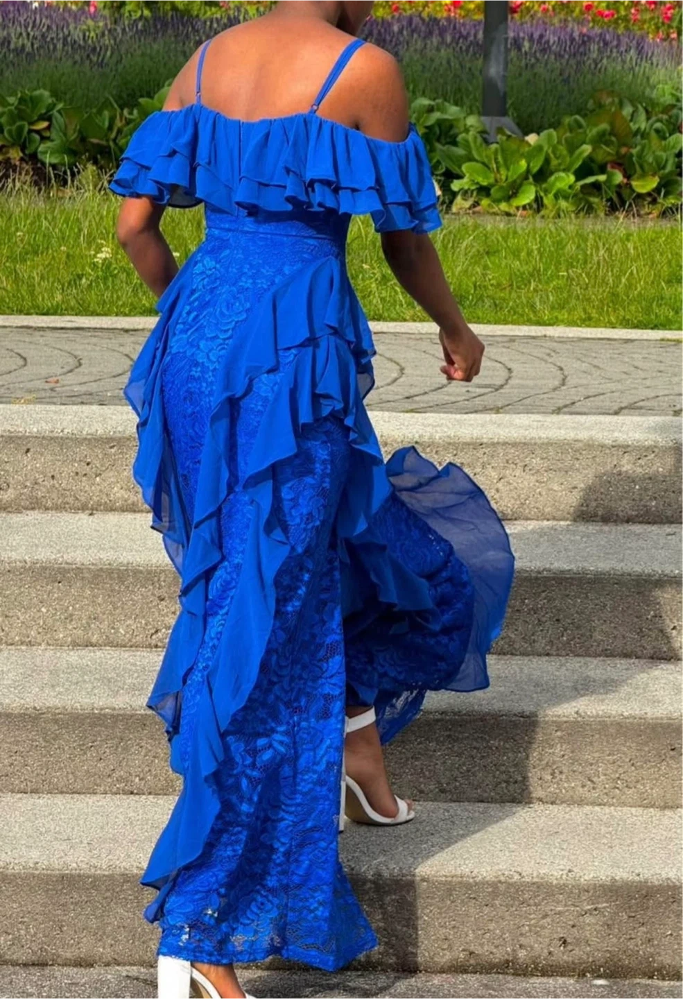 Heavy fabric Selling a beautiful blue ruffle maxi dress from Shein. It's perfect for a special occasion or a night out. The dress features a flattering off-the-shoulder design and a flowy skirt with a slit.