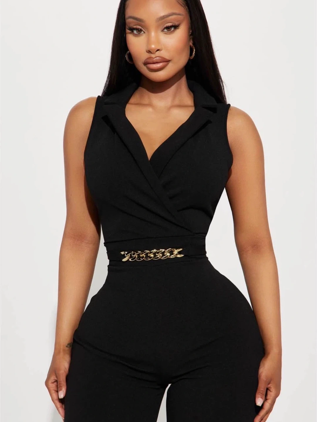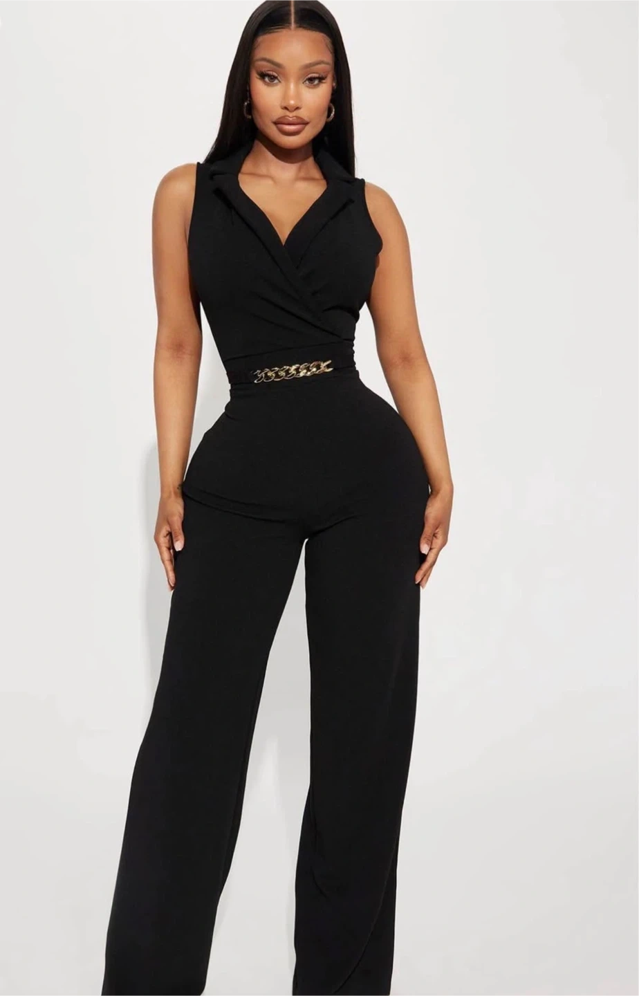 A stylish black jumpsuit featuring a flattering wrap-style top and wide-leg pants. It comes with a chic gold chain belt to cinch the waist and add a touch of glamour. Perfect for a night out or a special occasion