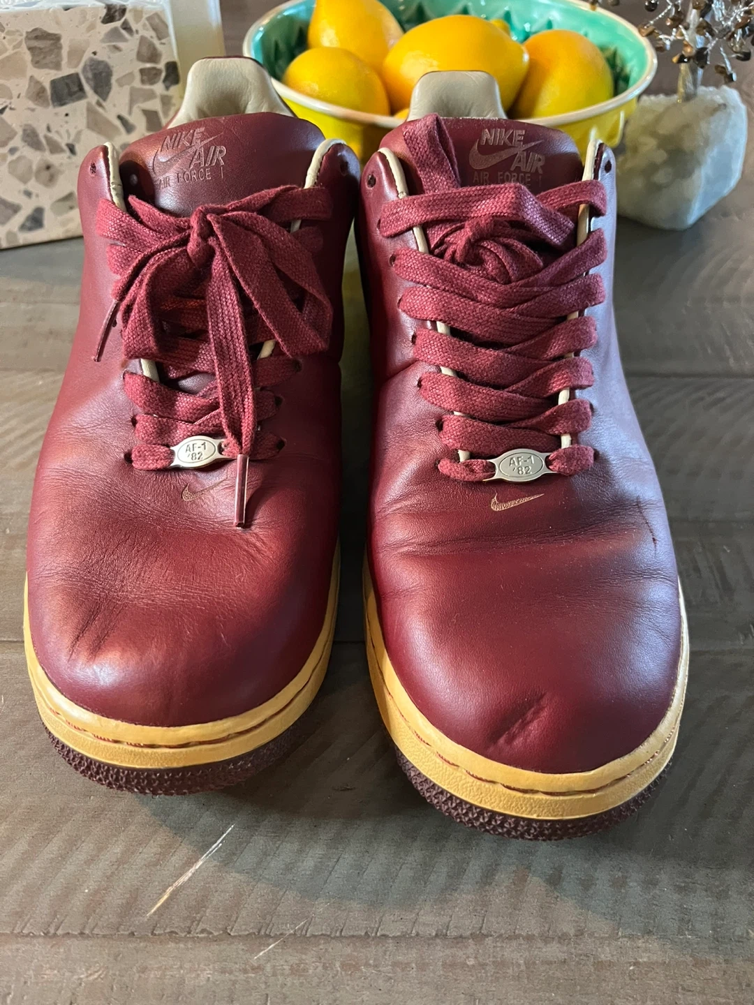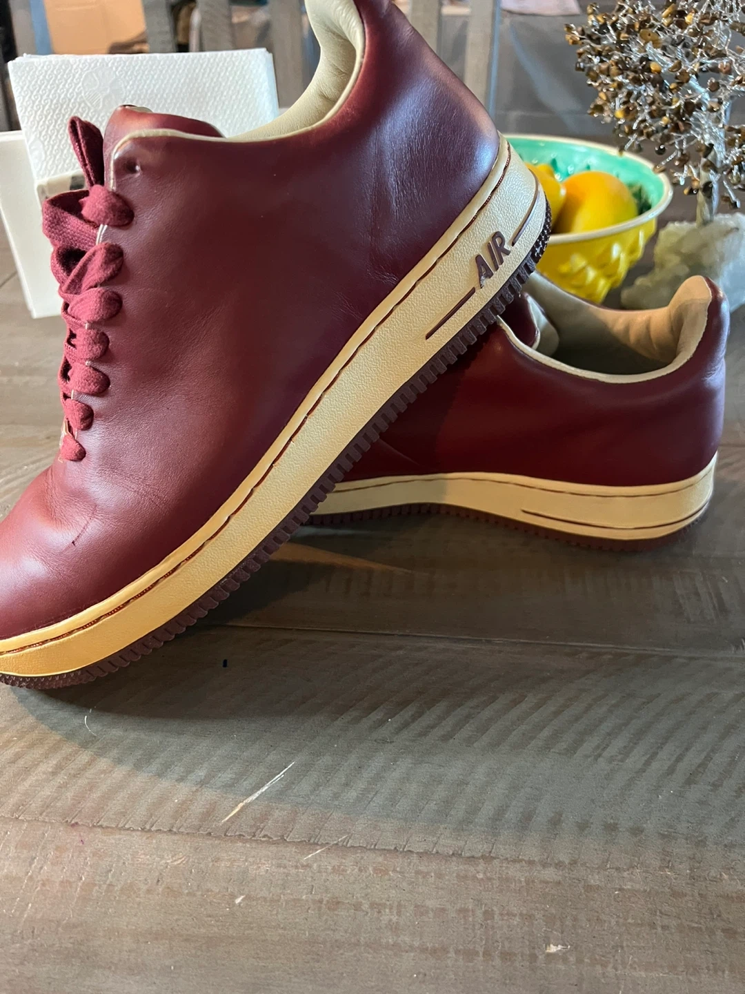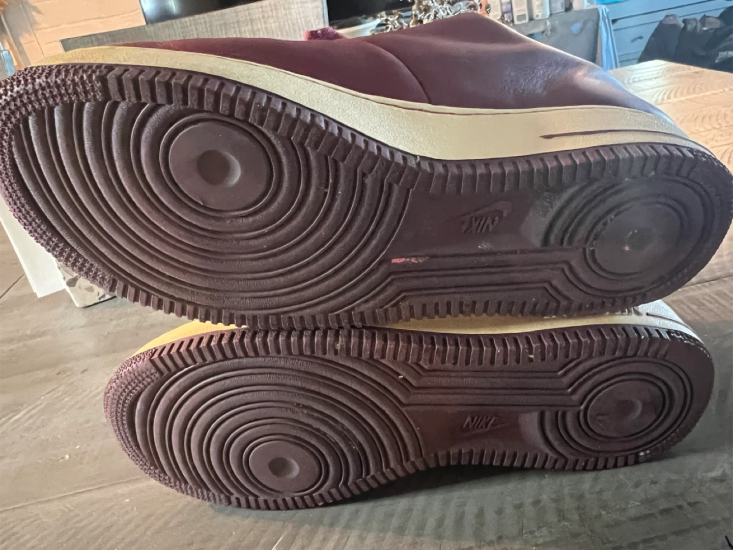 Selling a pair of Nike Air Force 1 sneakers in a burgundy color. They have a classic look with the 'AIR' logo on the side. Please note there are some signs of wear, as seen in the photos
