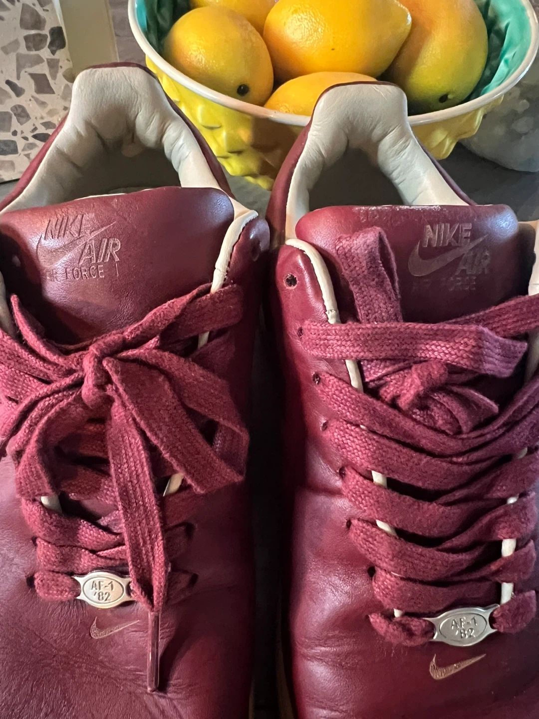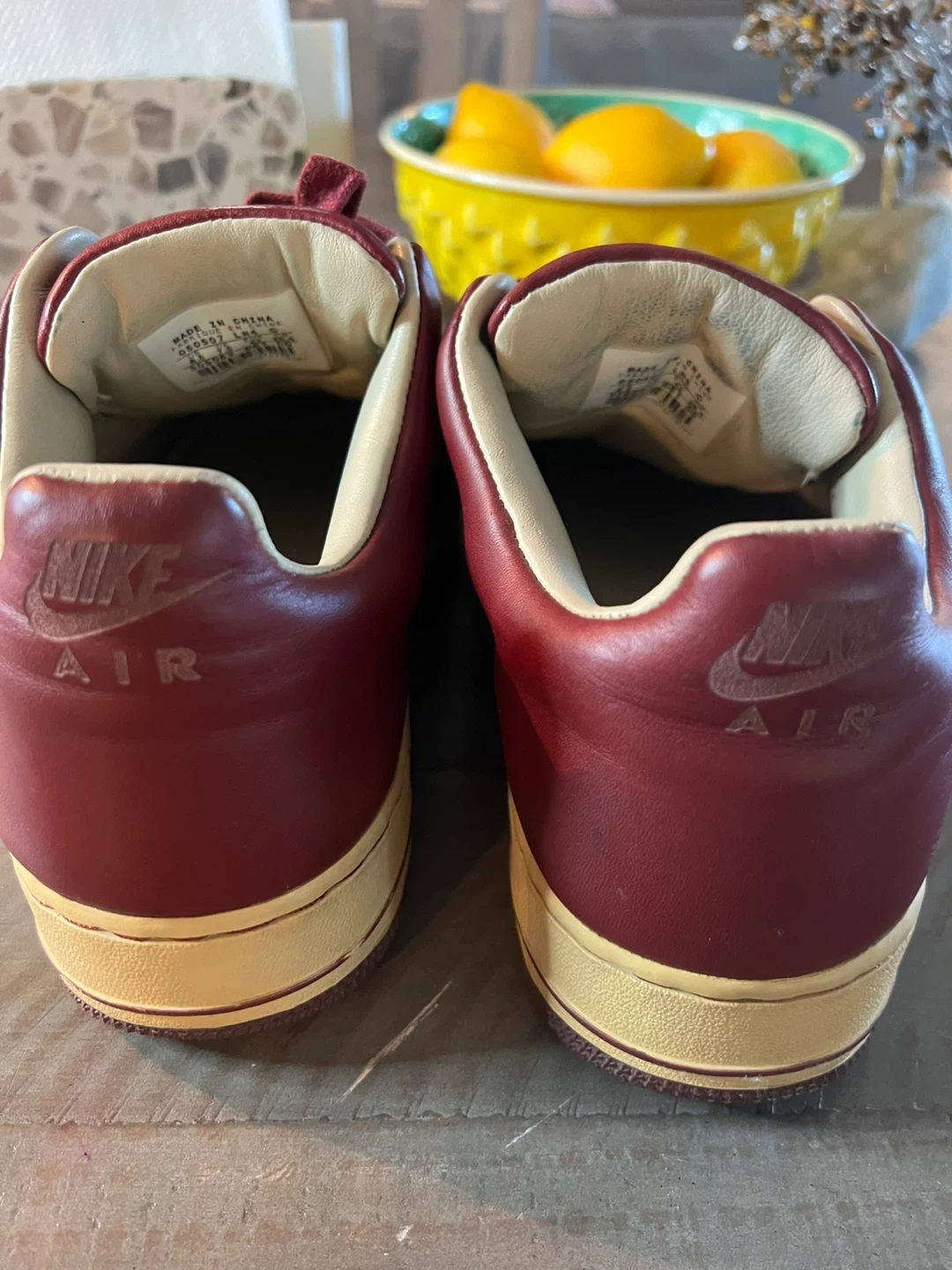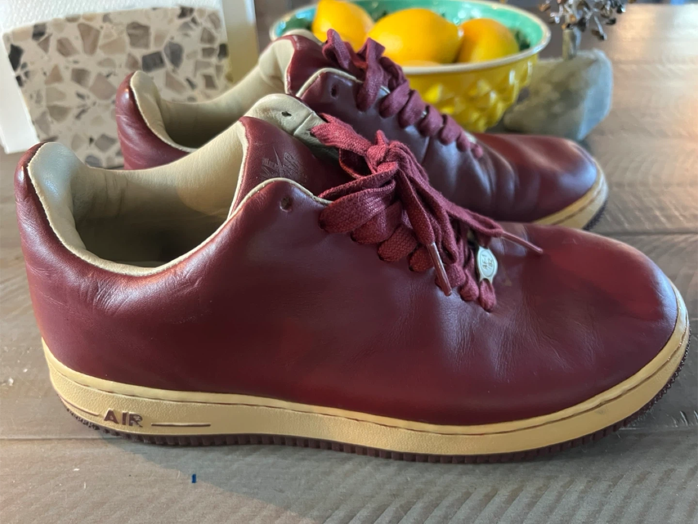 Selling a pair of Nike Air Force 1 sneakers in a burgundy color. They have a classic look with the 'AIR' logo on the side. Please note there are some signs of wear, as seen in the photos