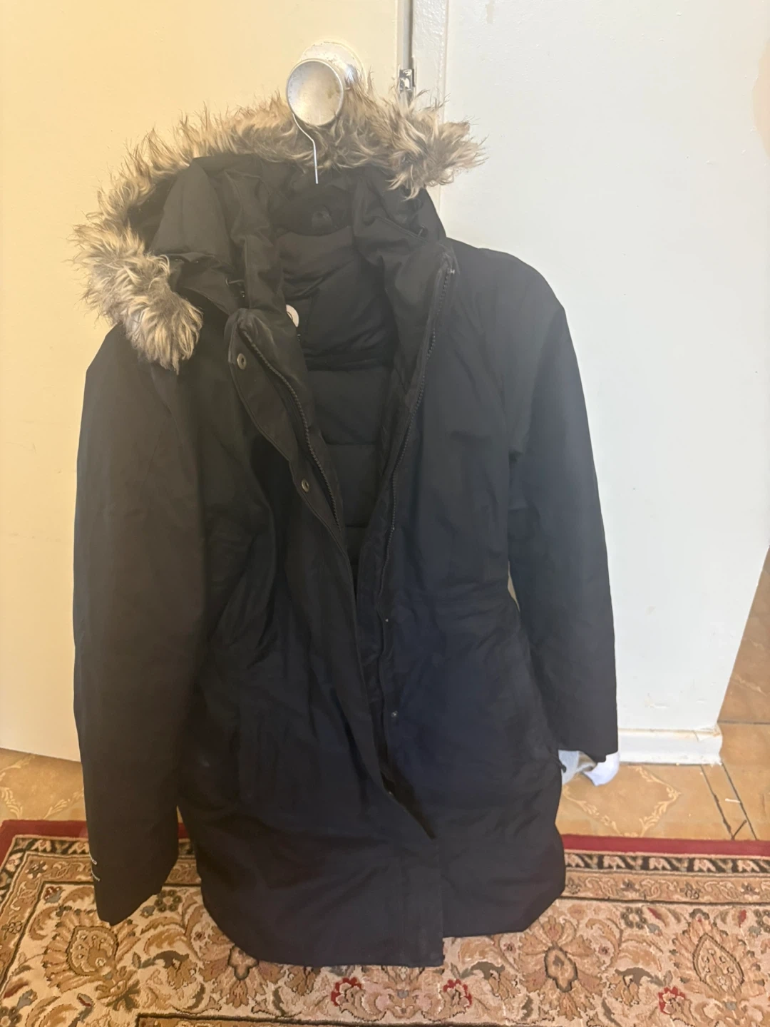 Selling a black The North Face parka in size small. It's in great condition and ready to keep you warm this winter! Features a fur-trimmed hood and a 550 fill power for extra insulation