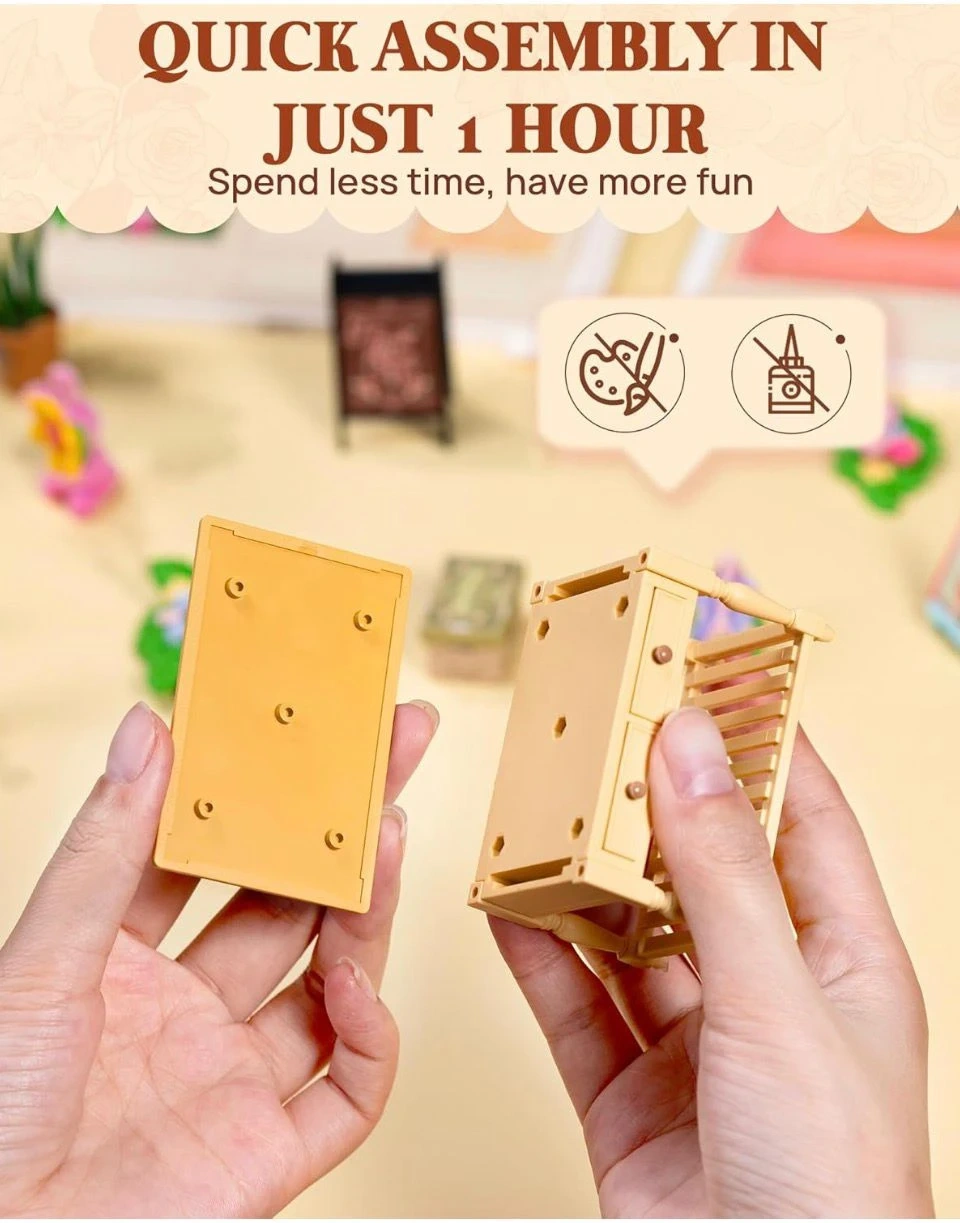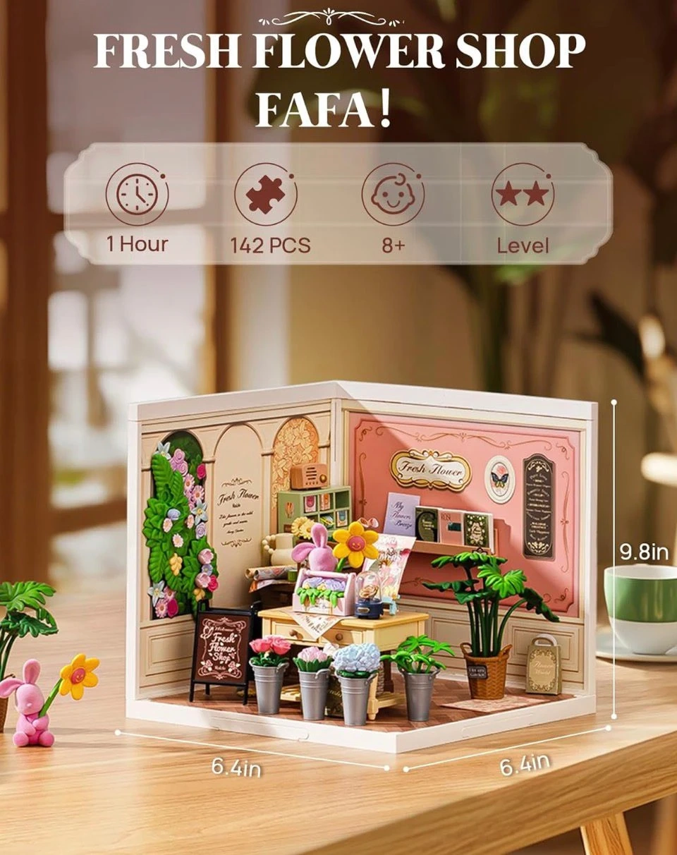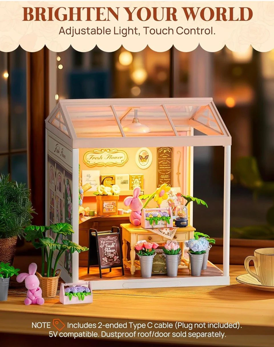Build your own miniature world with this charming DIY dollhouse kit! The Fresh Flower Shop is a delightful project that includes everything you need to create a detailed and adorable scene. Enjoy the relaxation, logical thinking, imagination, and creativity this kit offers. It features adjustable light with touch control and includes a 2-ended Type C cable. Assembly takes about 1 hour and includes 142 pieces. Note that the doll is not included