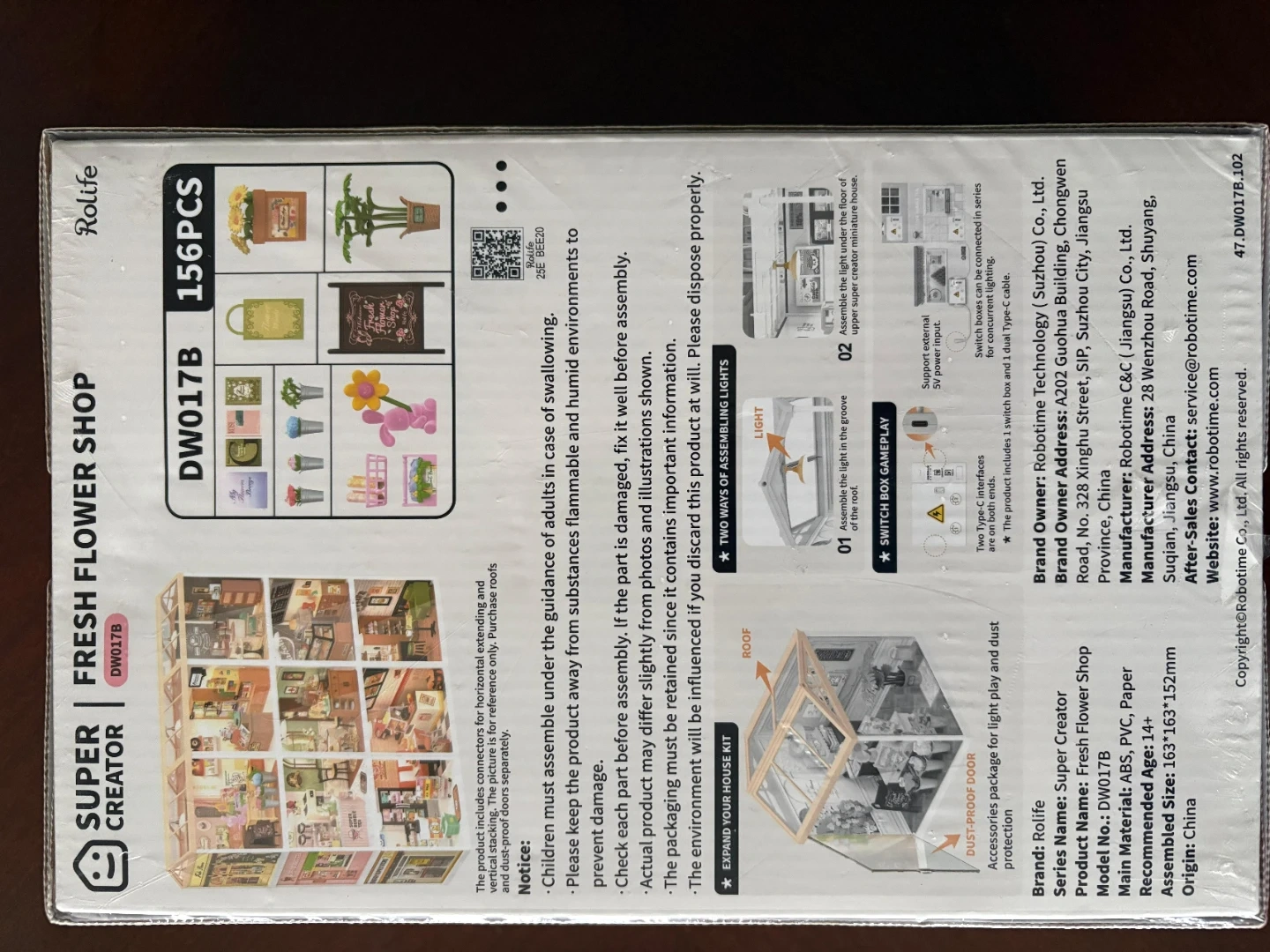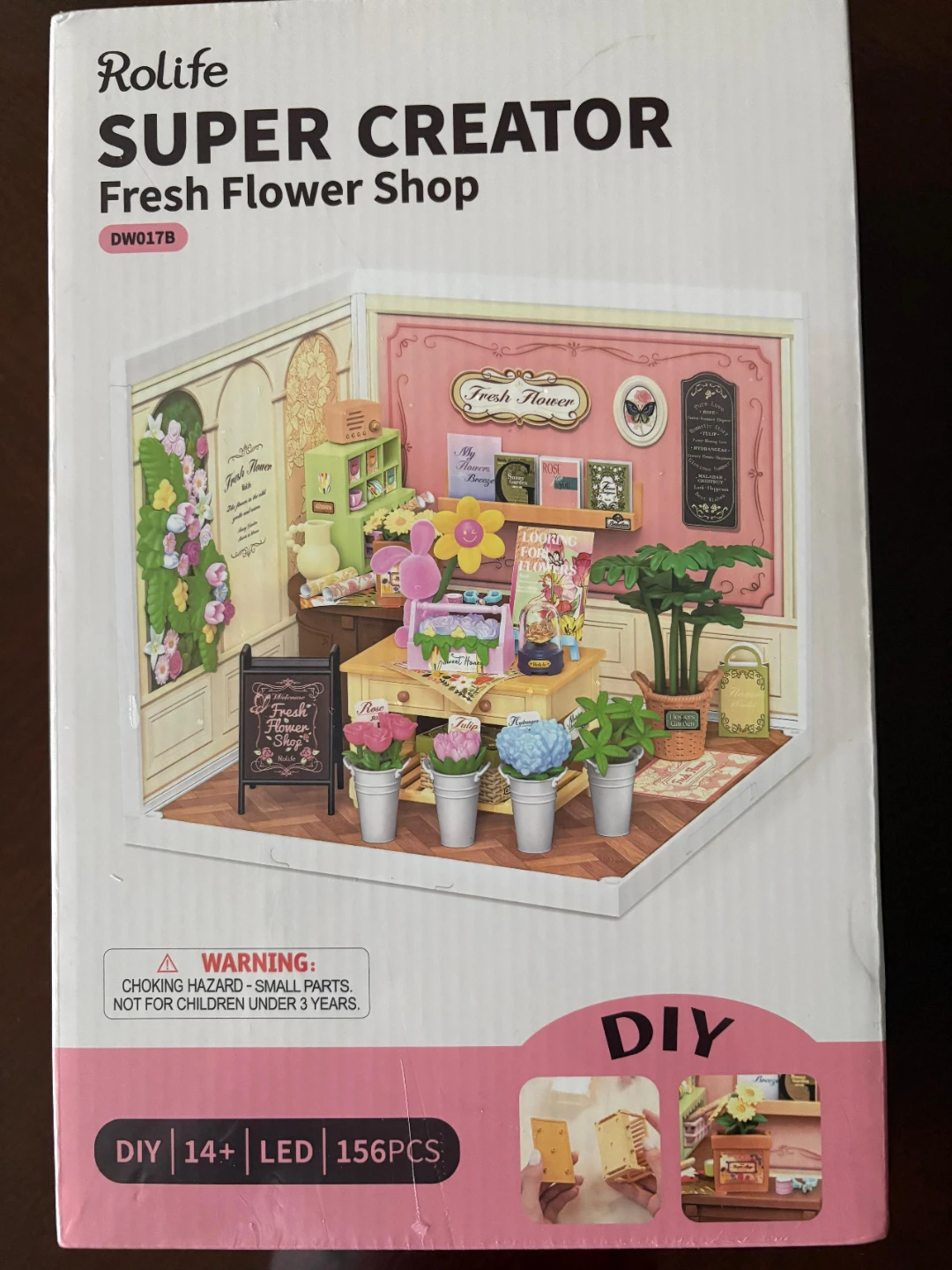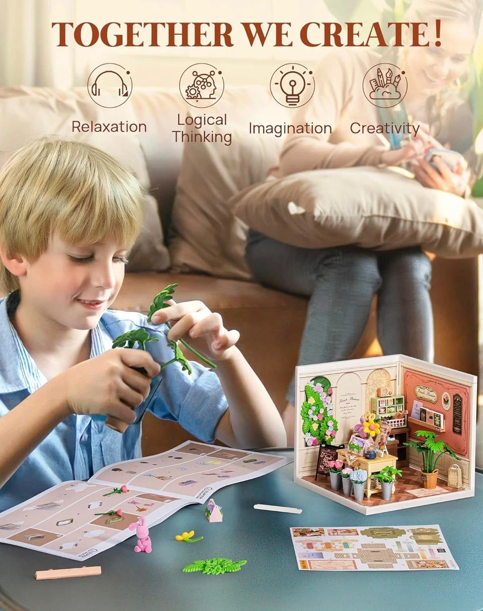 Build your own miniature world with this charming DIY dollhouse kit! The Fresh Flower Shop is a delightful project that includes everything you need to create a detailed and adorable scene. Enjoy the relaxation, logical thinking, imagination, and creativity this kit offers. It features adjustable light with touch control and includes a 2-ended Type C cable. Assembly takes about 1 hour and includes 142 pieces. Note that the doll is not included