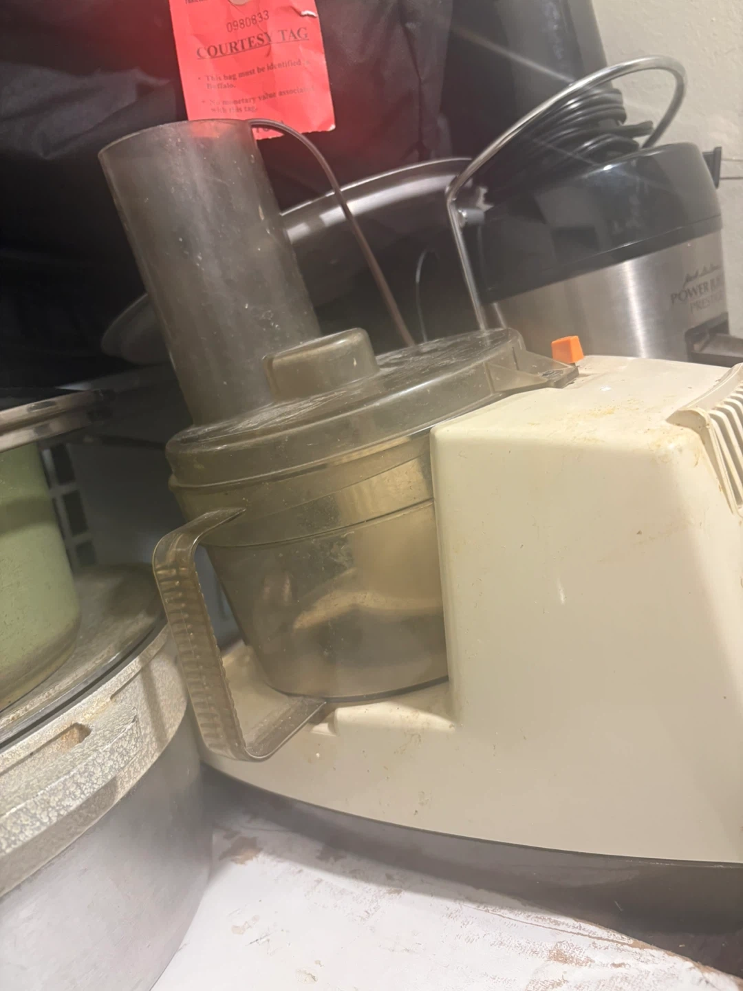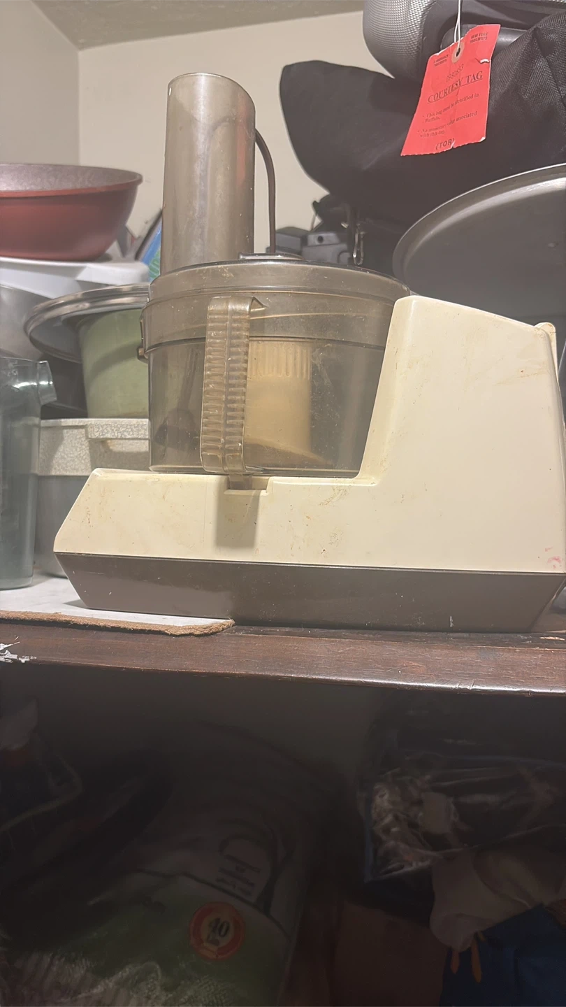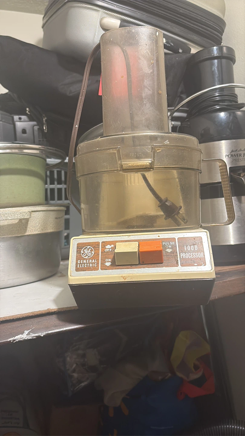 Selling a vintage General Electric food processor. It's a classic appliance that would be great for someone who appreciates retro kitchenware. It has a simple on/off switch and a pulse function. It's in used condition, but still functional.