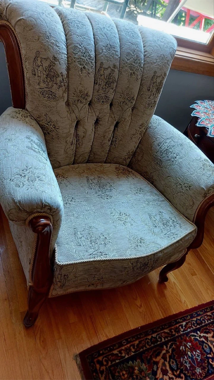 Selling two beautiful vintage armchairs and loveseat set. The set features a unique floral pattern and classic design. Perfect for adding a touch of elegance to your living room!
