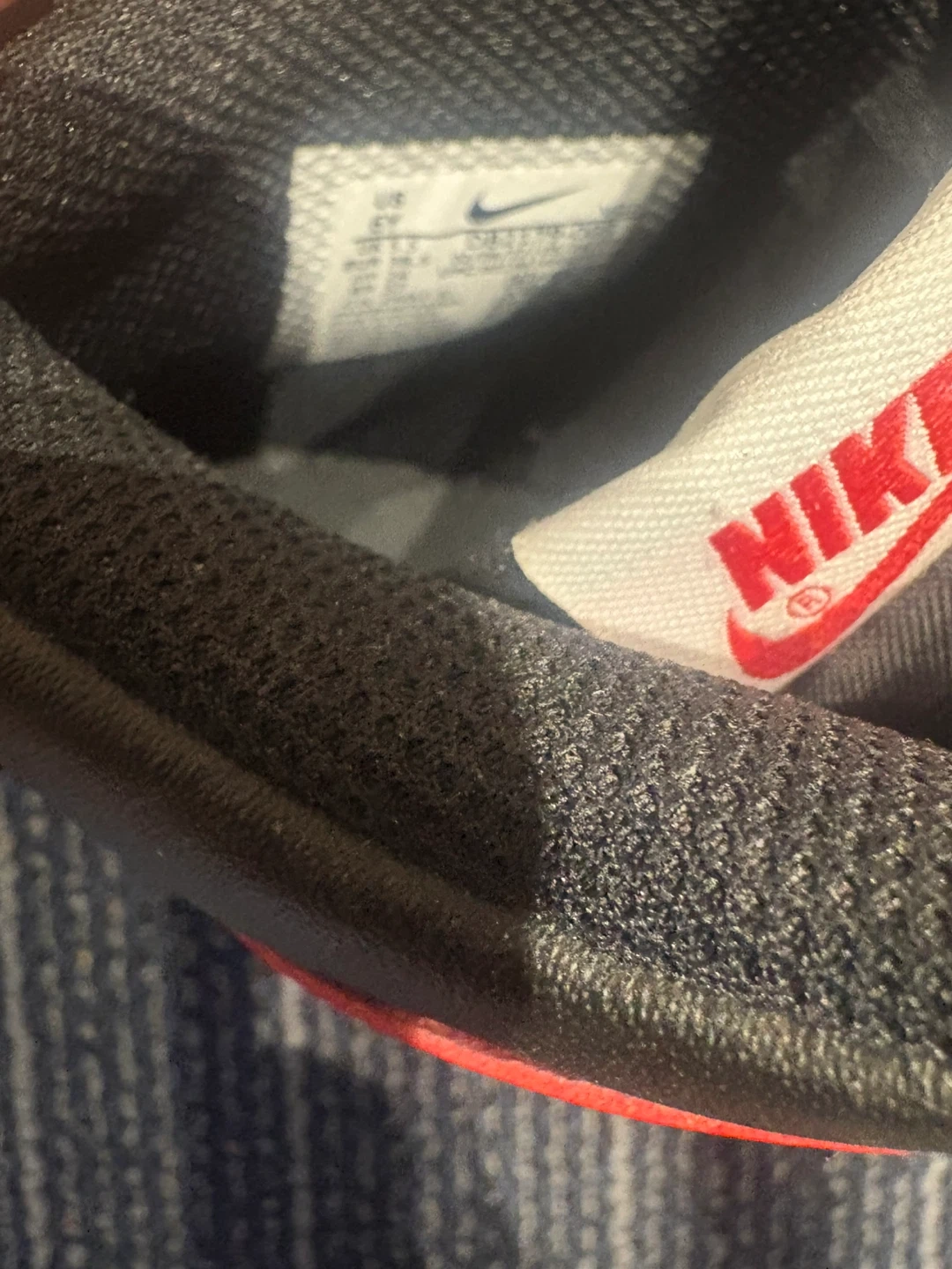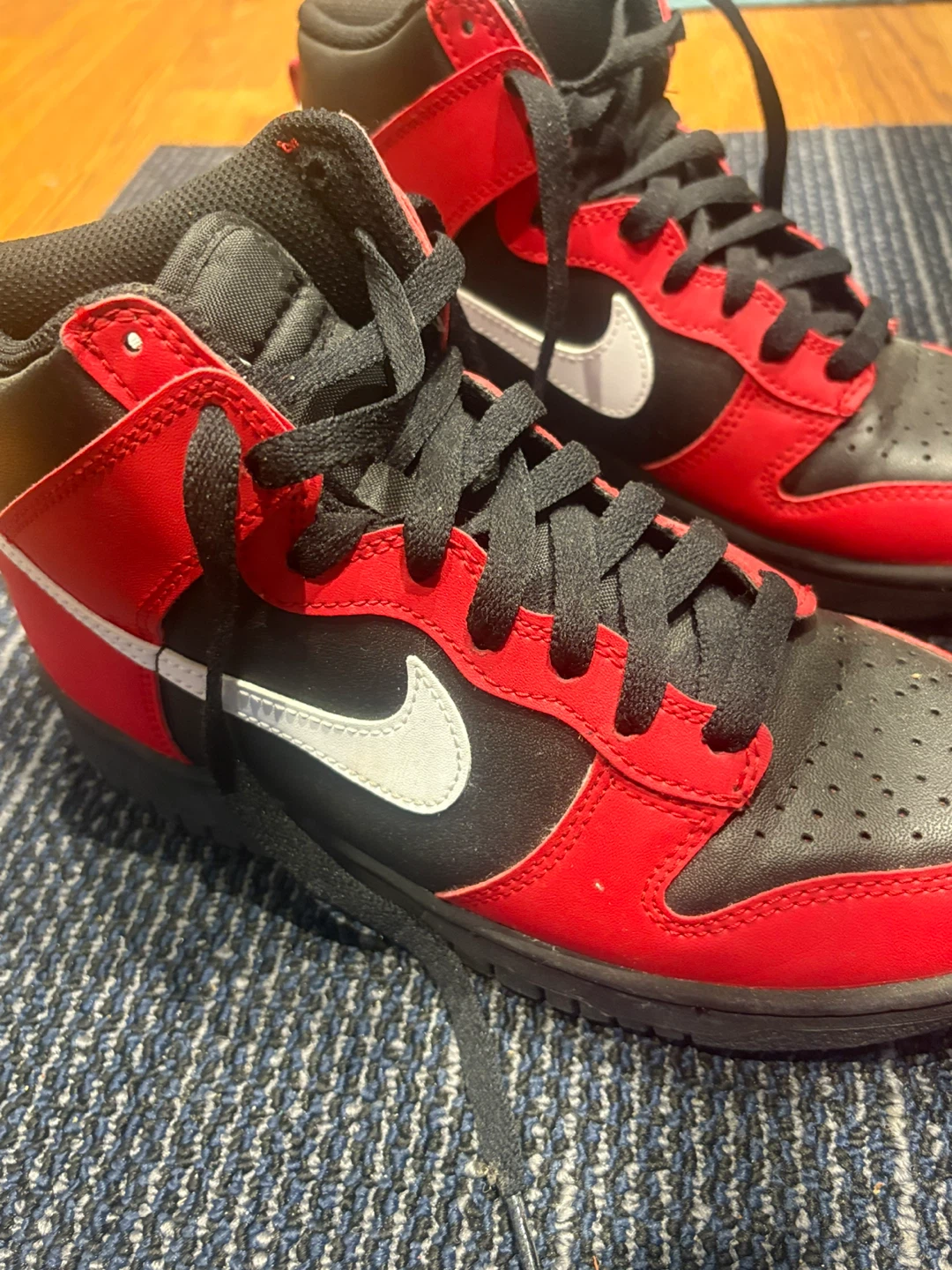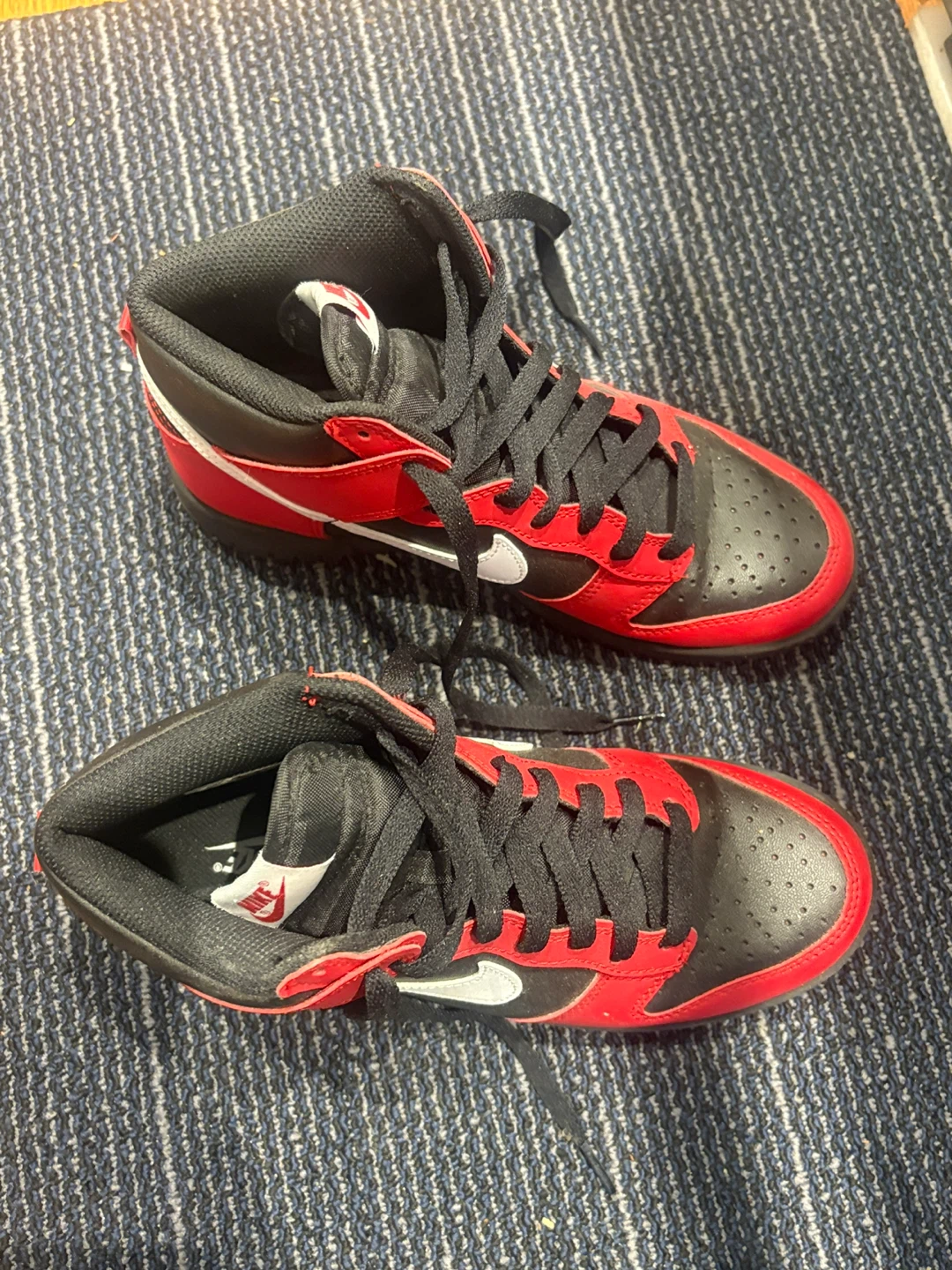 I am selling a pair of Nike Dunk High sneakers in red and black. They have the classic Nike swoosh in white. Worn once. Price is firm.