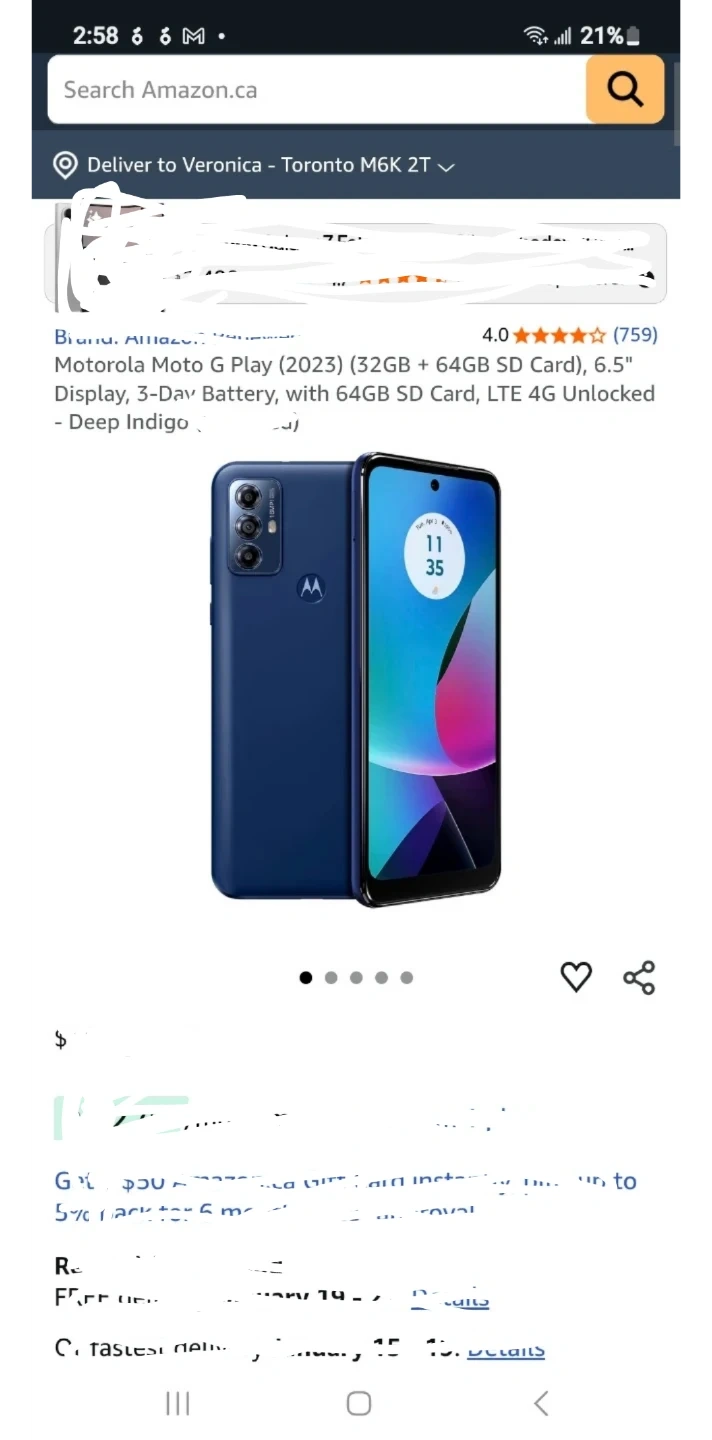 Selling a Motorola Moto G Play (2023) in Deep Indigo. It features a 32GB internal storage, plus a 64GB SD card for extra space. The display is 6.5 inches, and it has a long-lasting battery. It's also LTE 4G unlocked, so you can use it with any carrier