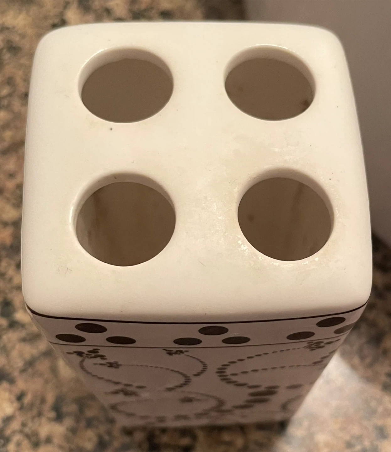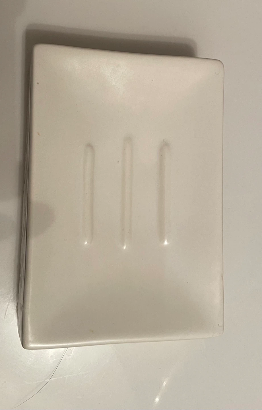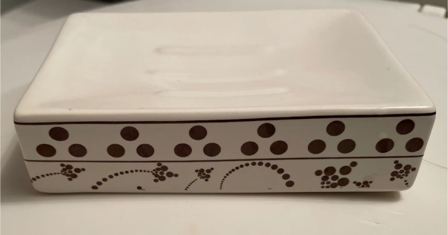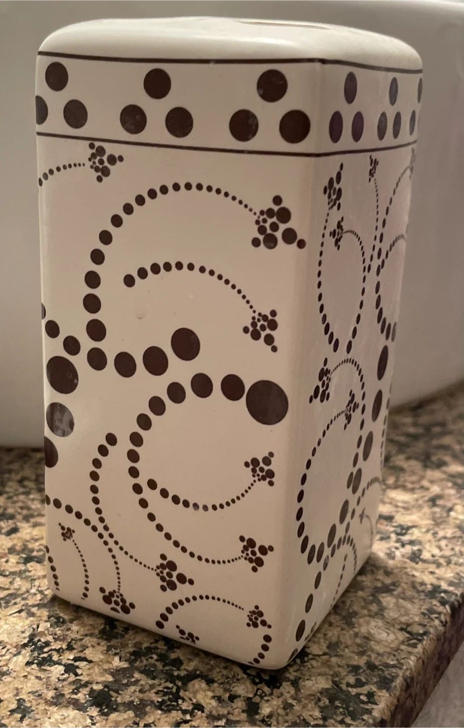 Selling a cute ceramic bathroom set! Includes a soap dish and a toothbrush holder. Both are in great condition and feature a stylish brown dotted pattern on a cream background. Perfect for adding a retro charm to your bathroom.