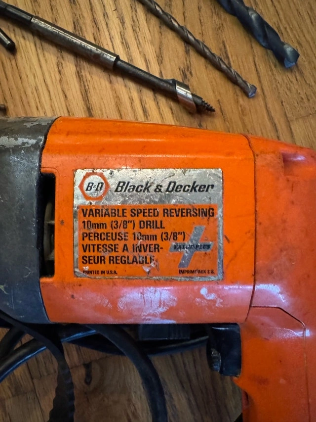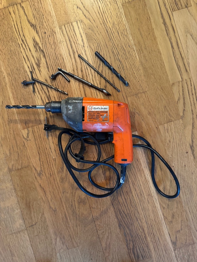 This Black and Decker drill is ready to find a new home! It comes a few drill bits, as shown in the photos. This tool has been well-loved and shows signs of wear, but it still works perfectly. If this ad is up, it's still available.