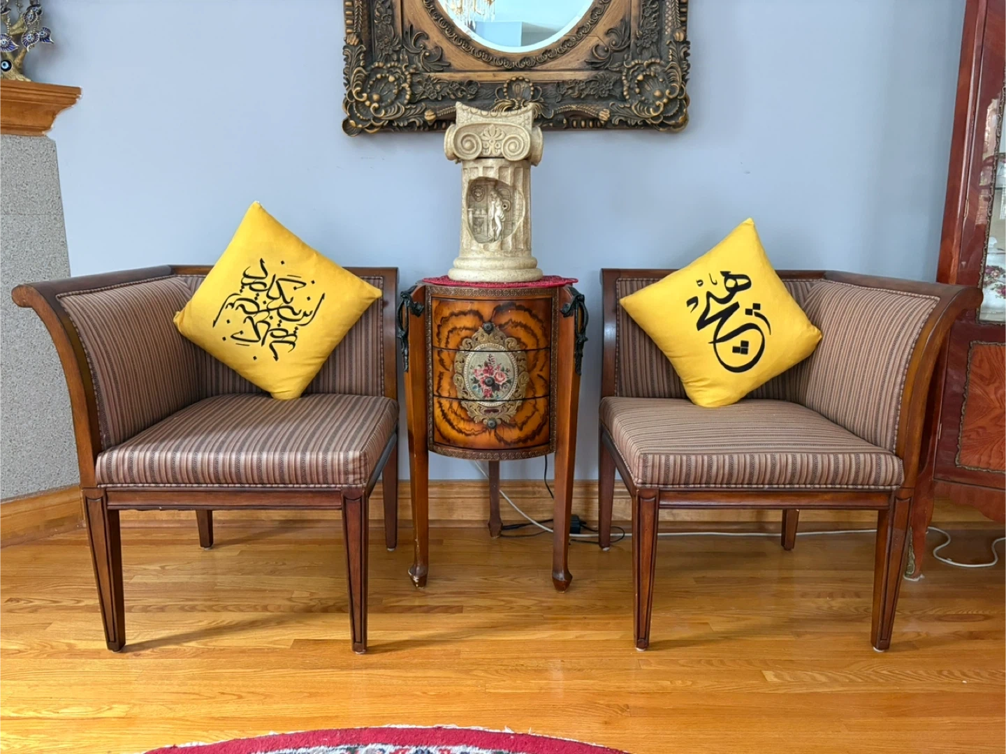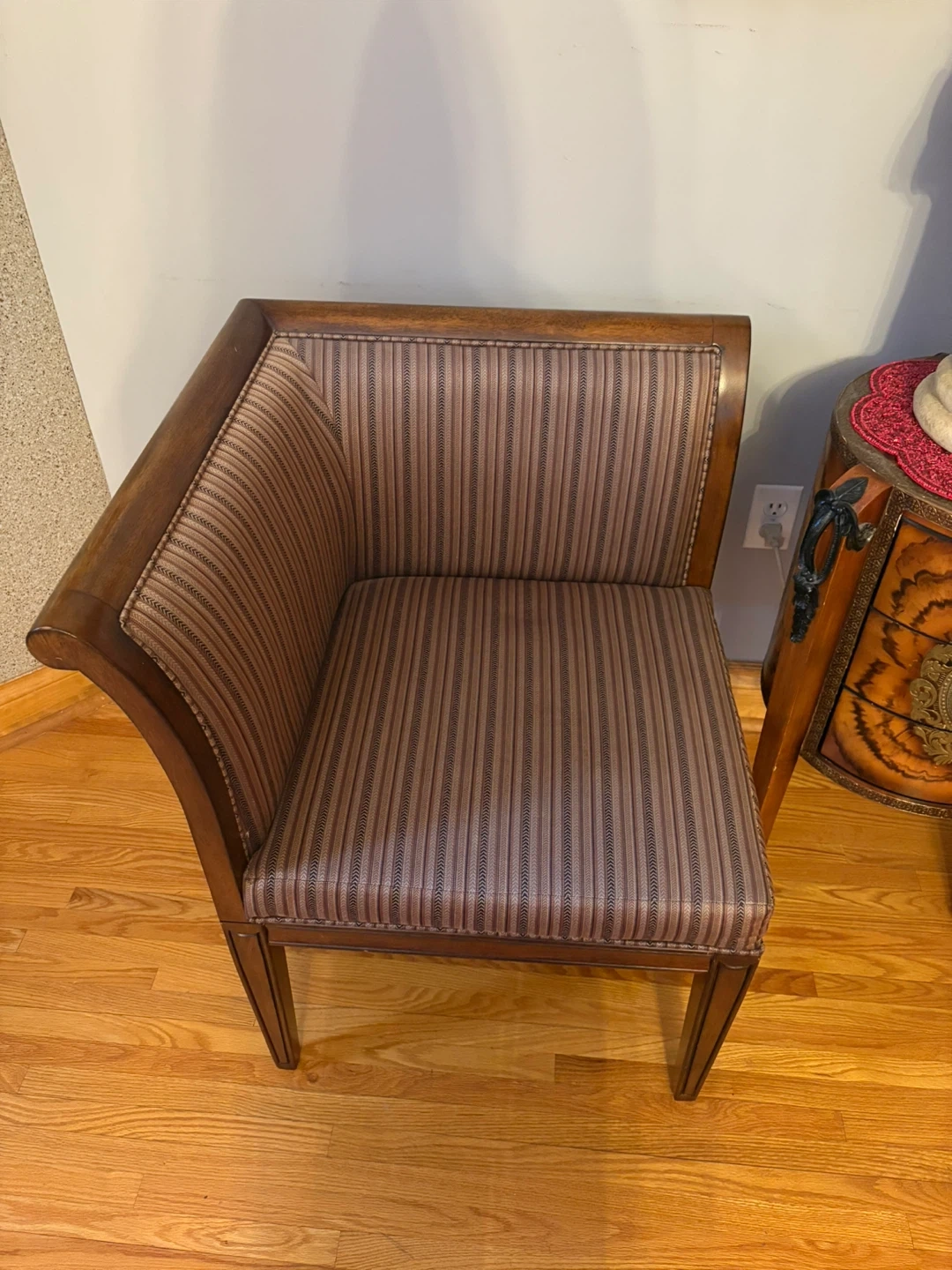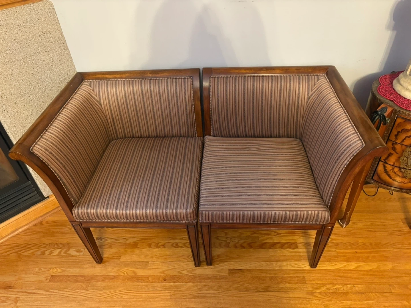 Selling a set of two accent chairs. They feature a striped pattern and a wooden frame. Perfect for adding a touch of elegance to any room!