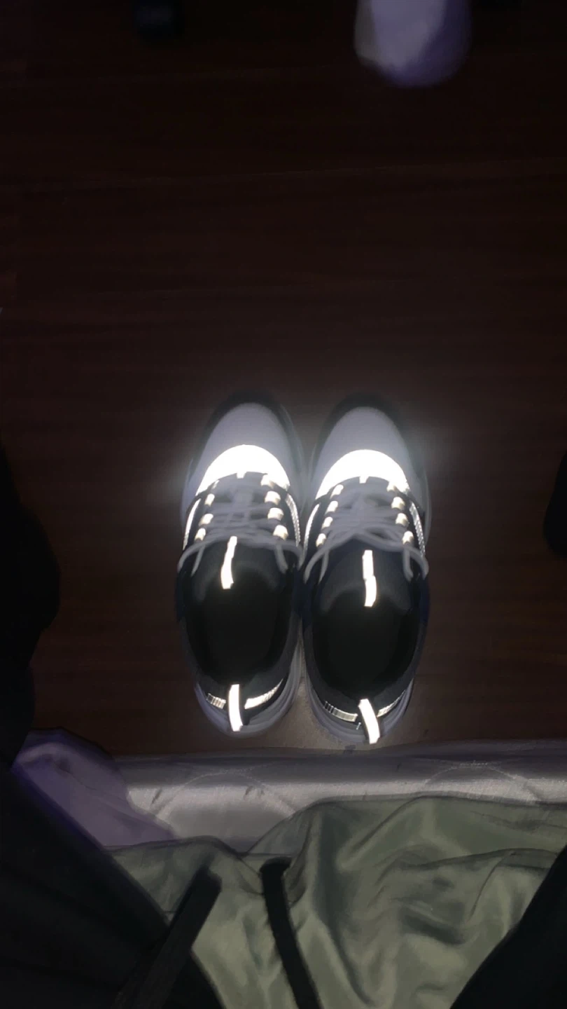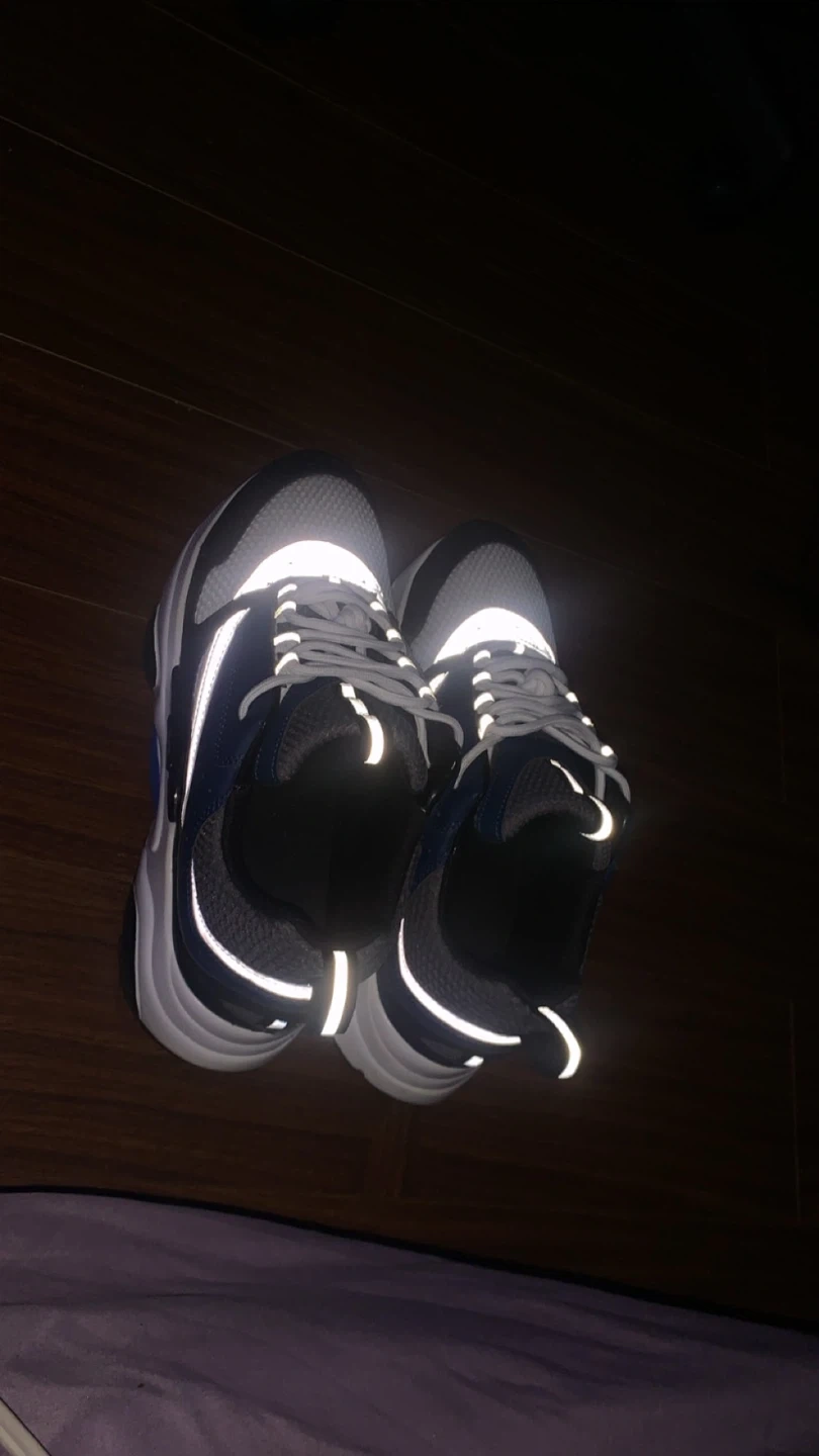Selling a pair of sneakers in good condition. They feature a white and navy blue colour scheme with reflective detailing. Great for everyday wear gives height boost