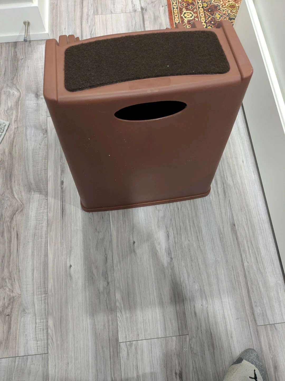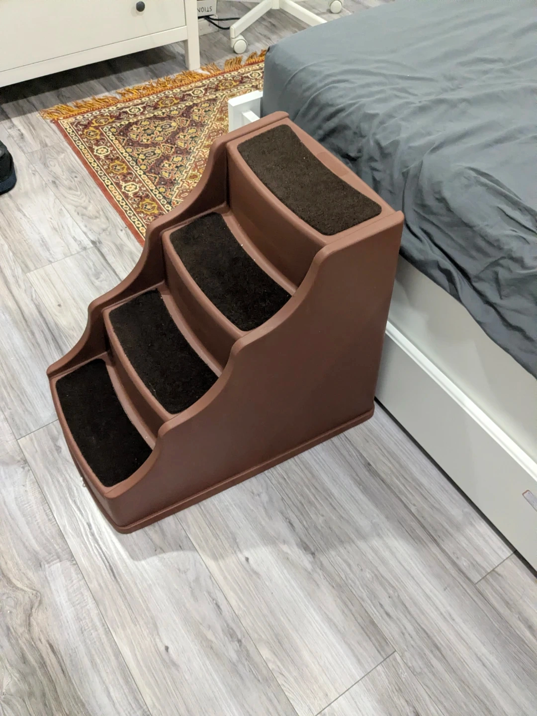 Here are some pet stairs in great condition! They're perfect for helping your furry friends reach higher places like beds or couches. The stairs are brown and have carpeted steps for extra grip and comfort for your pet