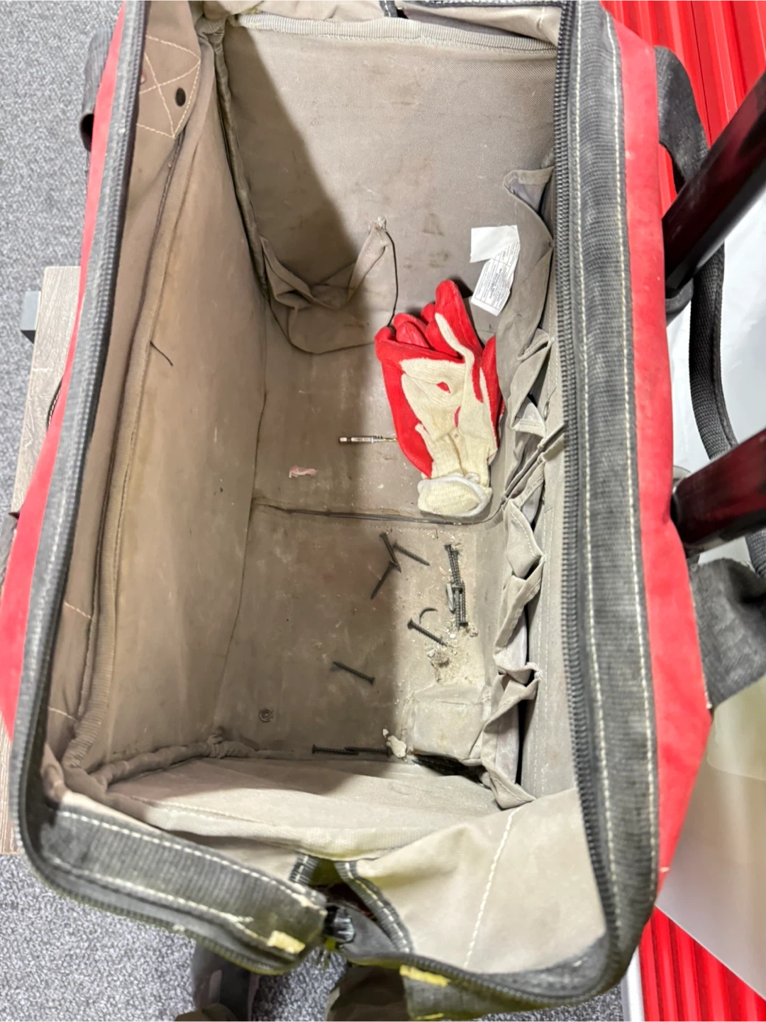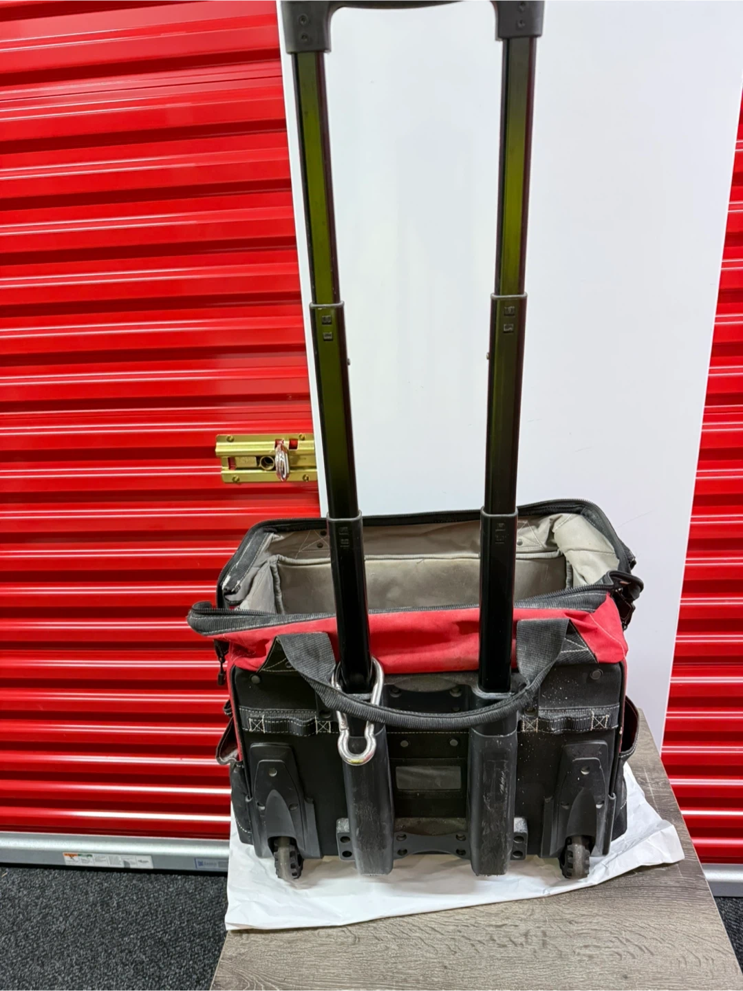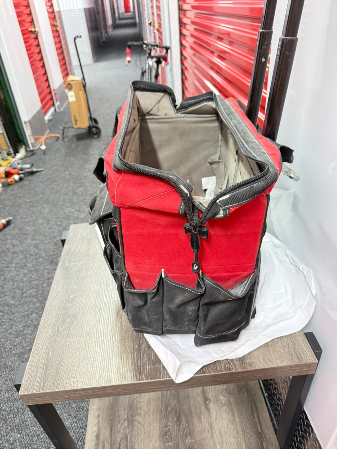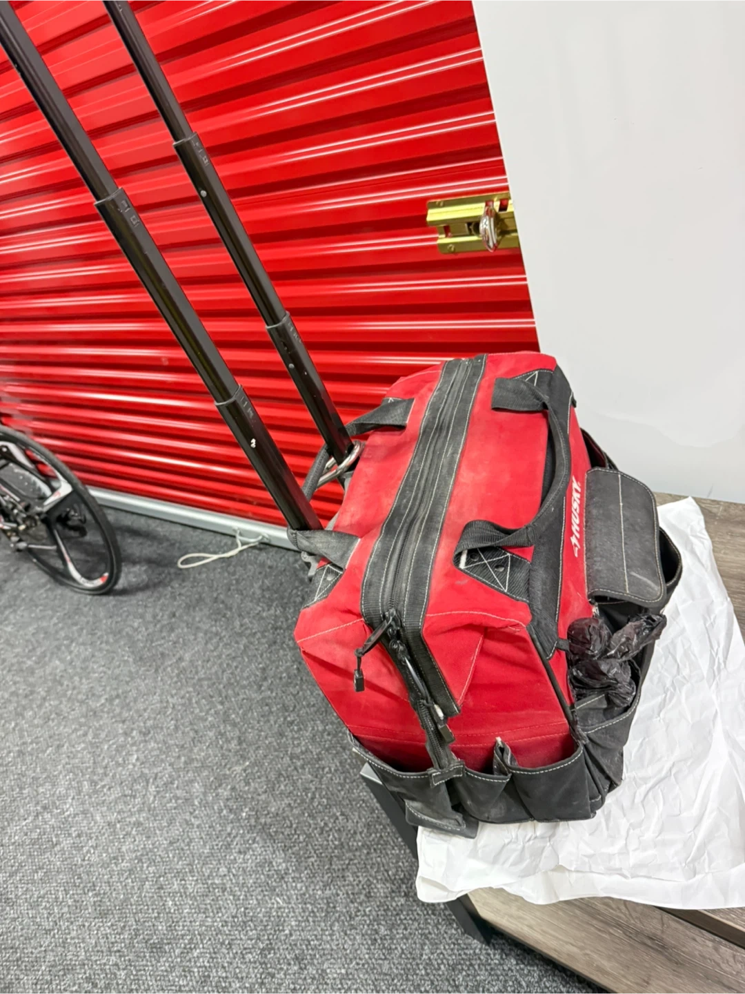 Selling a used Husky rolling tool tote bag. It's red and black with a telescoping handle and wheels for easy transport. It has multiple pockets for organization.