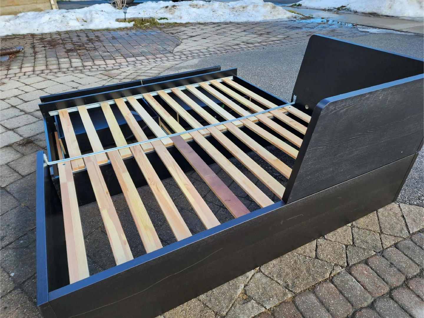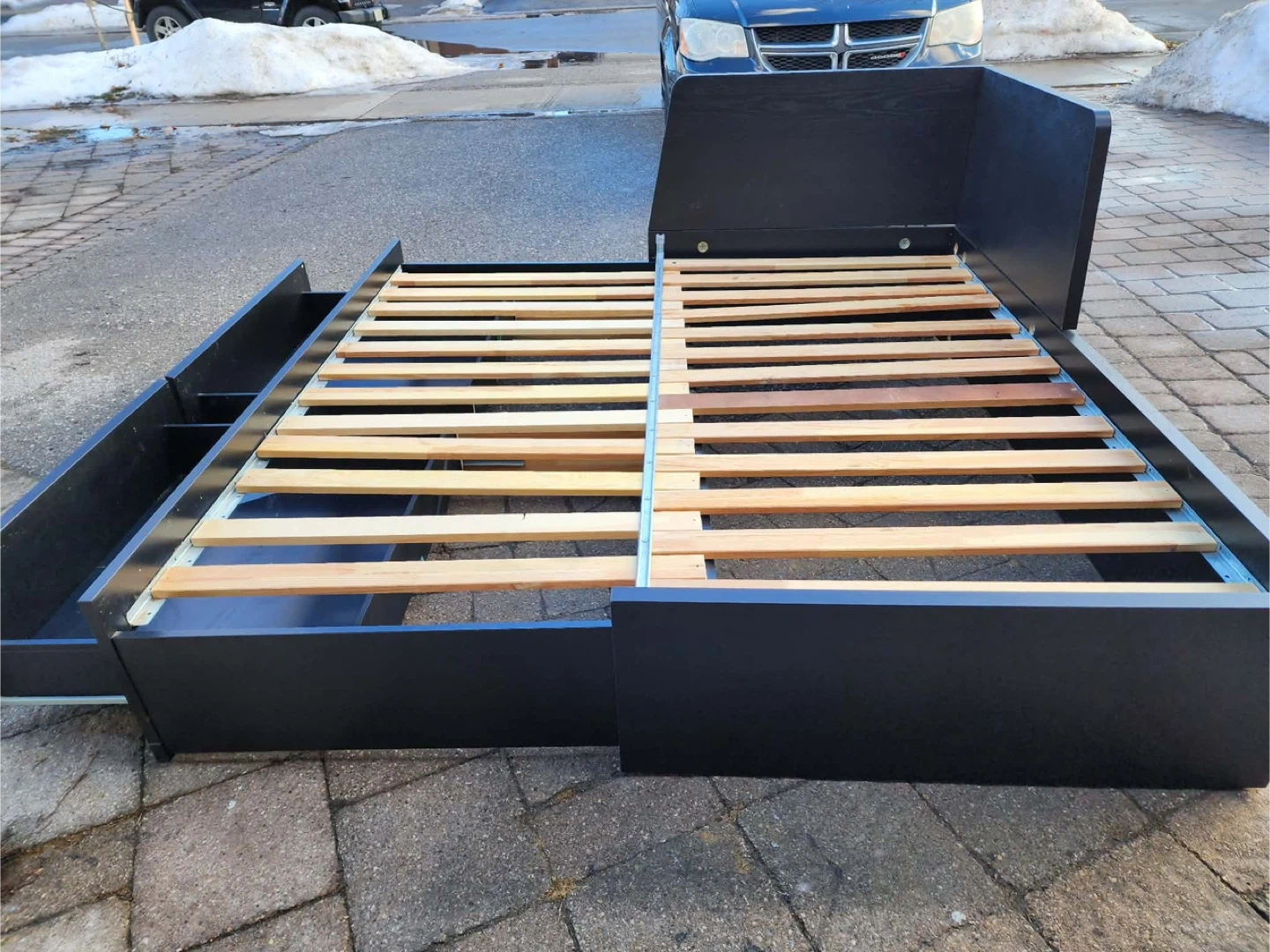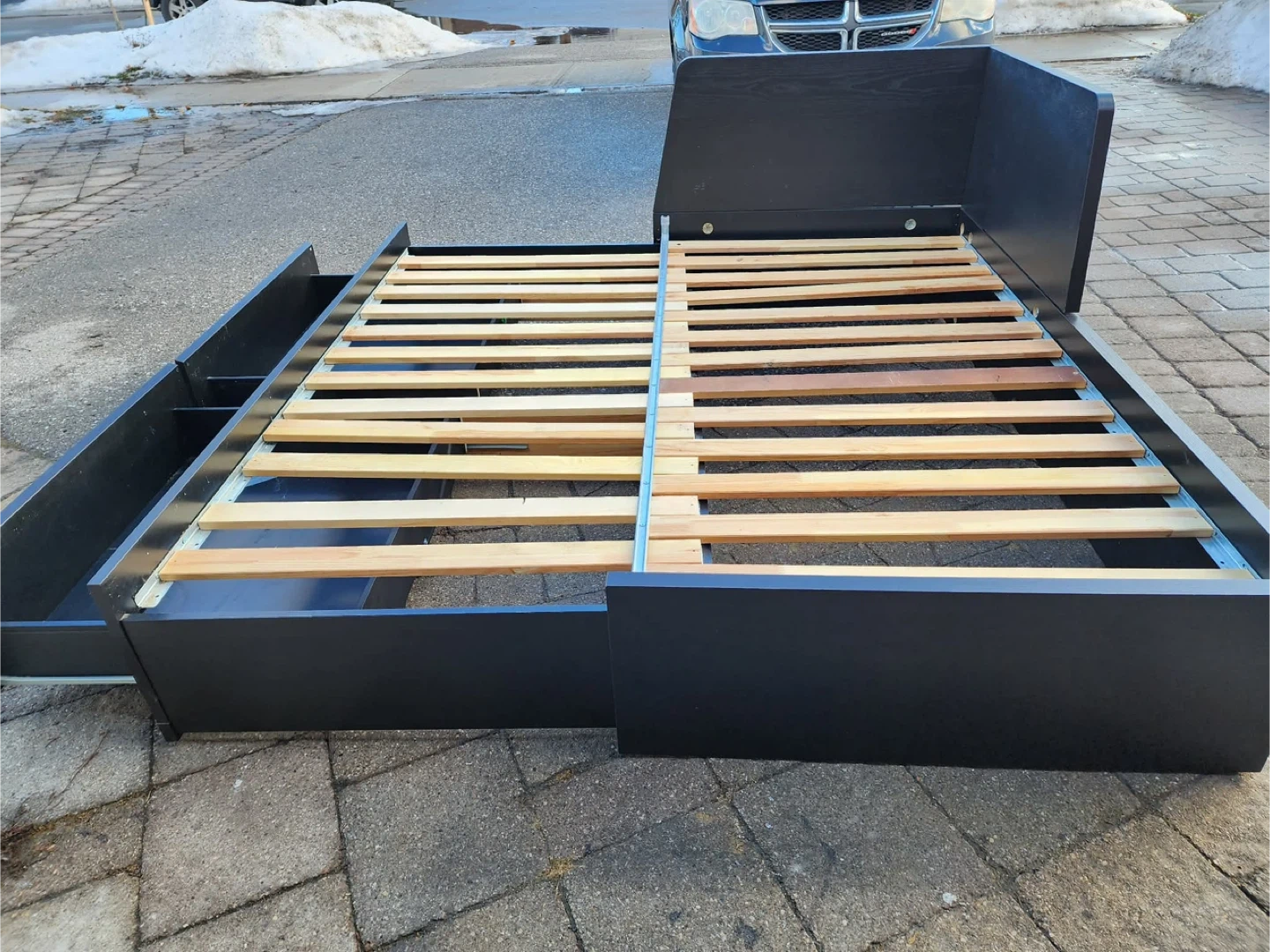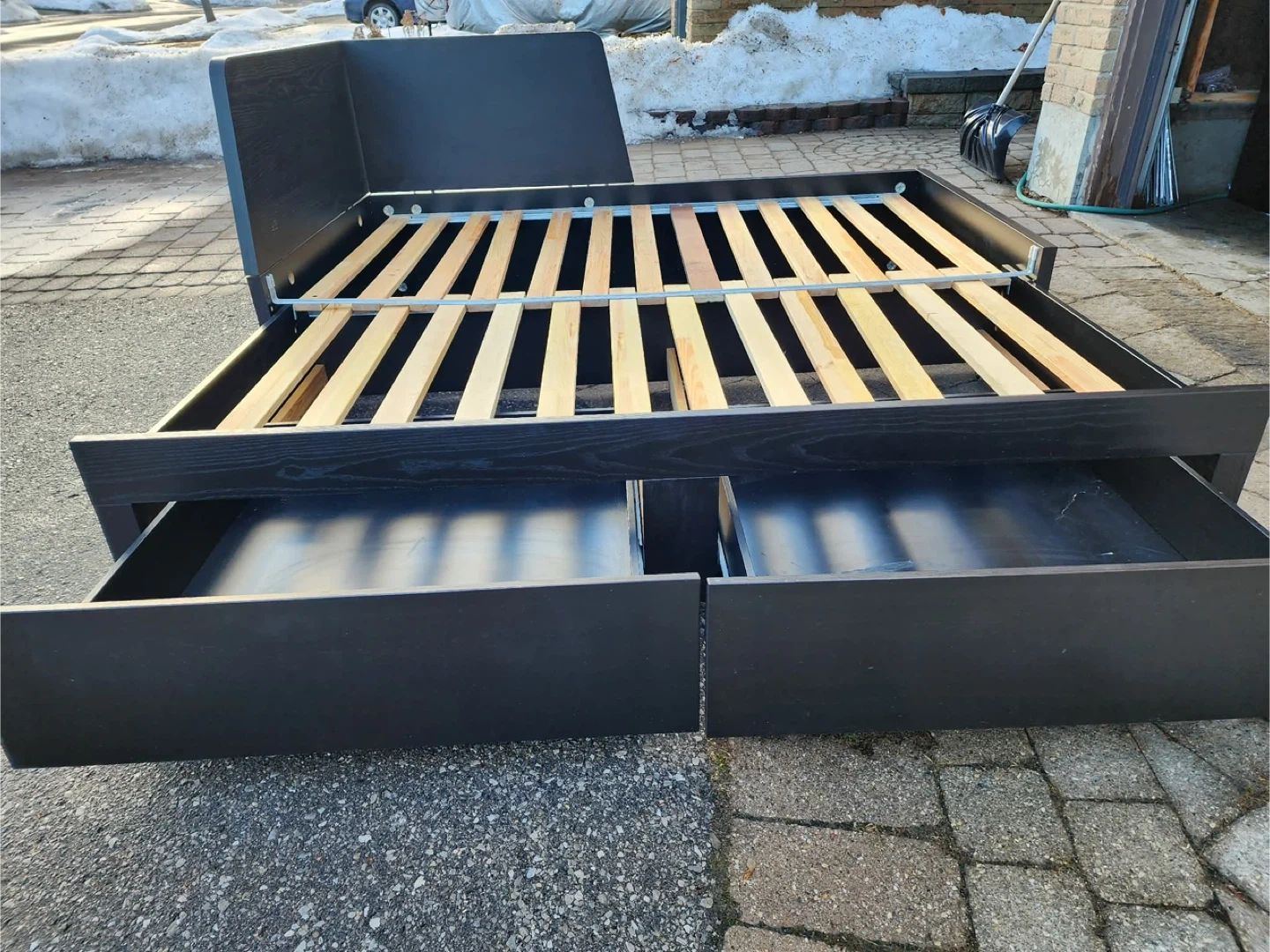 Here's a sturdy bed frame in a dark wood finish! It comes with convenient storage drawers built right in, perfect for maximizing space in your bedroom. The bed frame is in good condition and ready to be used in your home!