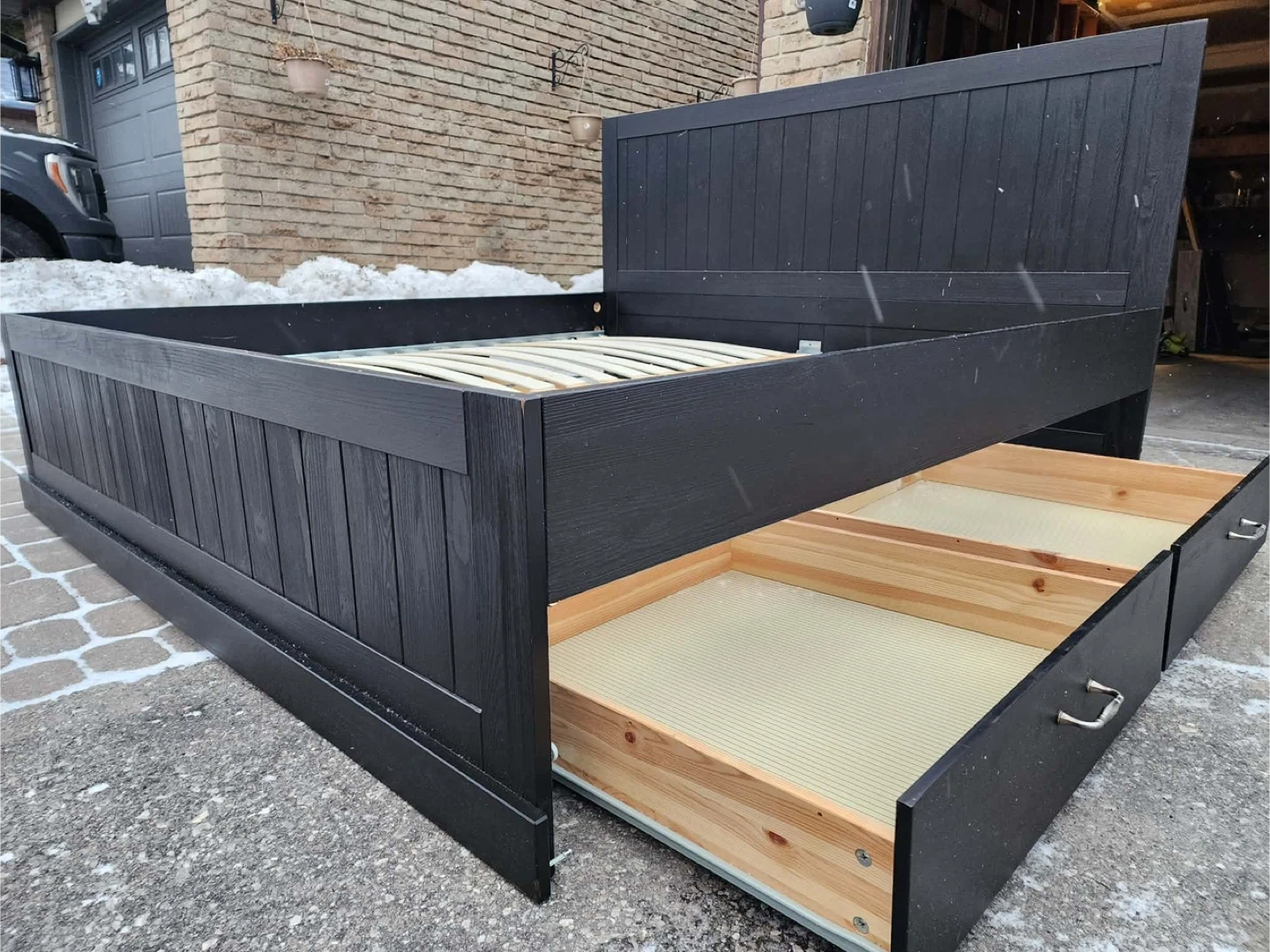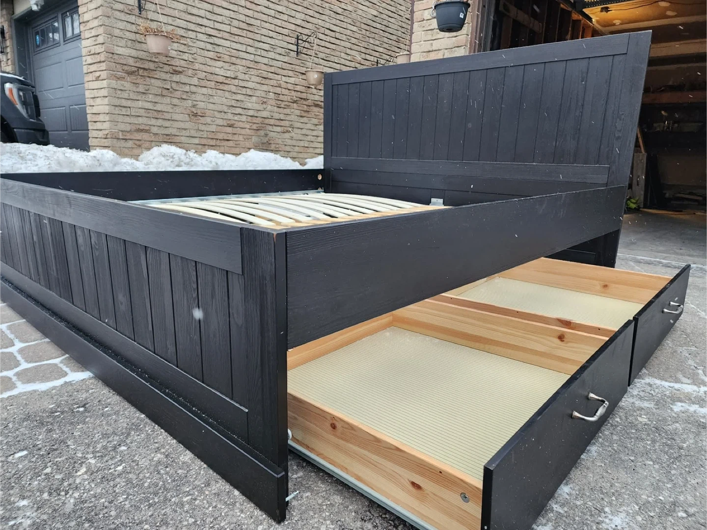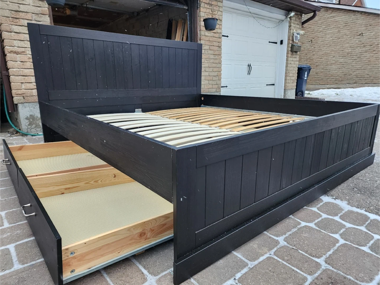 Selling a black wooden king size bed frame. It's in great condition and ready for a new home. Has four drawers for extra storage