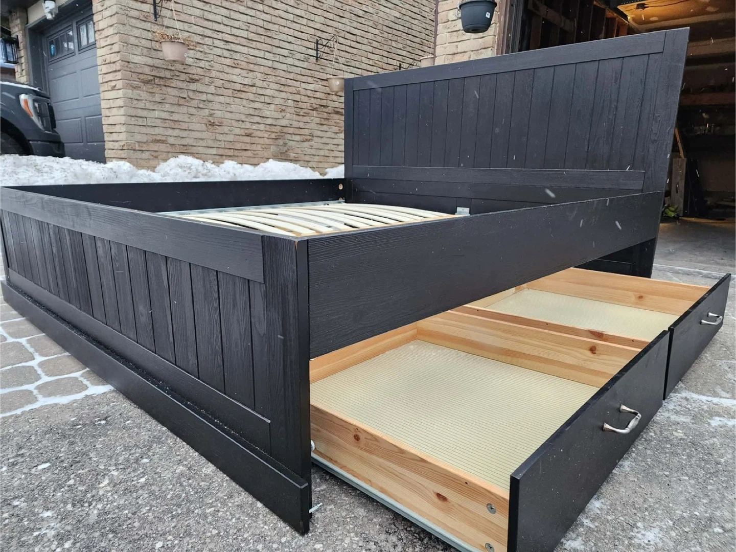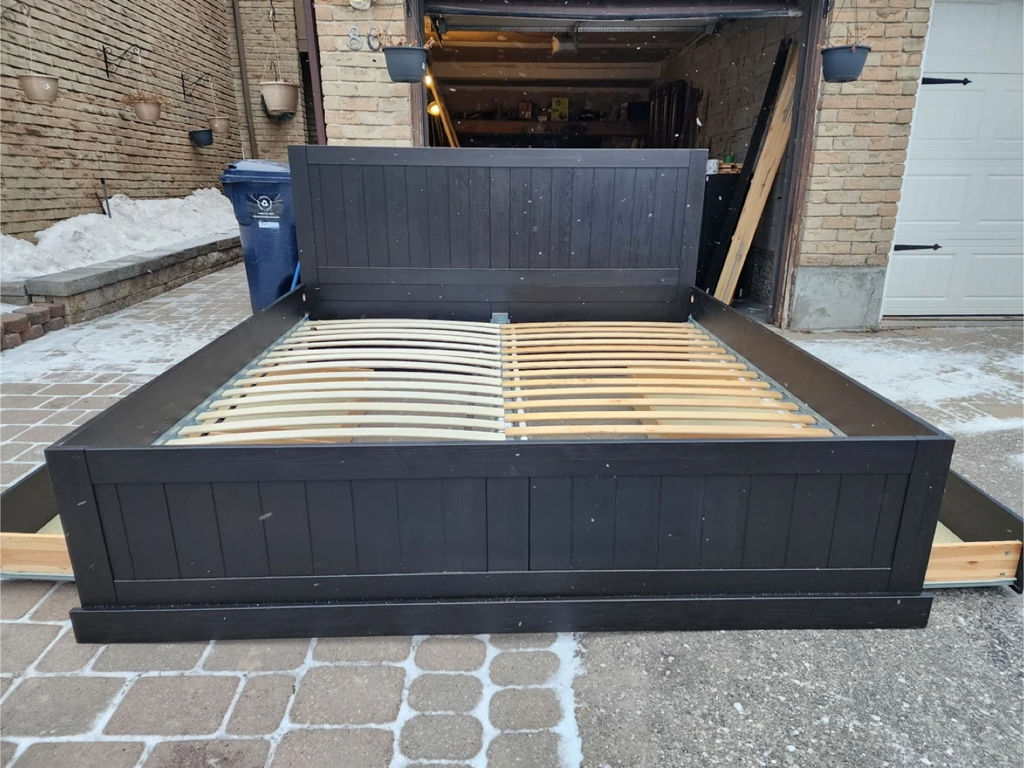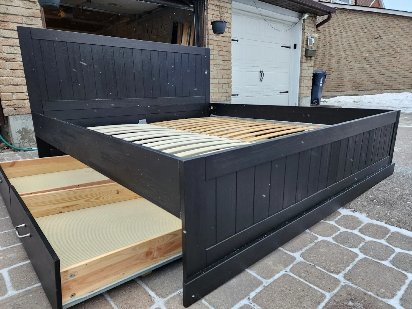 Selling a black wooden king size bed frame. It's in great condition and ready for a new home. Has four drawers for extra storage