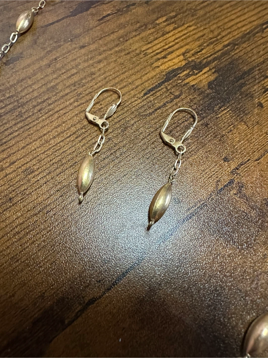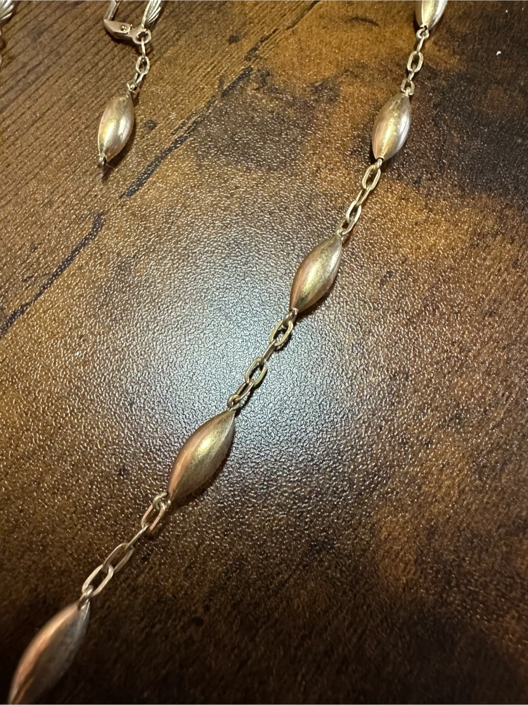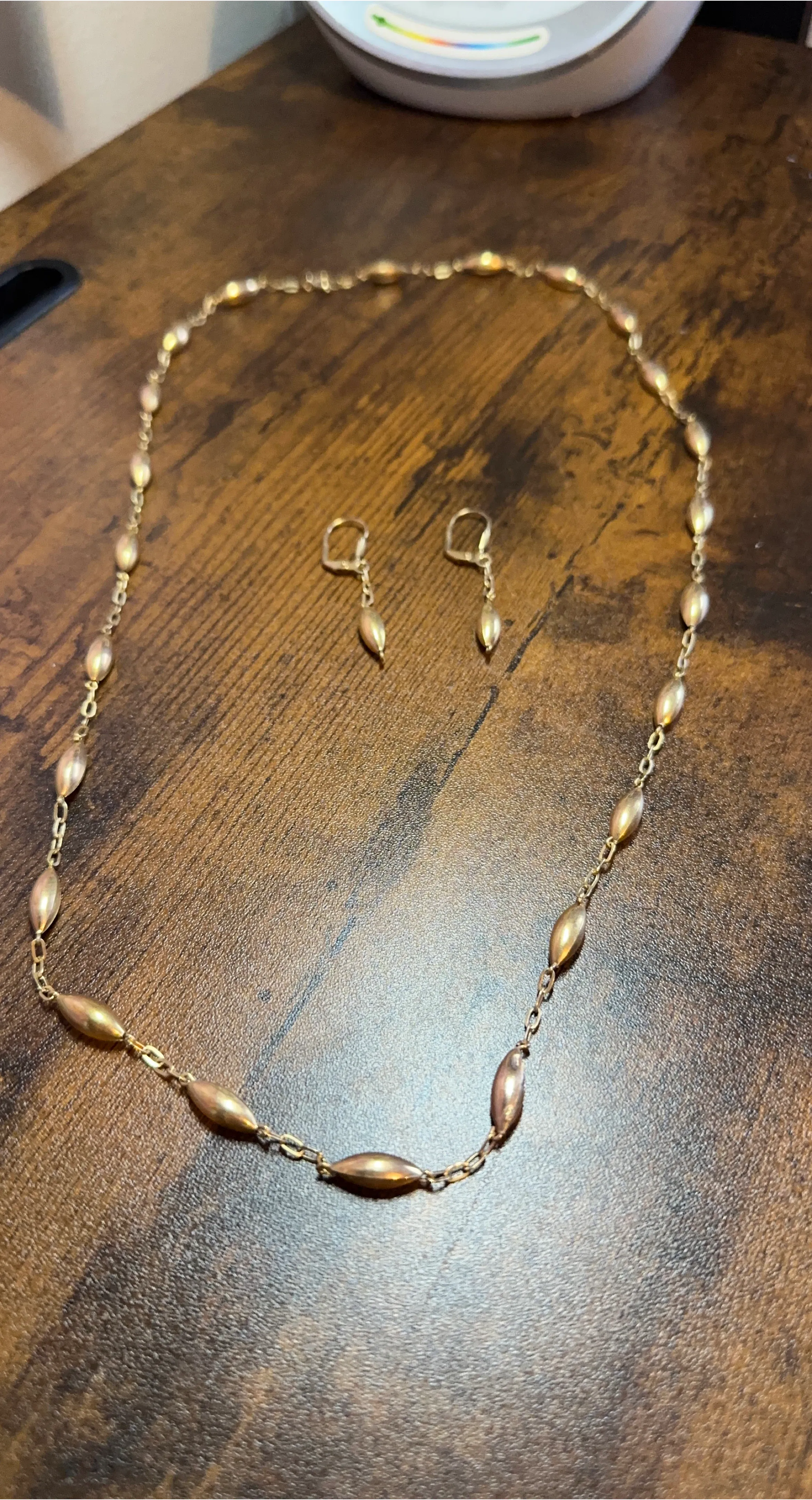 Selling a lovely gold-toned necklace and earring set. The necklace features a delicate chain with small, oval-shaped beads. The matching earrings are a simple, elegant design. Perfect for adding a touch of sparkle to any outfit!