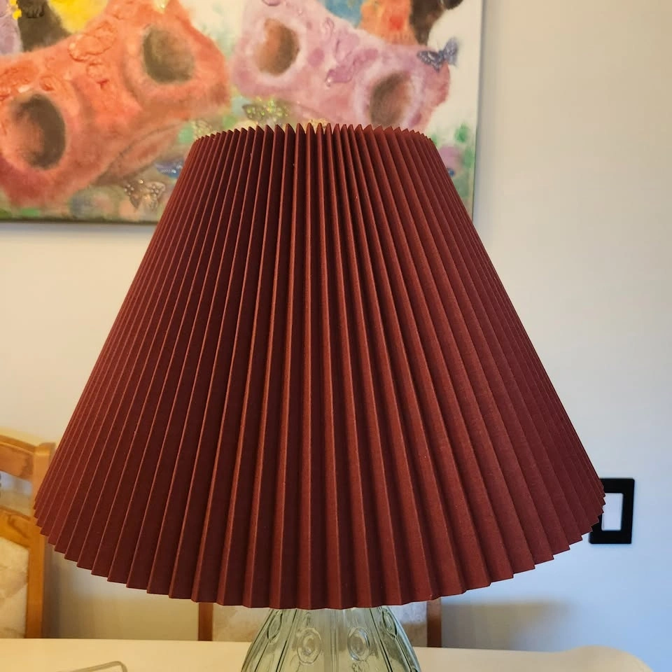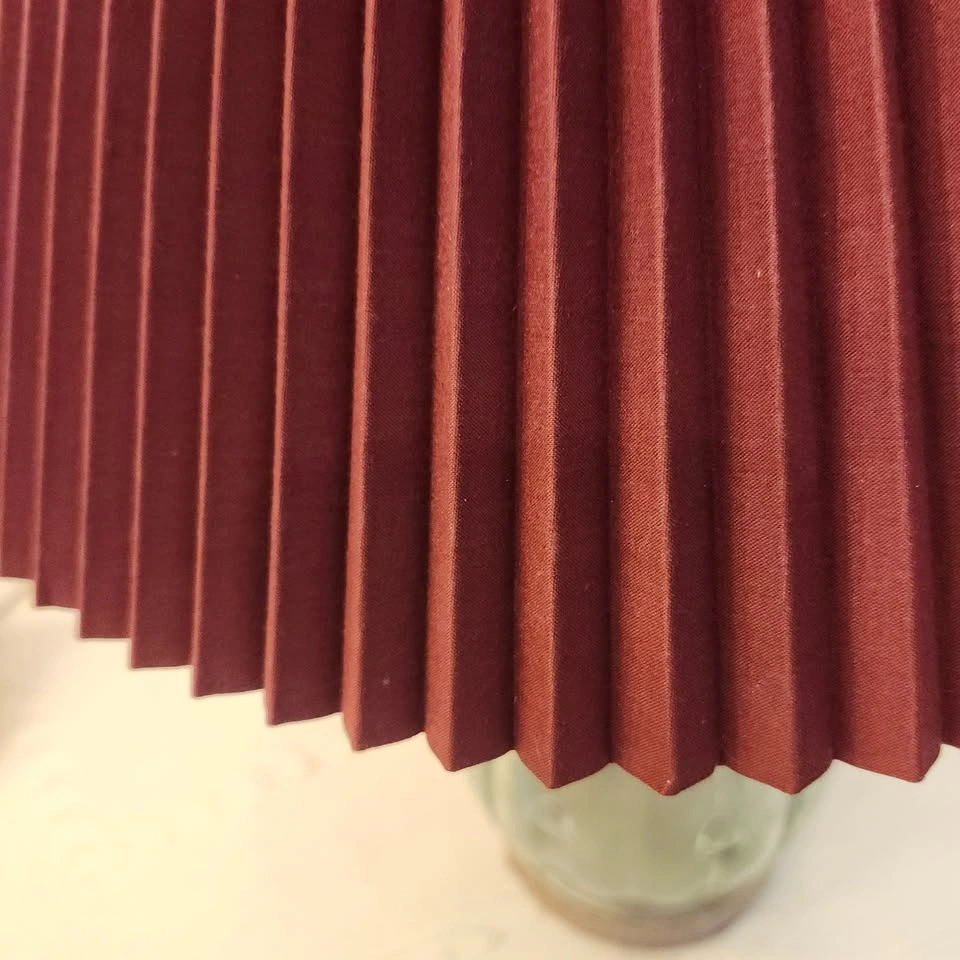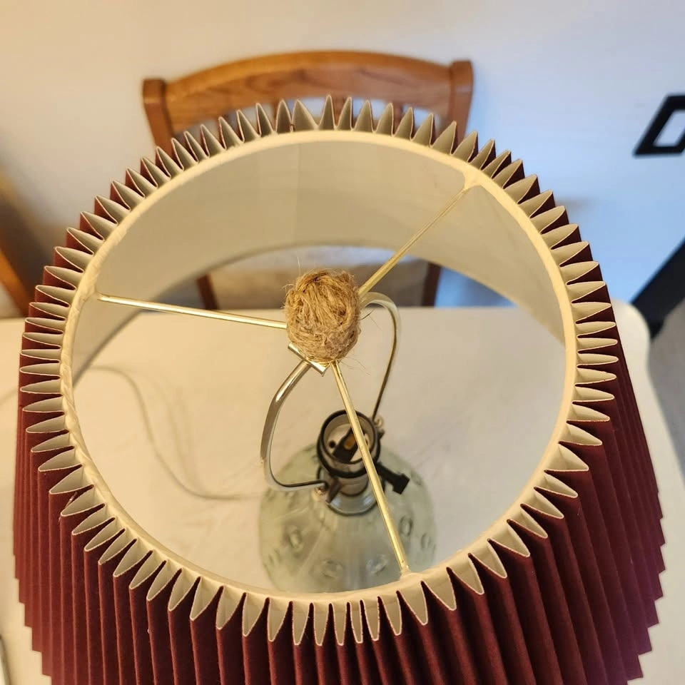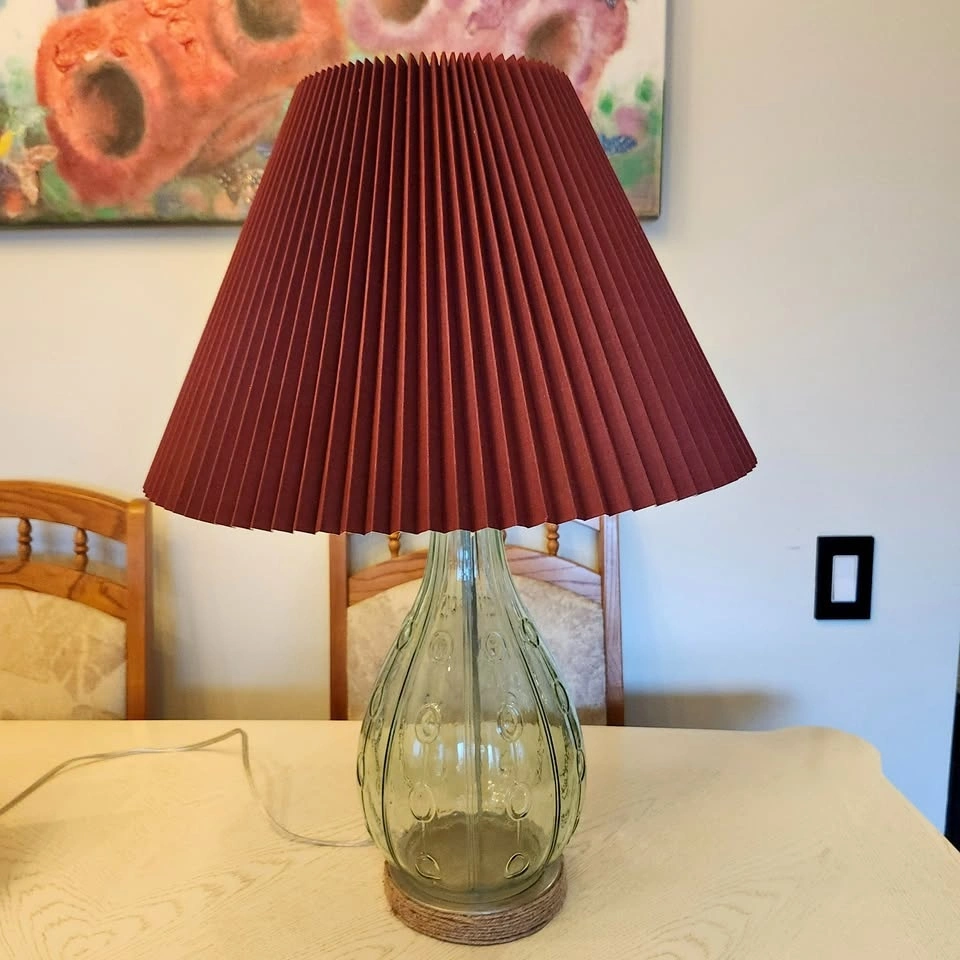 The lamp has a gorgeous clear green glass base, with a brand new pleated burgundy shade.