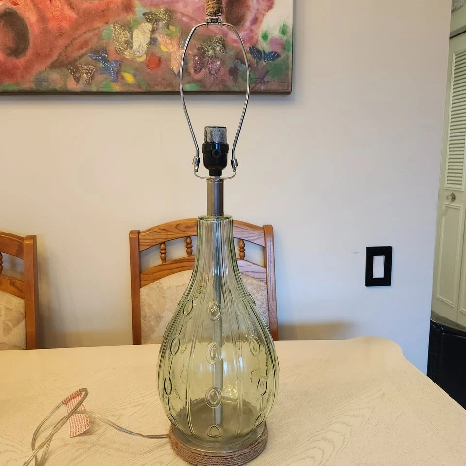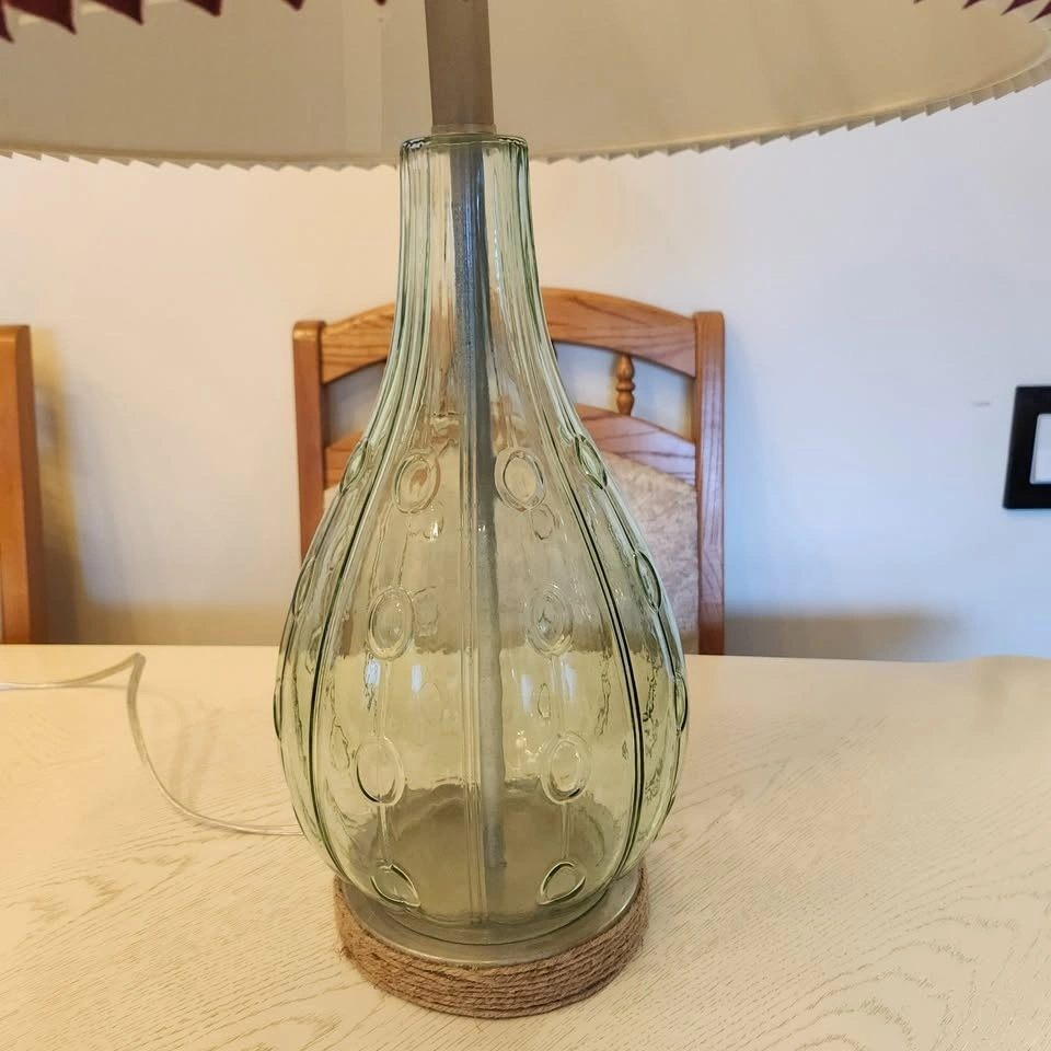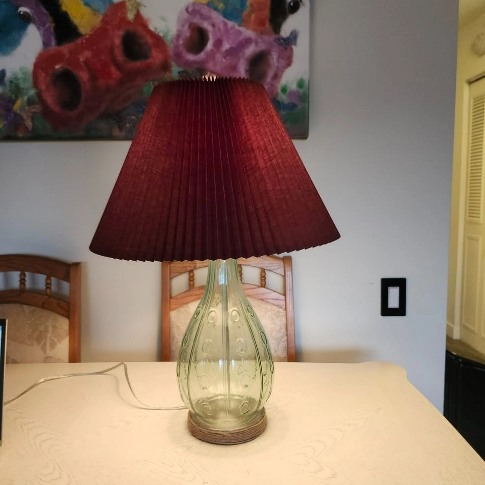 Green Glass Lamp, Burgundy Shade