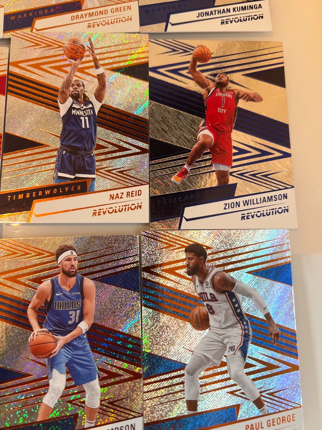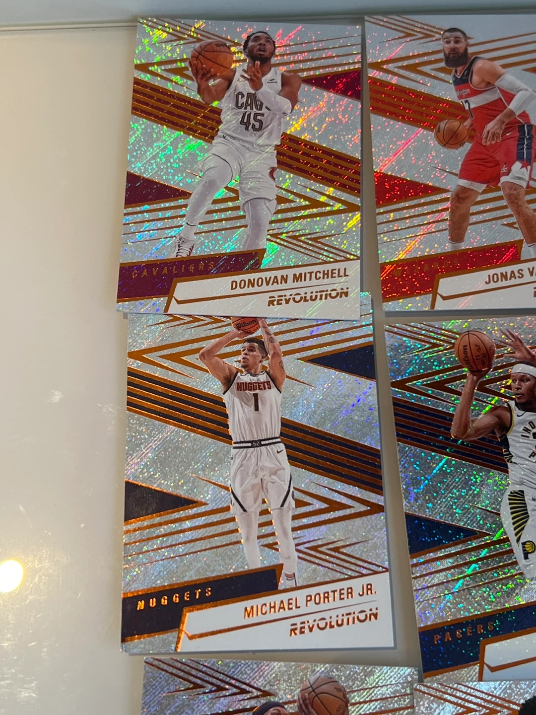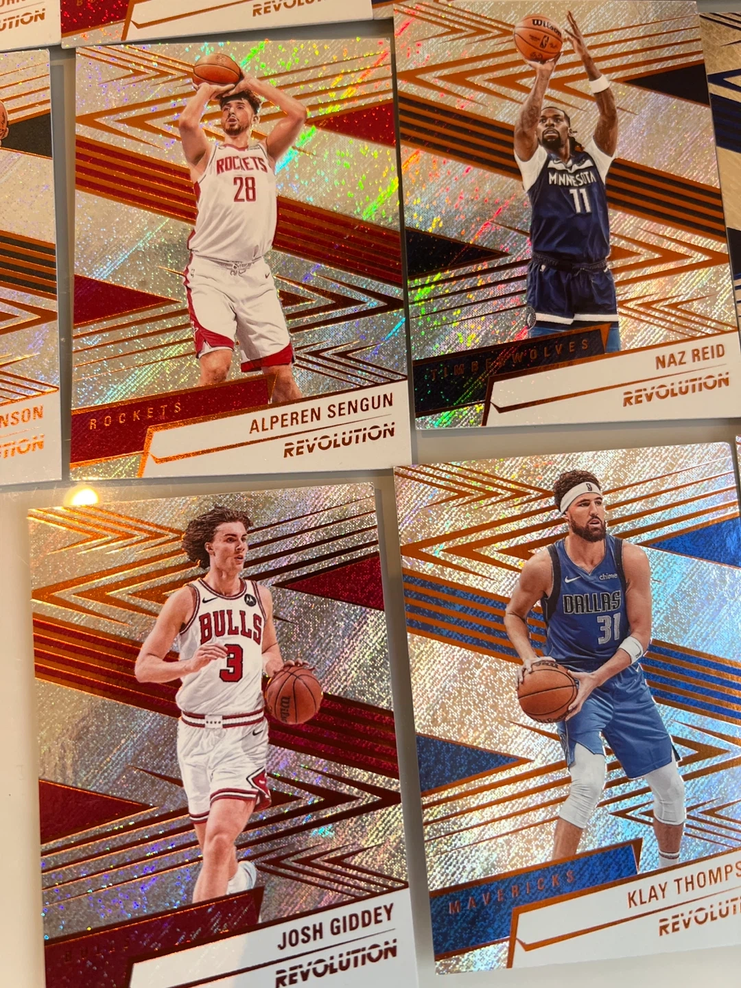 Selling a collection of Panini Revolution basketball cards! These cards feature a cool, eye-catching design with a holographic effect. Great for any basketball fan or card collector looking to add some unique pieces to their collection