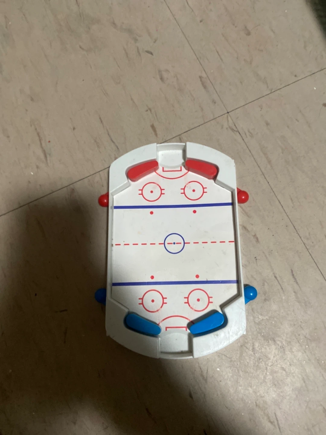 Selling a mini tabletop hockey game! It's a fun little game to play. It has red and blue accents, and it's in used condition. No ball