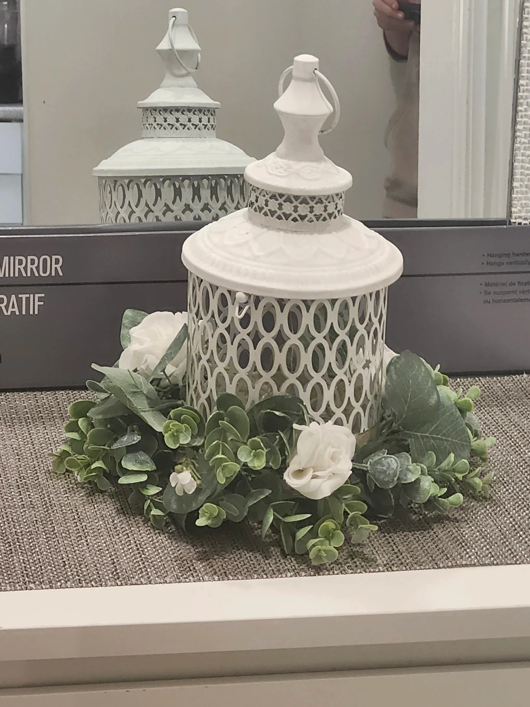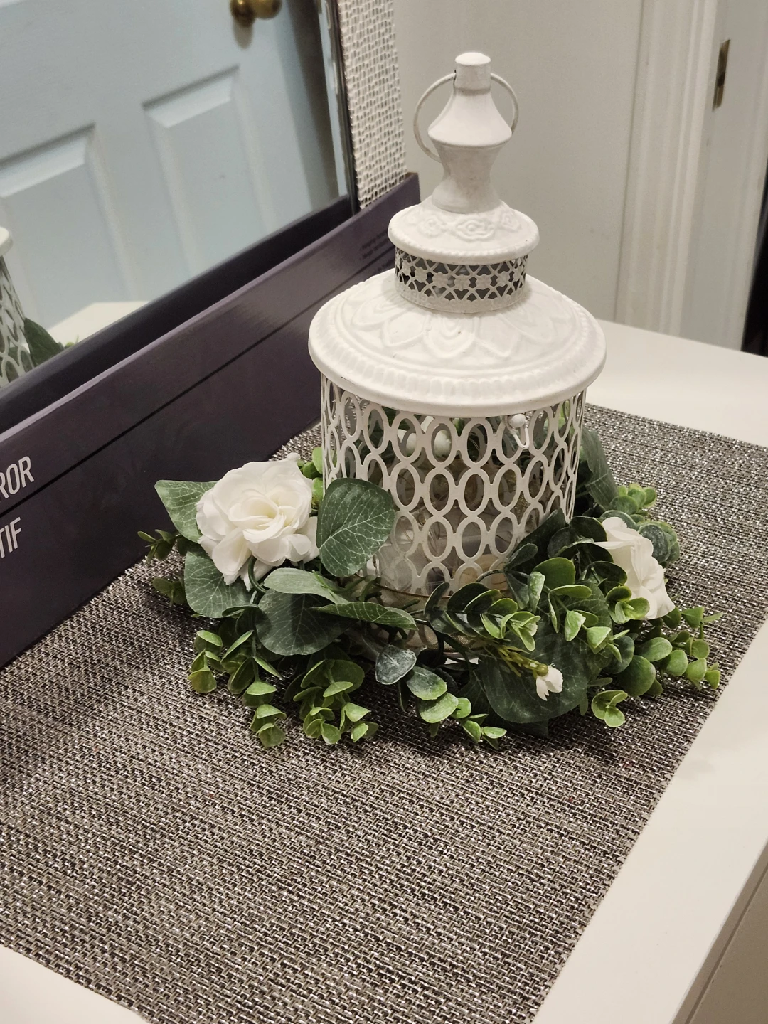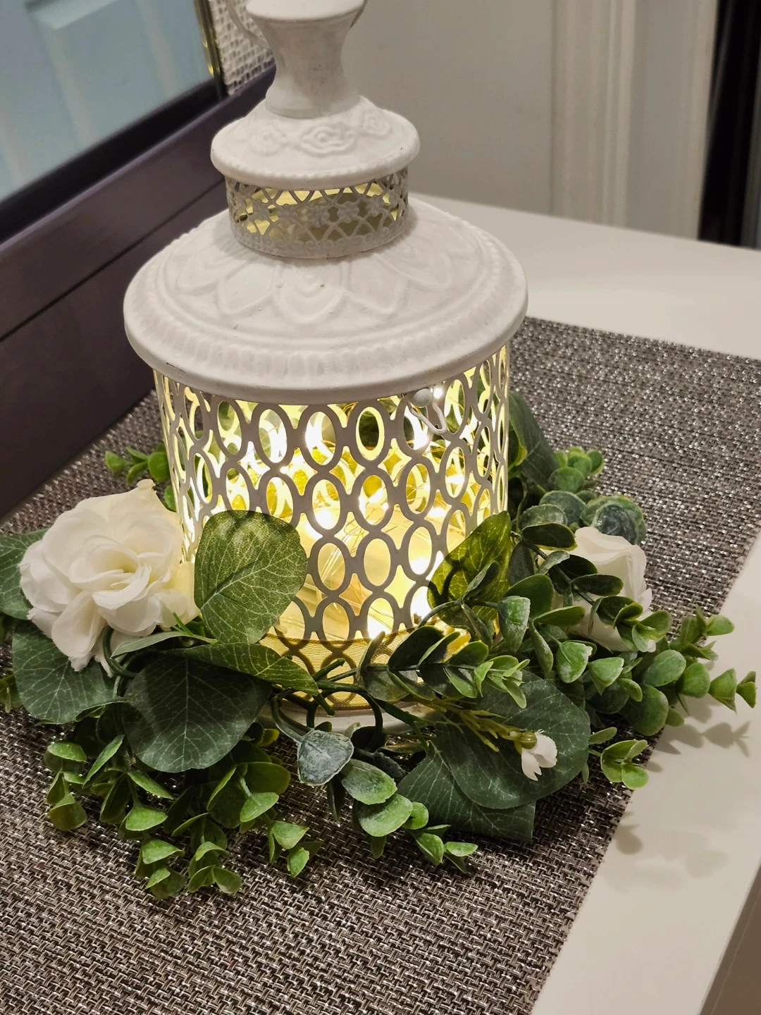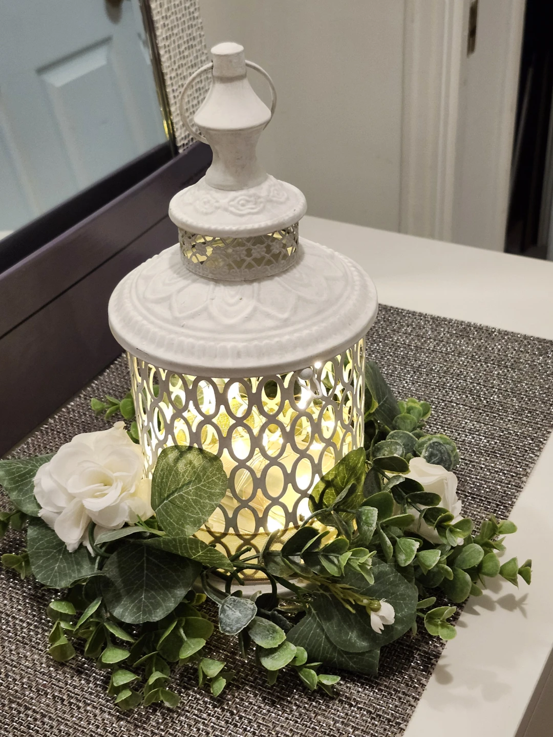 This is a lovely white decorative lantern, perfect for adding a touch of elegance to any room! It comes with beautiful floral accents around the base, creating a warm and inviting atmosphere