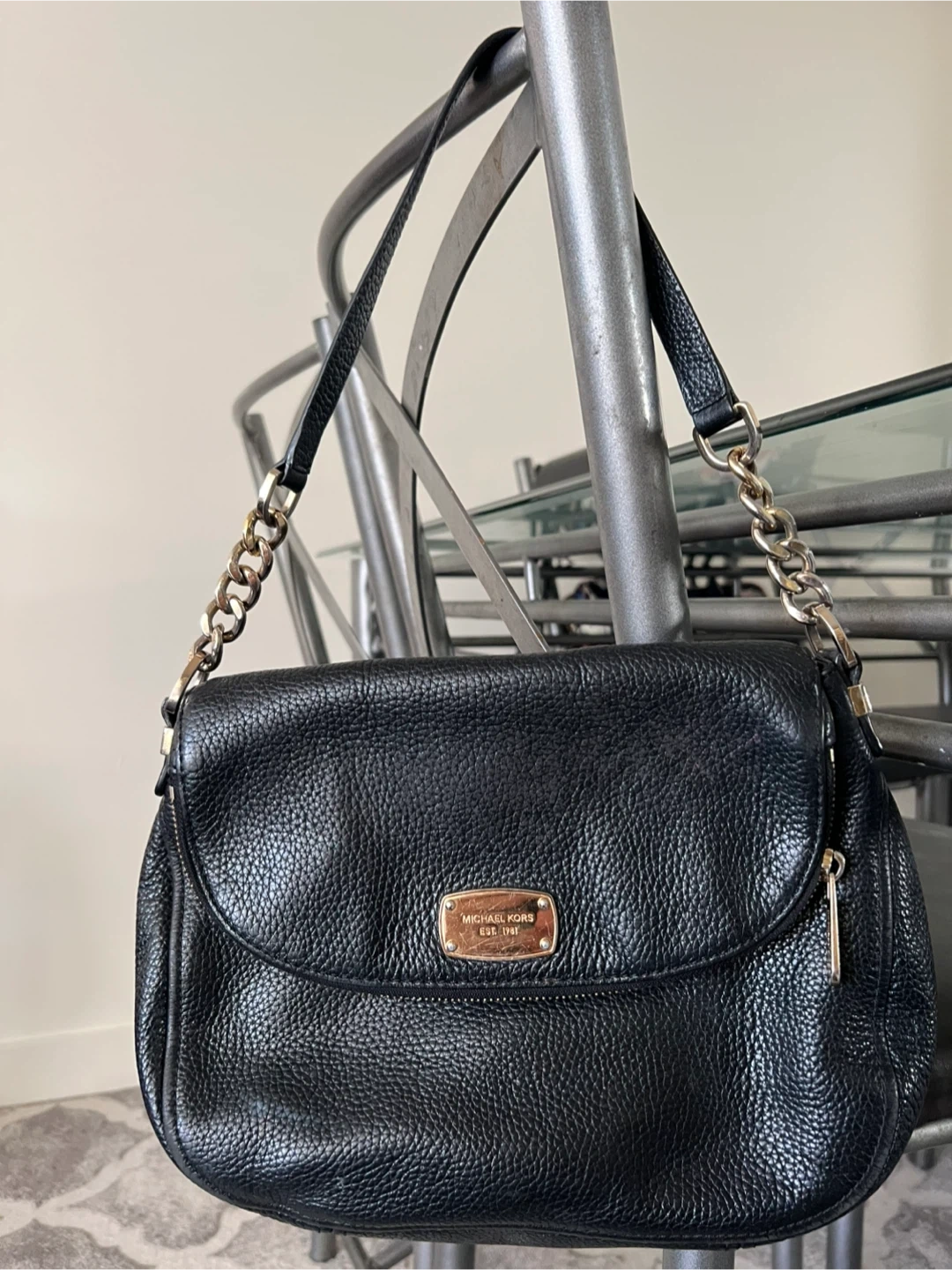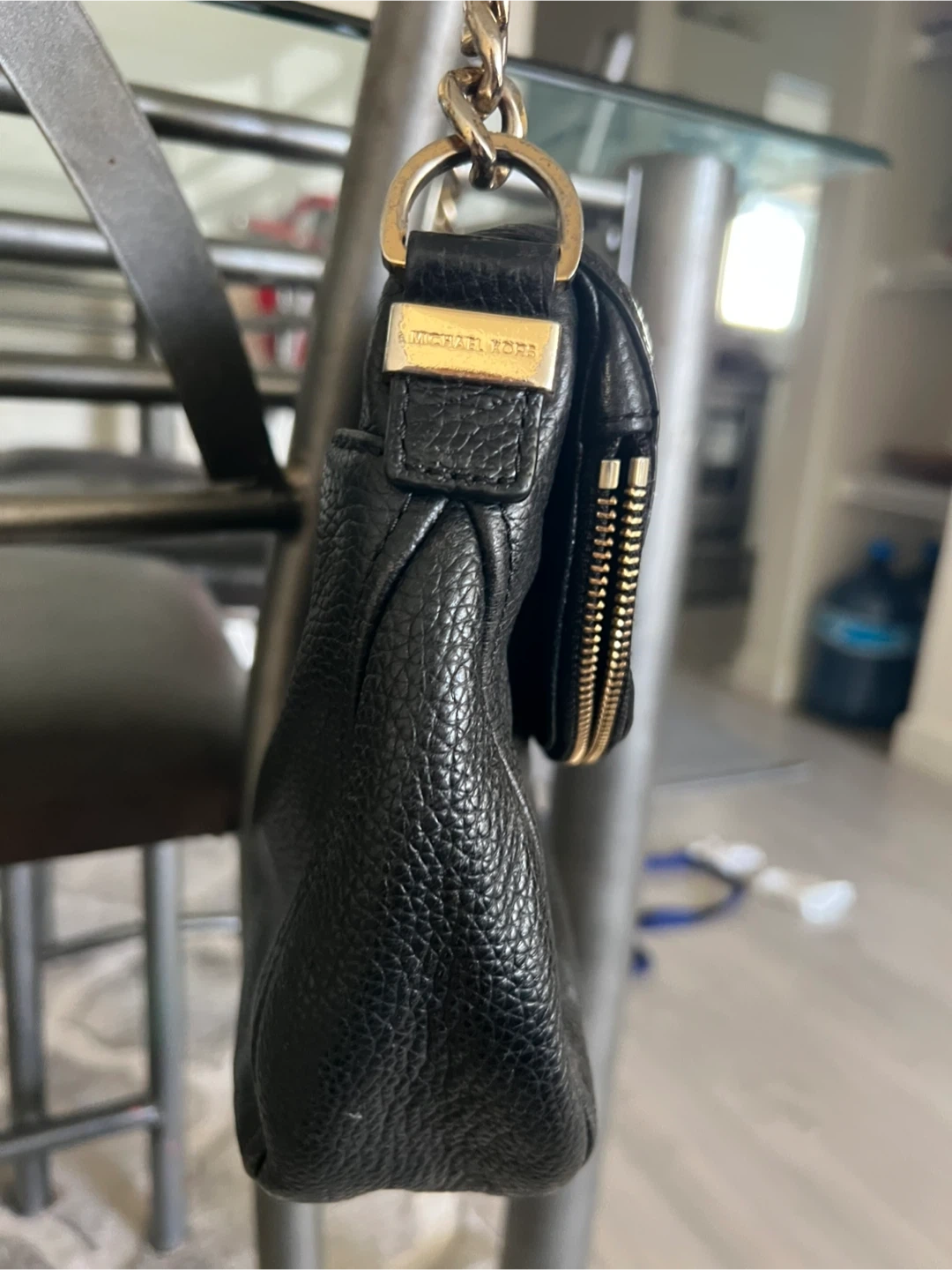 Selling a gently used Michael Kors black leather shoulder bag. It features a stylish chain strap and a convenient zip pocket. Perfect for everyday use!