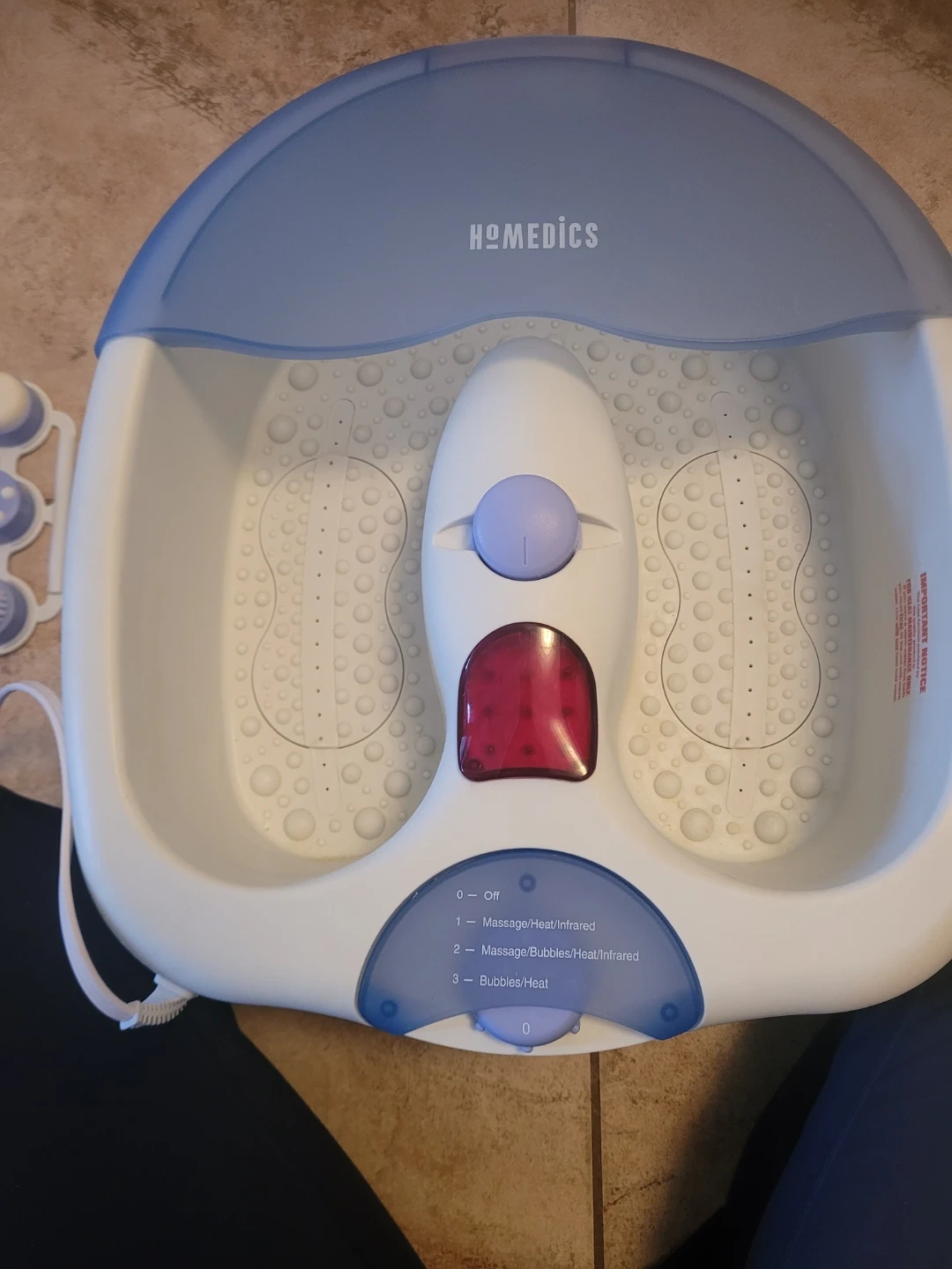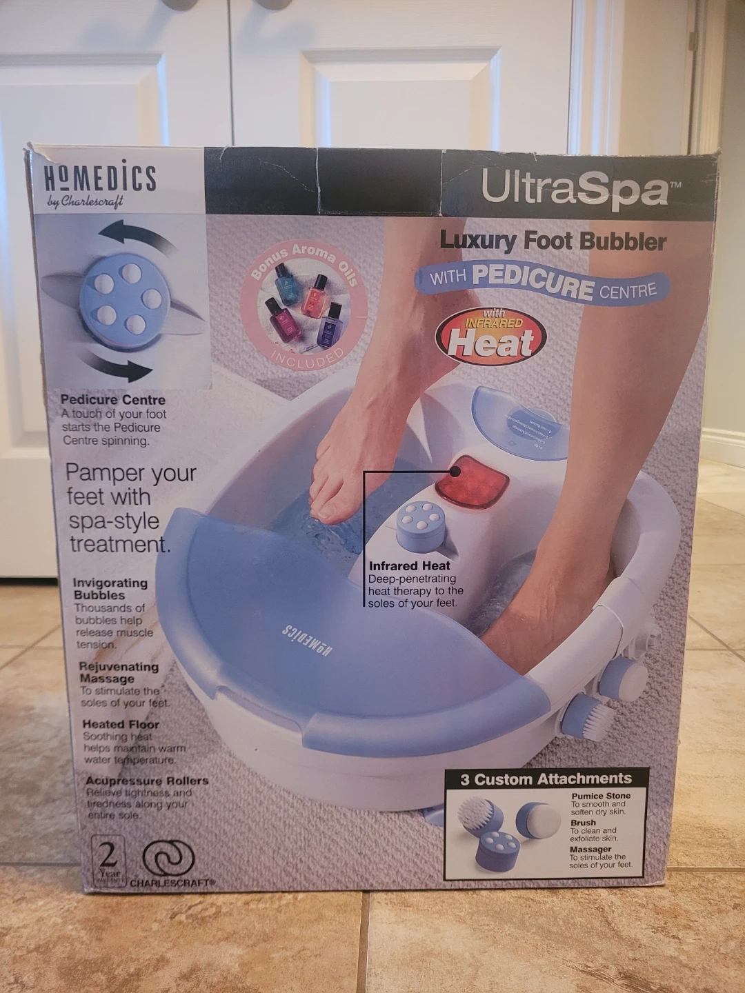 Treat your feet with the HoMedics UltraSpa Luxury Foot Bubbler! It has infrared heat, invigorating bubbles, and a pedicure centre. It also comes with 3 custom attachments. The instruction manual and warranty information is also included!