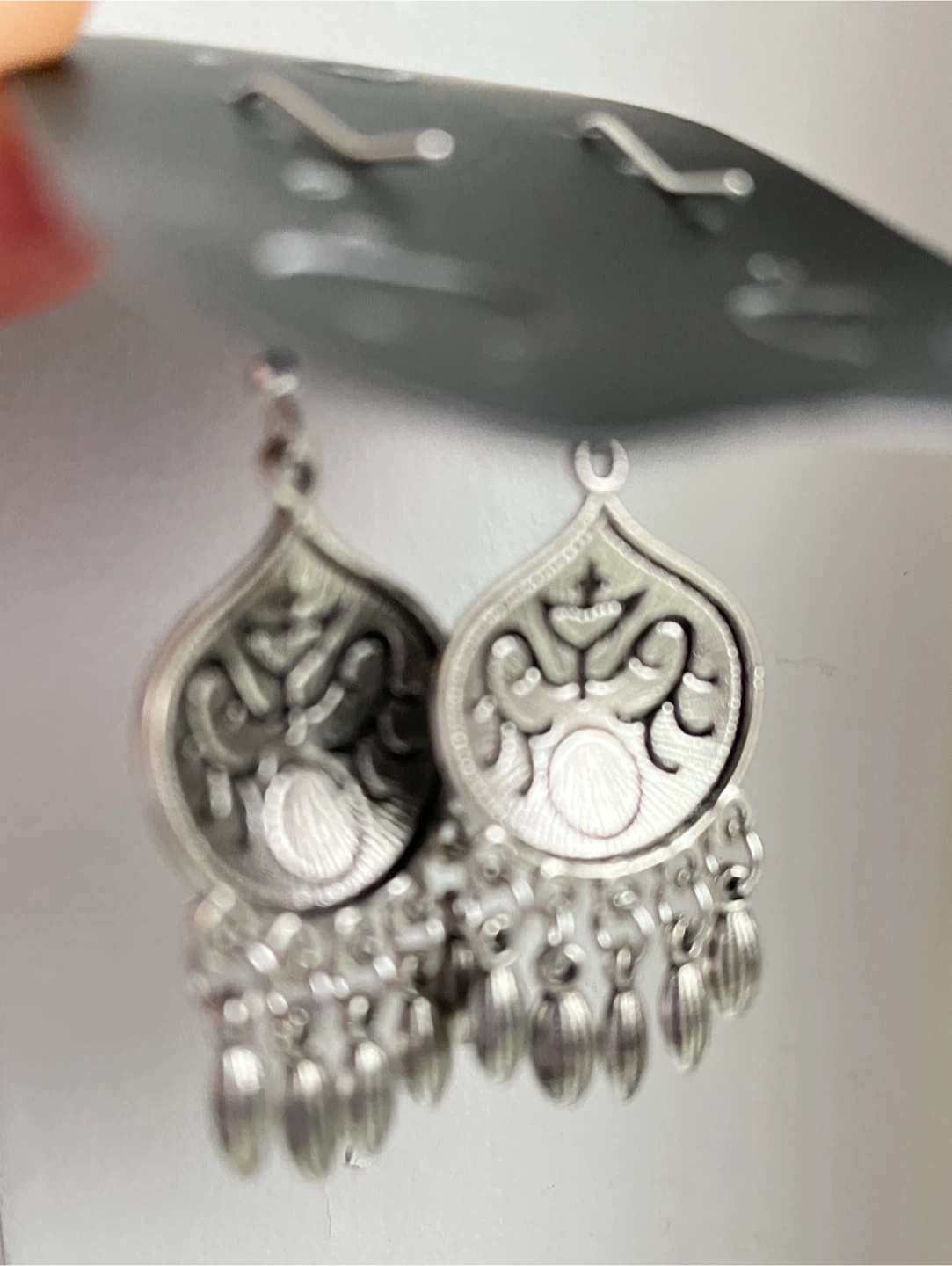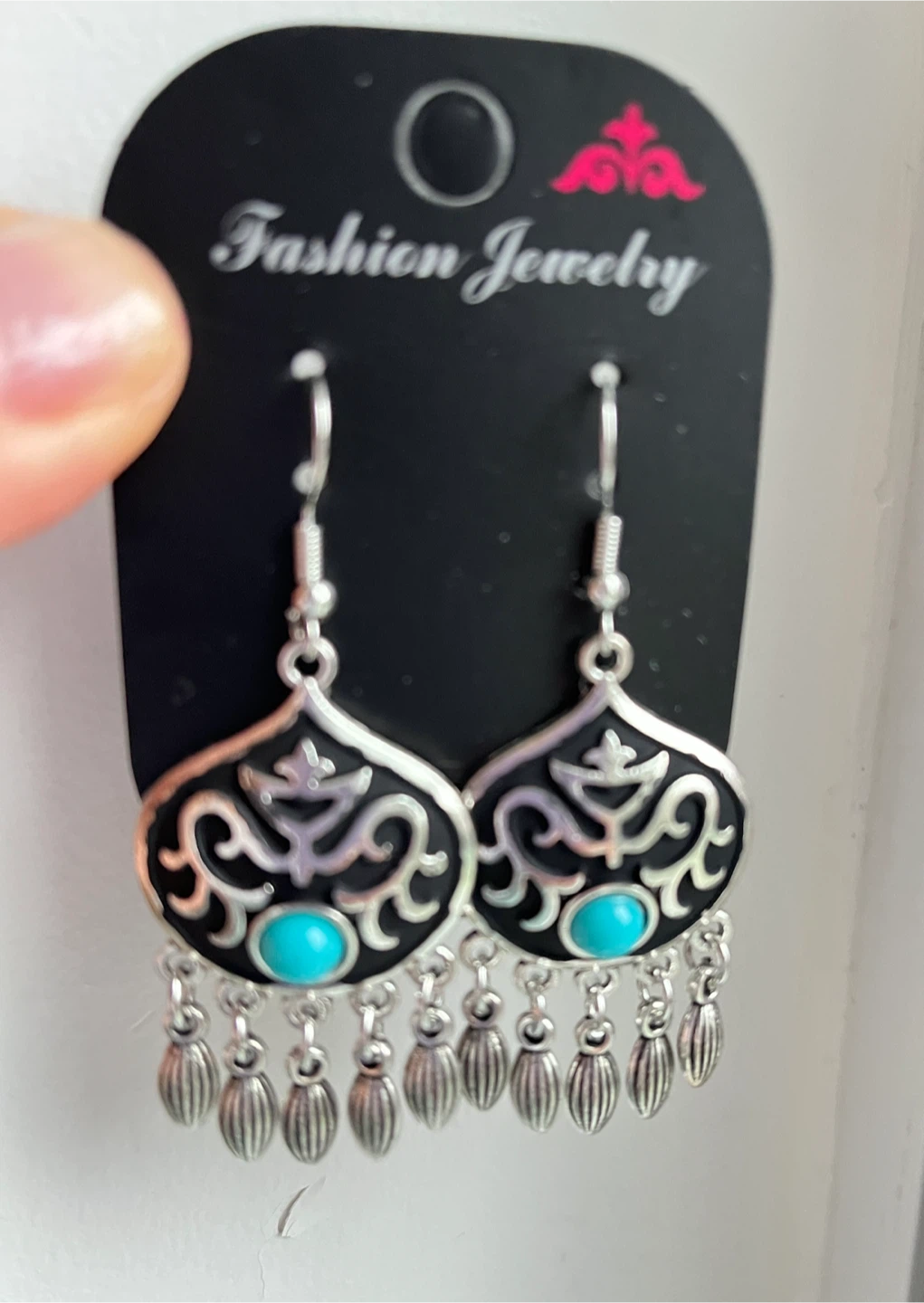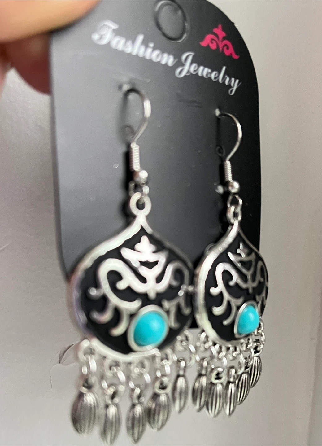 Here's a brand new pair of Fashion Jewelry earrings from Kazakhstan. They feature a silver-tone finish with a black and turquoise design.