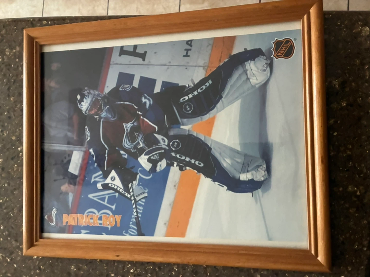 Selling a framed picture of Patrick Roy in his hockey gear. It features the NHL logo and would be great for any hockey fan's collection