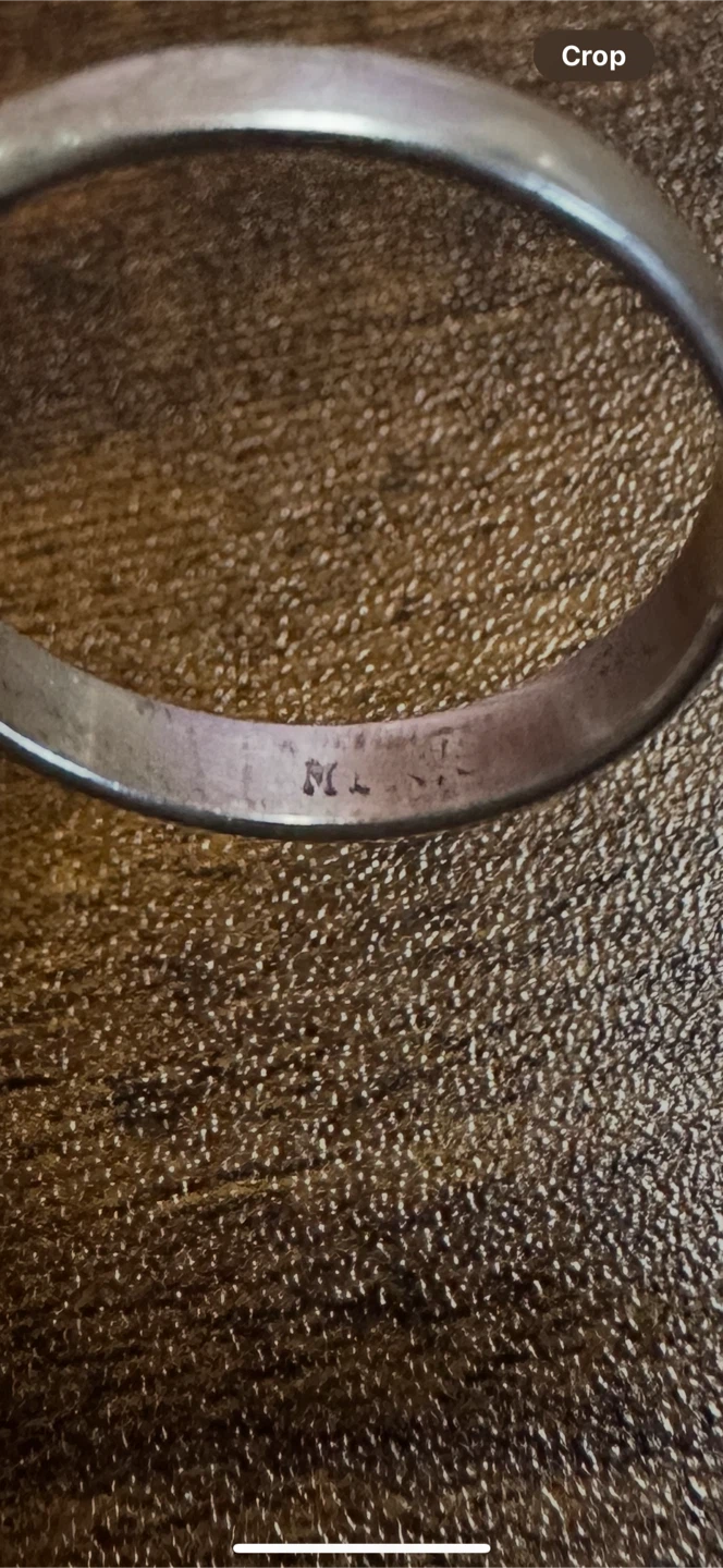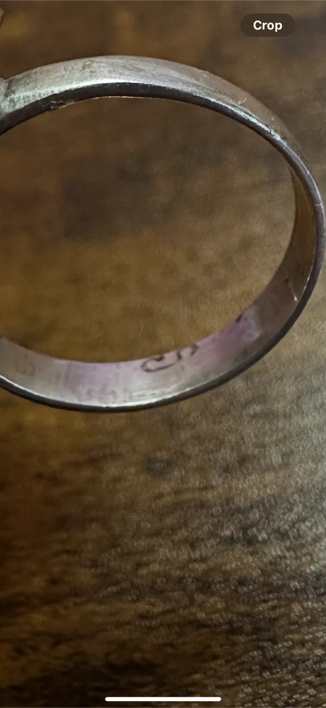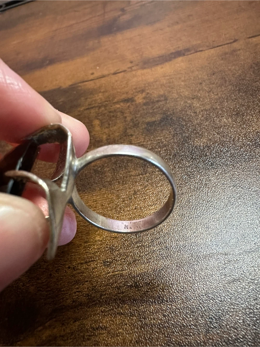 This is a difficult piece because while there is a clear stamp inside the band, I can’t make out what it says. The ring belonged to my husband’s grandmother so I don’t know its history. Because of that, I can’t guarantee that it’s silver but I’m pretty sure it is.