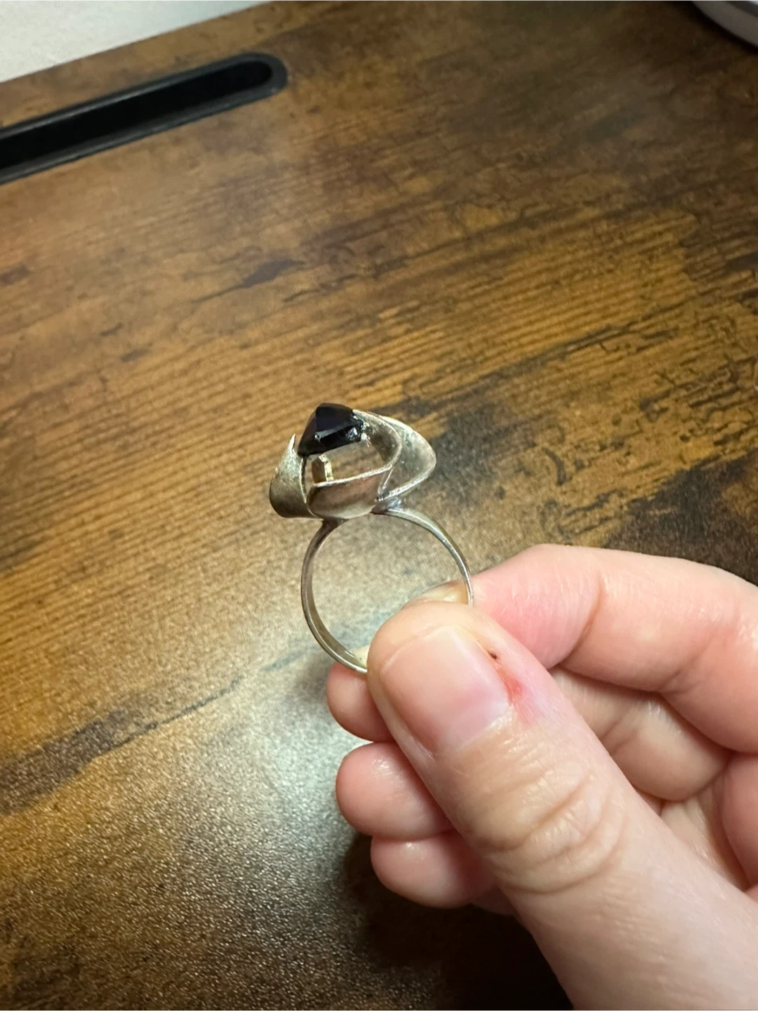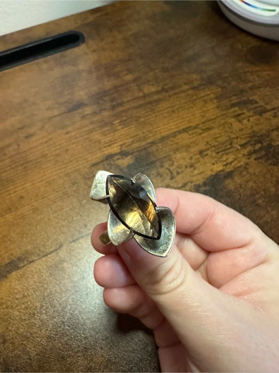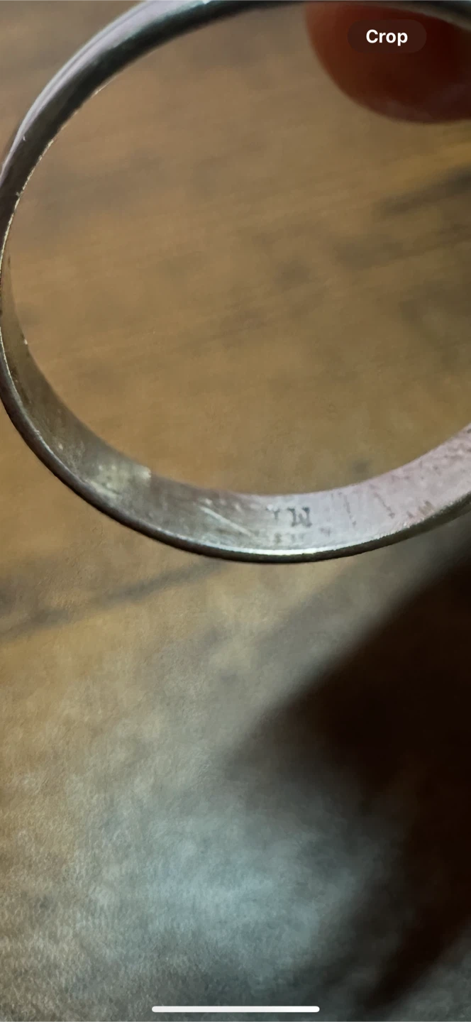 This is a difficult piece because while there is a clear stamp inside the band, I can’t make out what it says. The ring belonged to my husband’s grandmother so I don’t know its history. Because of that, I can’t guarantee that it’s silver but I’m pretty sure it is.