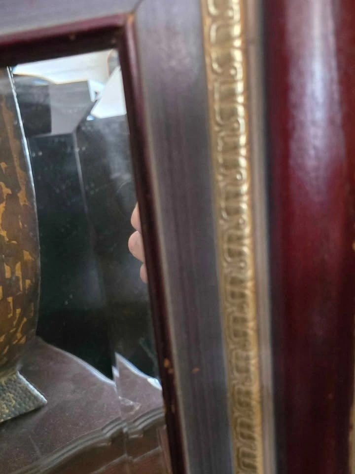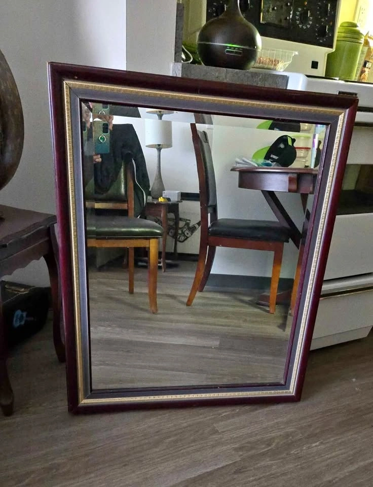 Dark wood and gold ornate decorative frame, quality beveled mirror. Good condition with slight wear on corner as seen. 24" x 36" Heavy, secure and ready to hang. PU Sherwood Park near Henday/Wye rd or can meetup