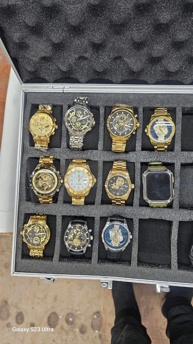 Selling a collection of assorted men's watches in a display case. The watches feature various designs and colors, primarily gold and silver tones. The case is includedThey are also sold individually or as a complete set.