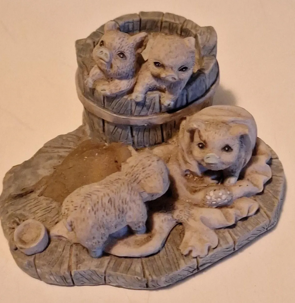 Selling a cute pig figurine! It features several little pigs around a bucket. It's in good condition and would make a great addition to any collection