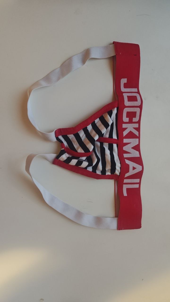 Jockmail jockstrap, size Medium. Supportive elastic waistband with breathable striped pouch. Good condition overall, no damage.