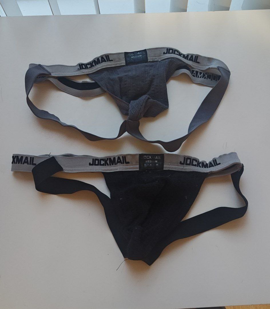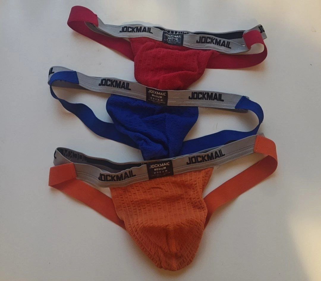 Jockmail jockstraps, size Medium. Multiple colors/styles included (red, blue, orange, grey, black). Supportive elastic waistband, comfortable fit, good stretch remaining. Fairly used but clean and fully functional. Washed and ready to wear.