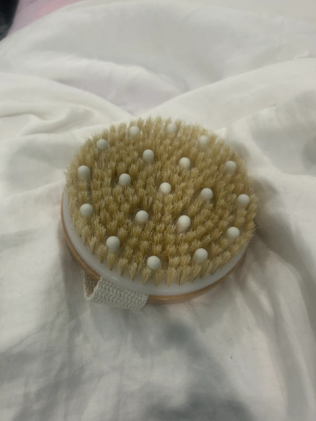 Selling a body brush, perfect for exfoliating! It has bristles with little white massage beads and a hand strap on the back for easy grip. Brand new, never used.